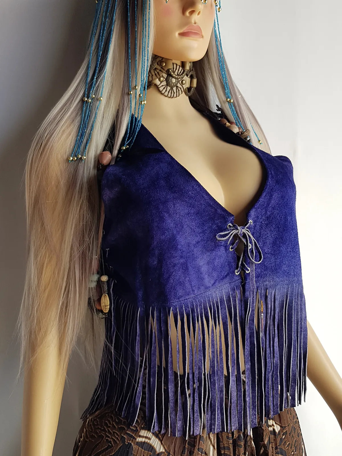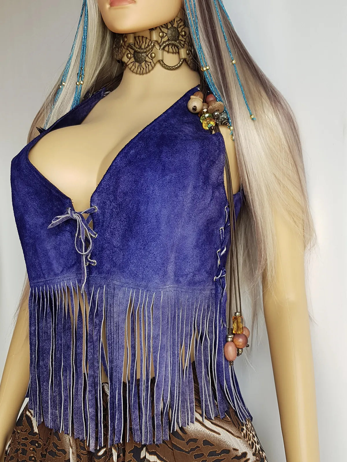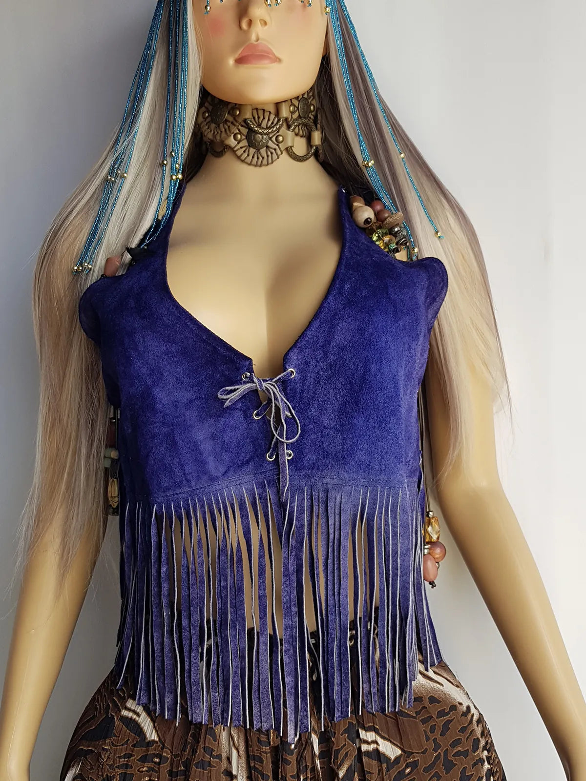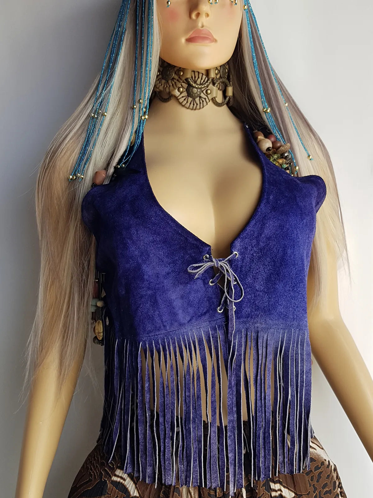 1970s Inky Blue Aged & Faded Soft Suede Tassel Vest -Buttery Soft - Ties at the Front & sides