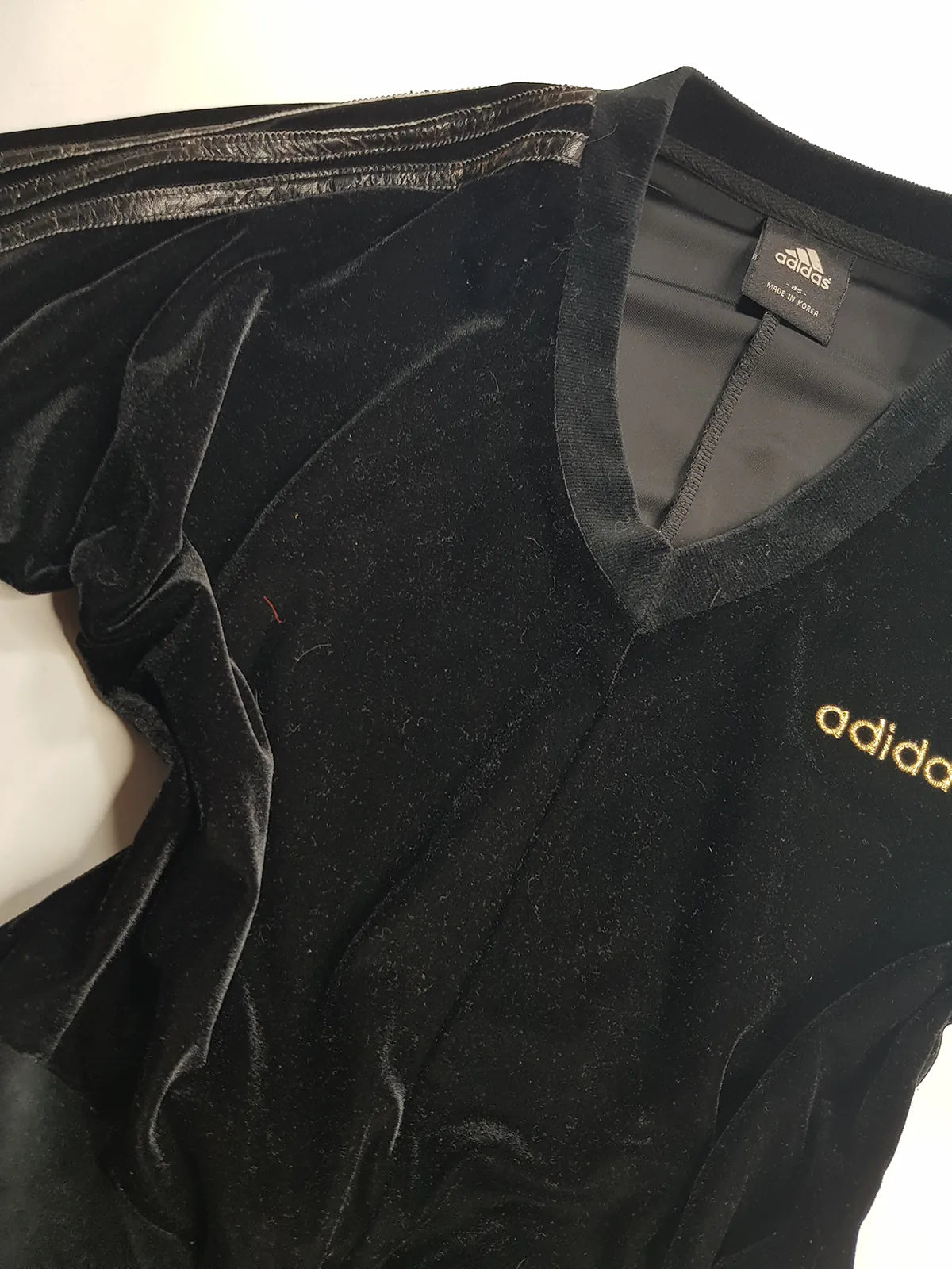 1990s Authentic Adidas Velour Sexy Pilates Princess Vintage Black & Gold Cropped Top - Super Soft & Dreamy Feel - Embroidered Adidas- Leather Striping Shoulder Features