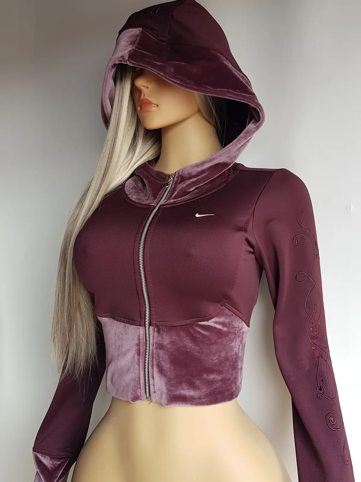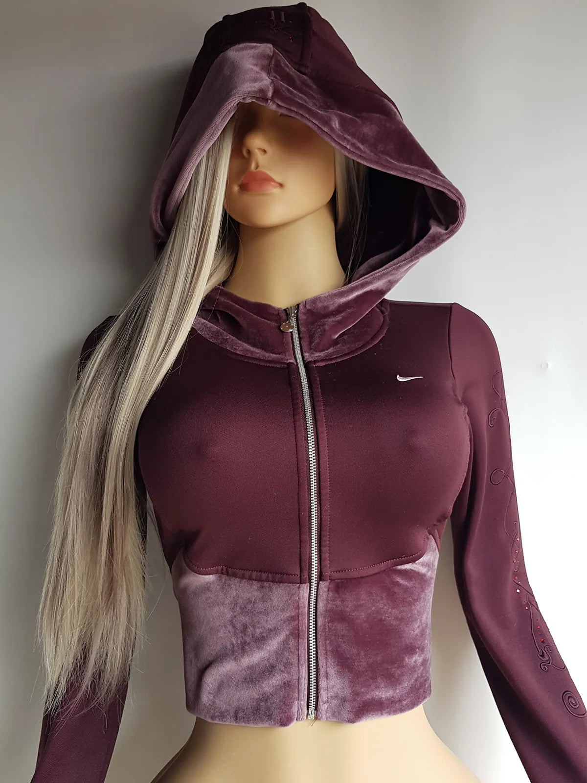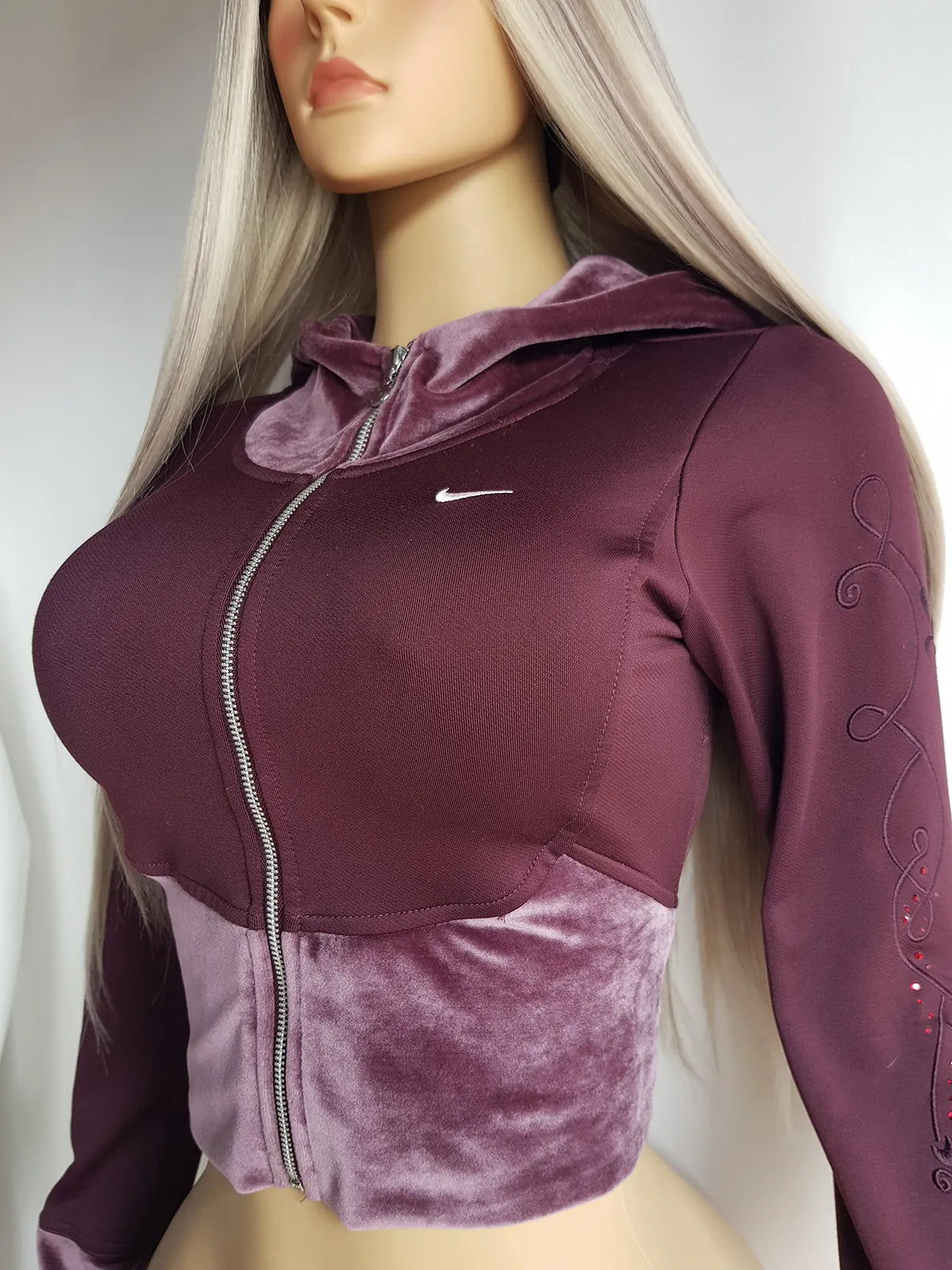2000s Authentic Nike Velour Sexy Pilates Princess Vintage Hooded Purple Cropped Zip Jacket with Embroidery & Rhinestones
