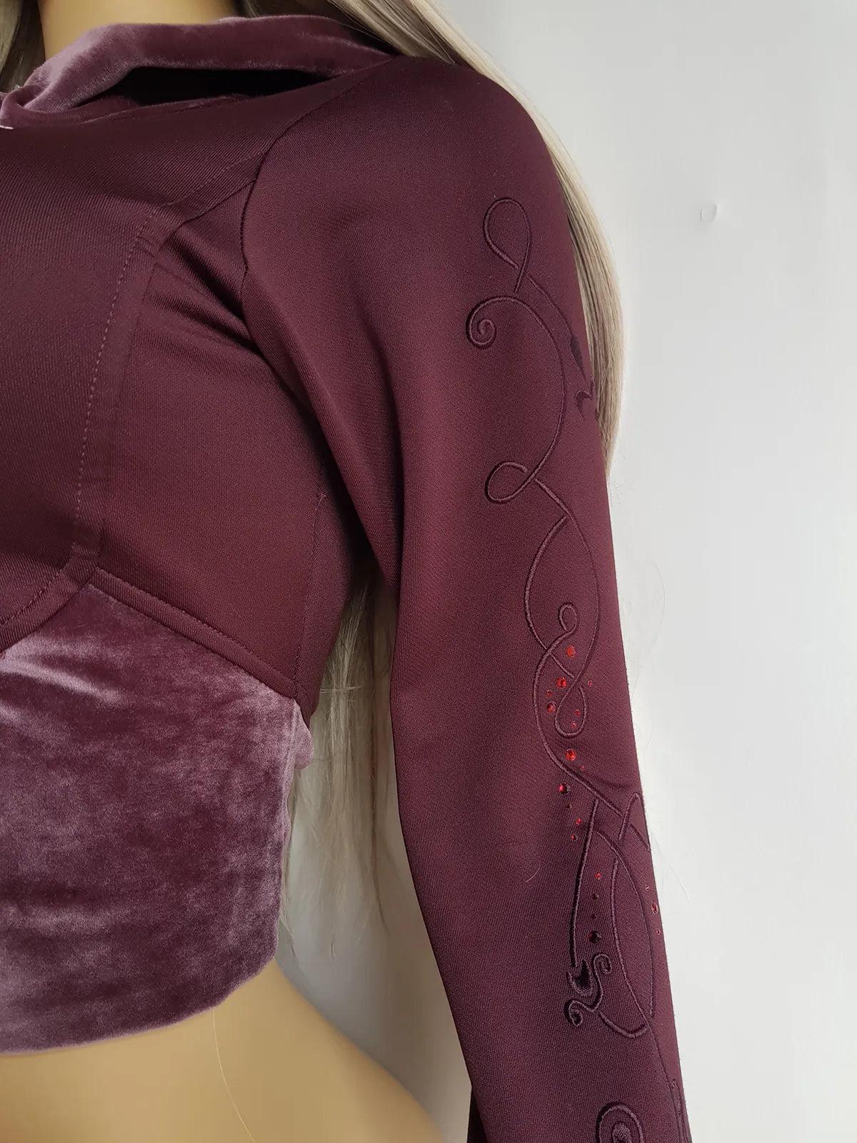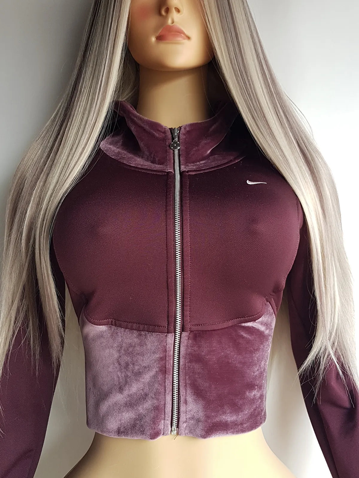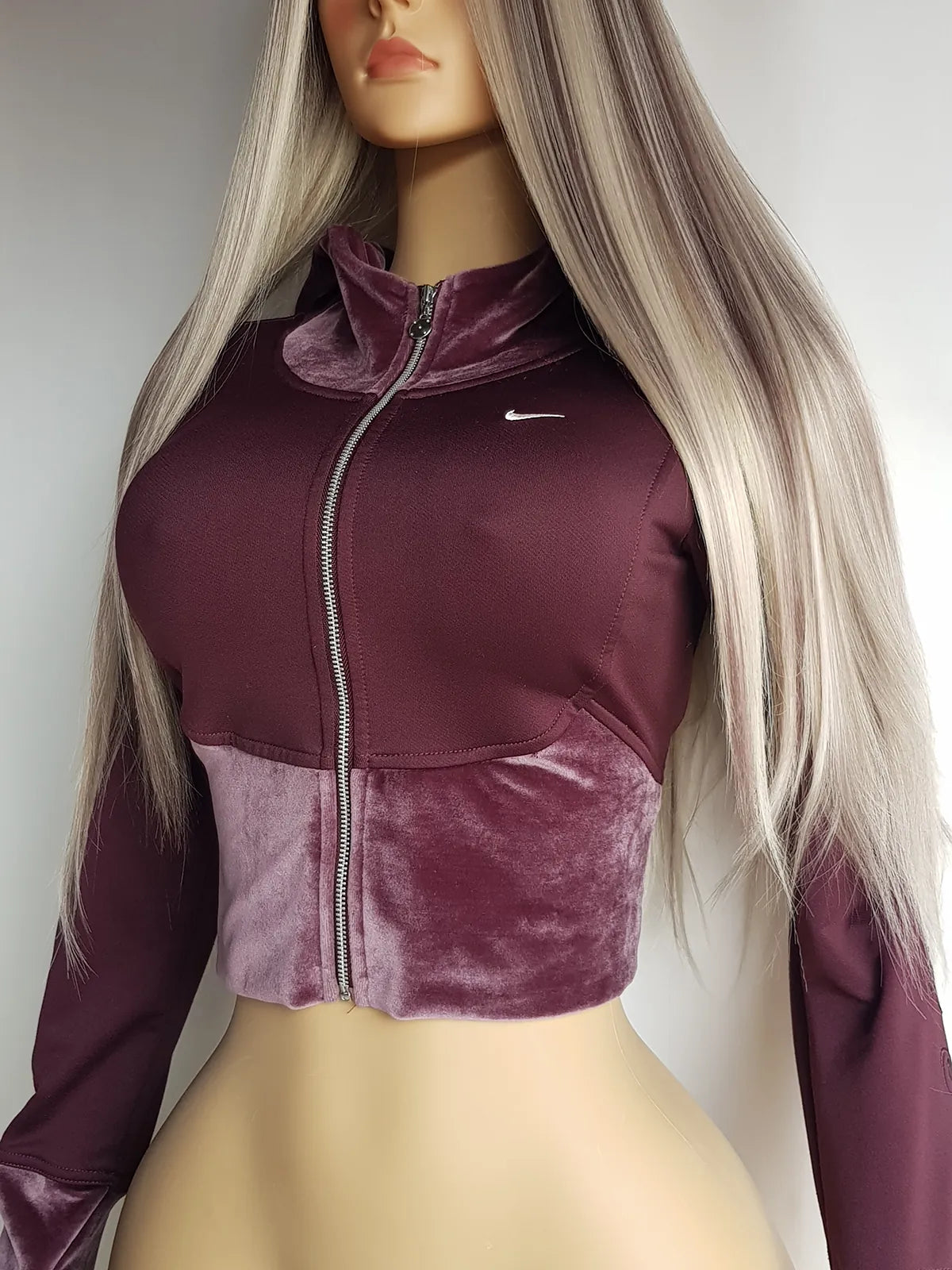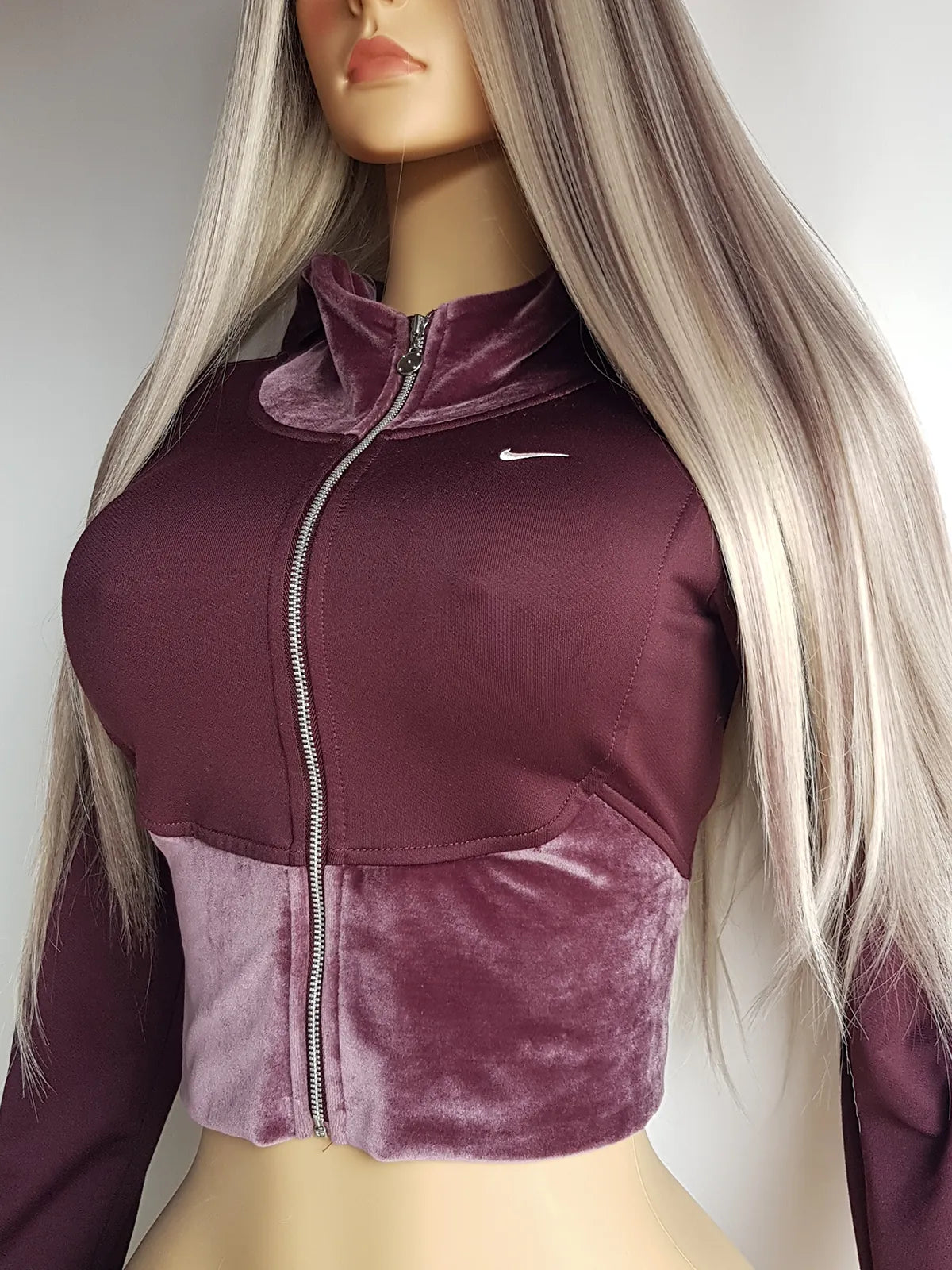 2000s Authentic Nike Velour Sexy Pilates Princess Vintage Hooded Purple Cropped Zip Jacket with Embroidery & Rhinestones