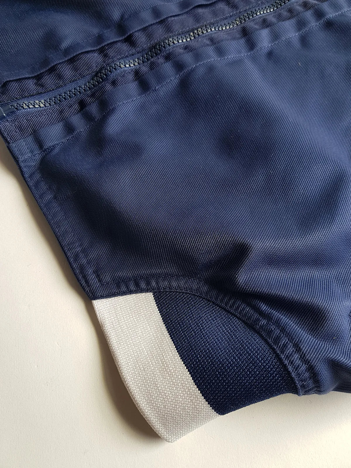 1990s Vintage Authentic Nike Workwear Vibes - Bomber Style Track Jacket - Navy & Vintage White - Silver Hardware & Big Chunky Metal Zip - Embroidered Nike on the Chest - Elasticated Paneling on Neck Waist & Sleeves - Unworn Condition - Unisex Fit