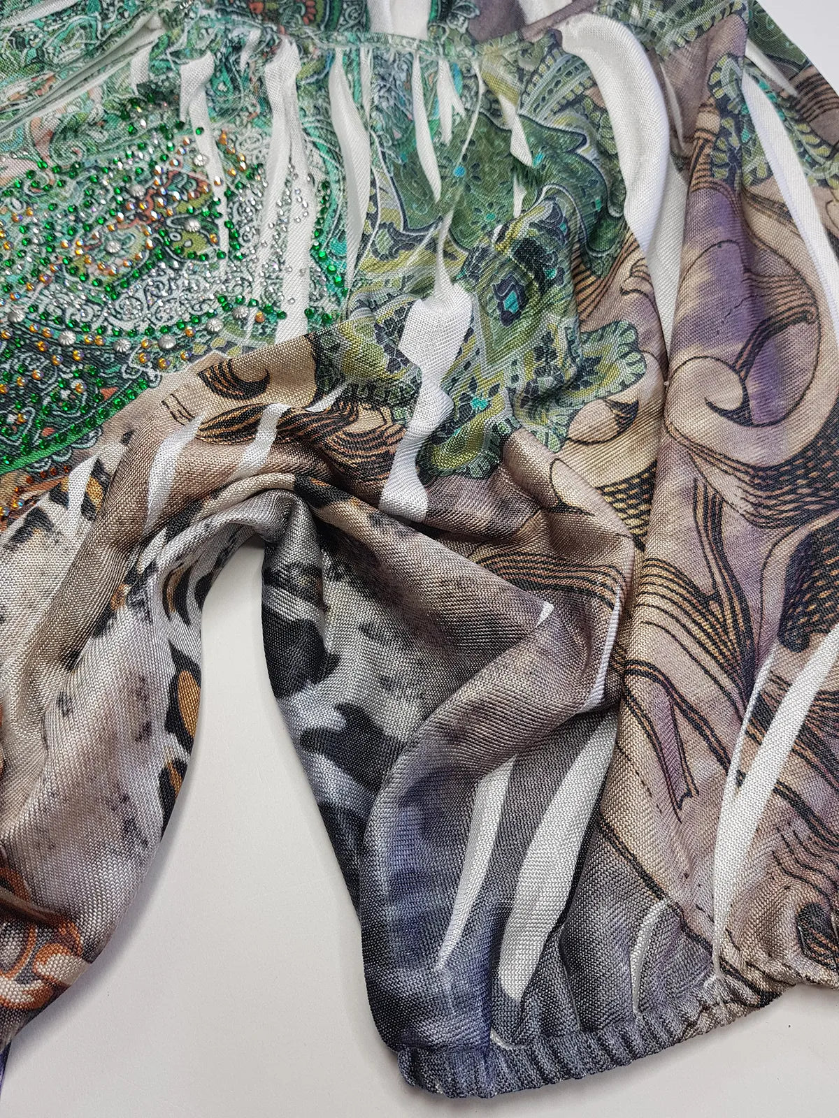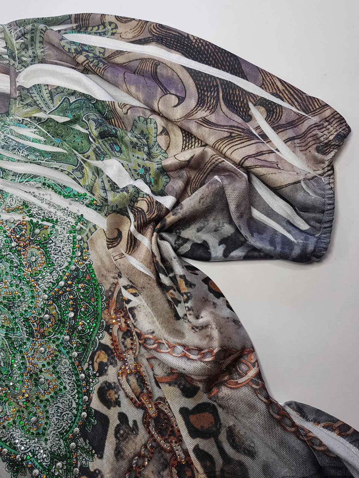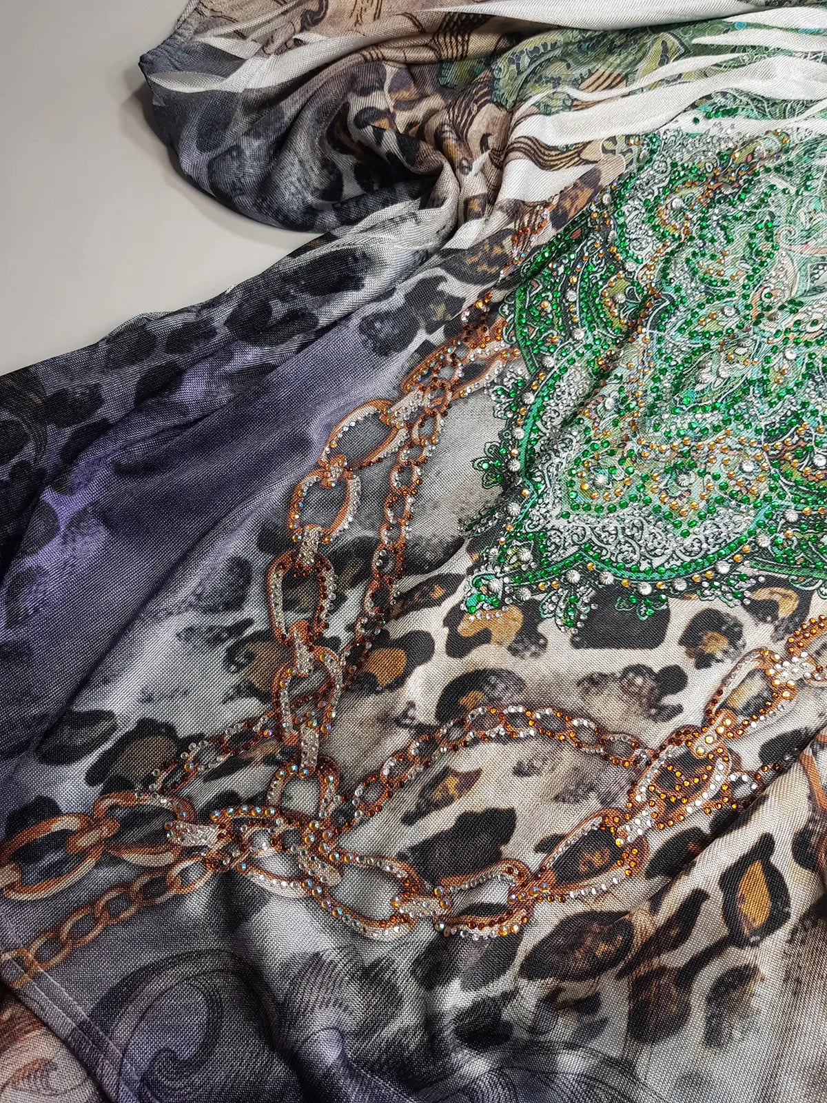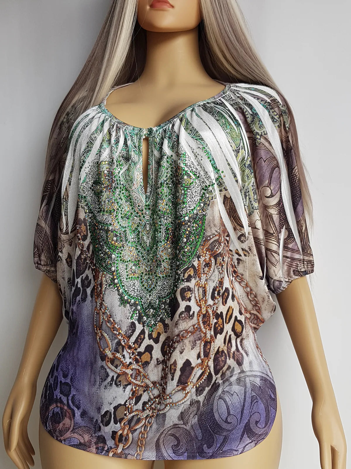 2000s Bohemian Draped Rhinestone top with Iconic Nostalgia Boho Print in Leopard & Chains - Perfect Shape