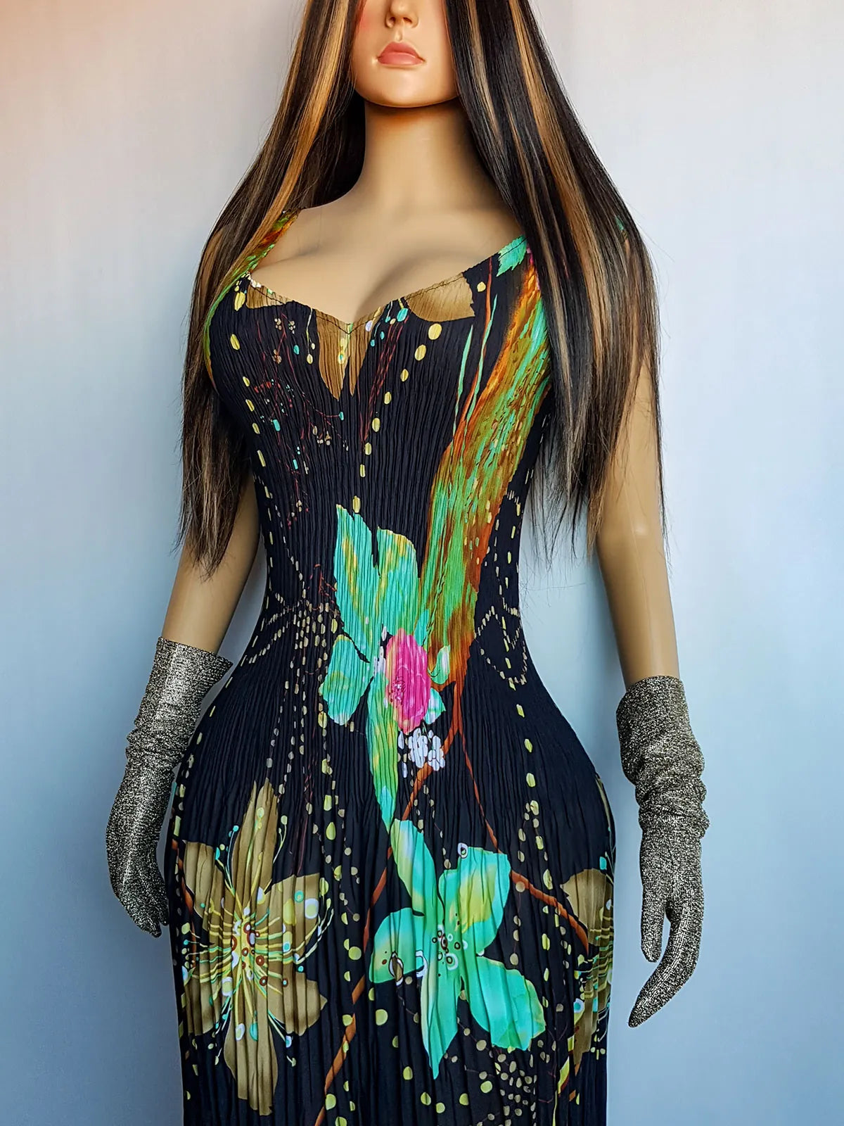 2000s Incredible Resortwear Piece - Pleated Curve Hugging Summer Dress with Deep V & Punchy Tropical Print