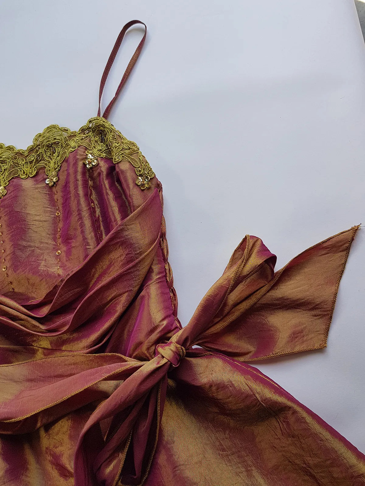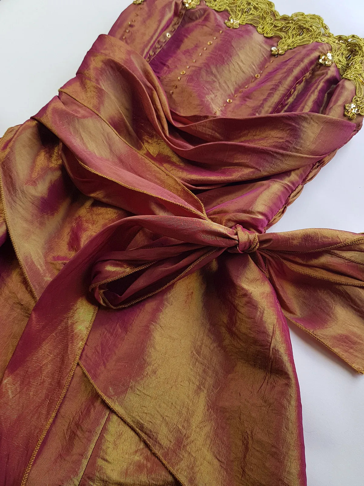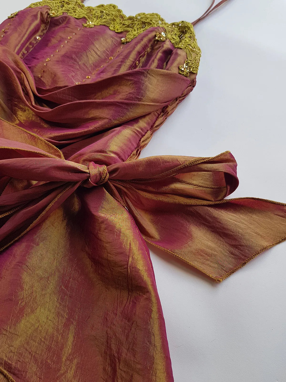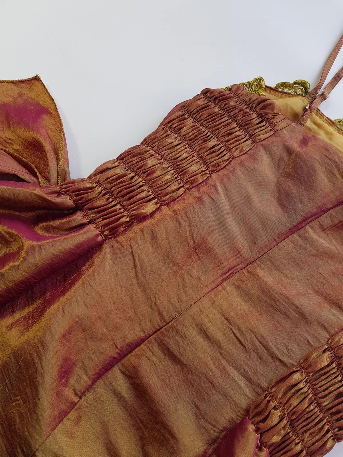 2000s Whimsical Iridescent Fairy Dress in Colour Changing Rose Gold - Hand Beaded - Multi Tier Dress - Applique Lace in Gold - Shirred Detailing