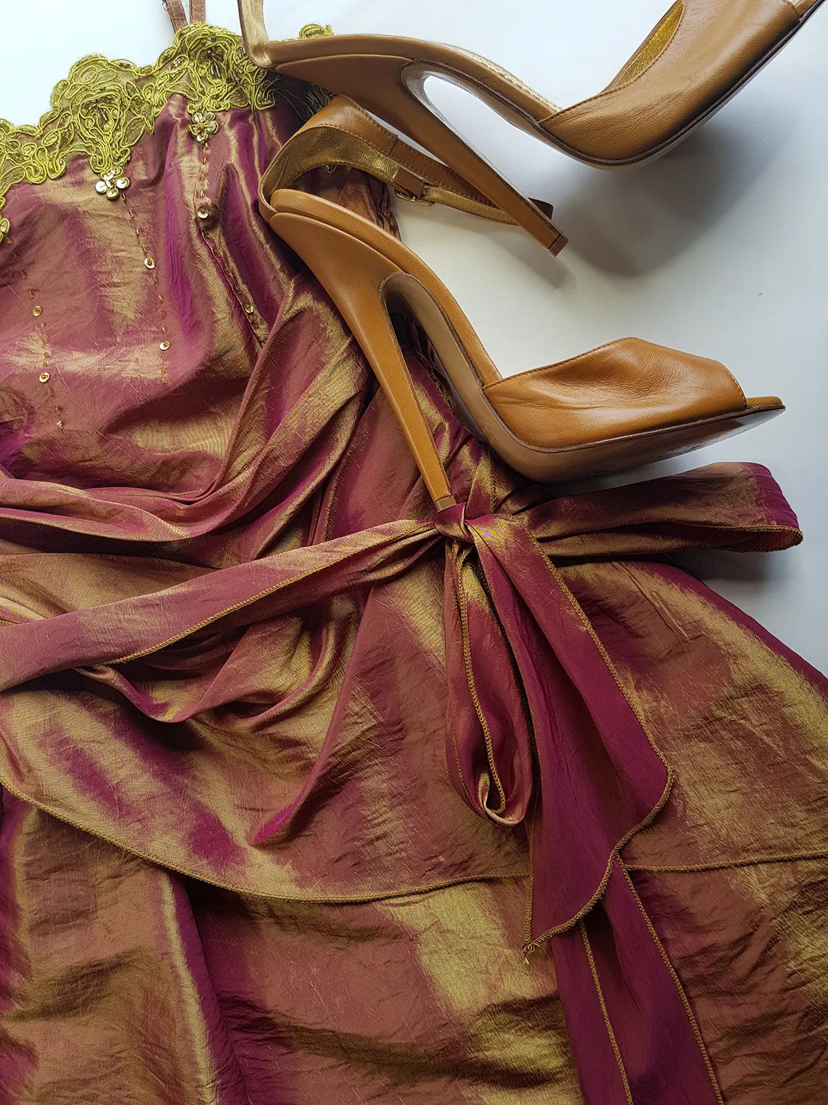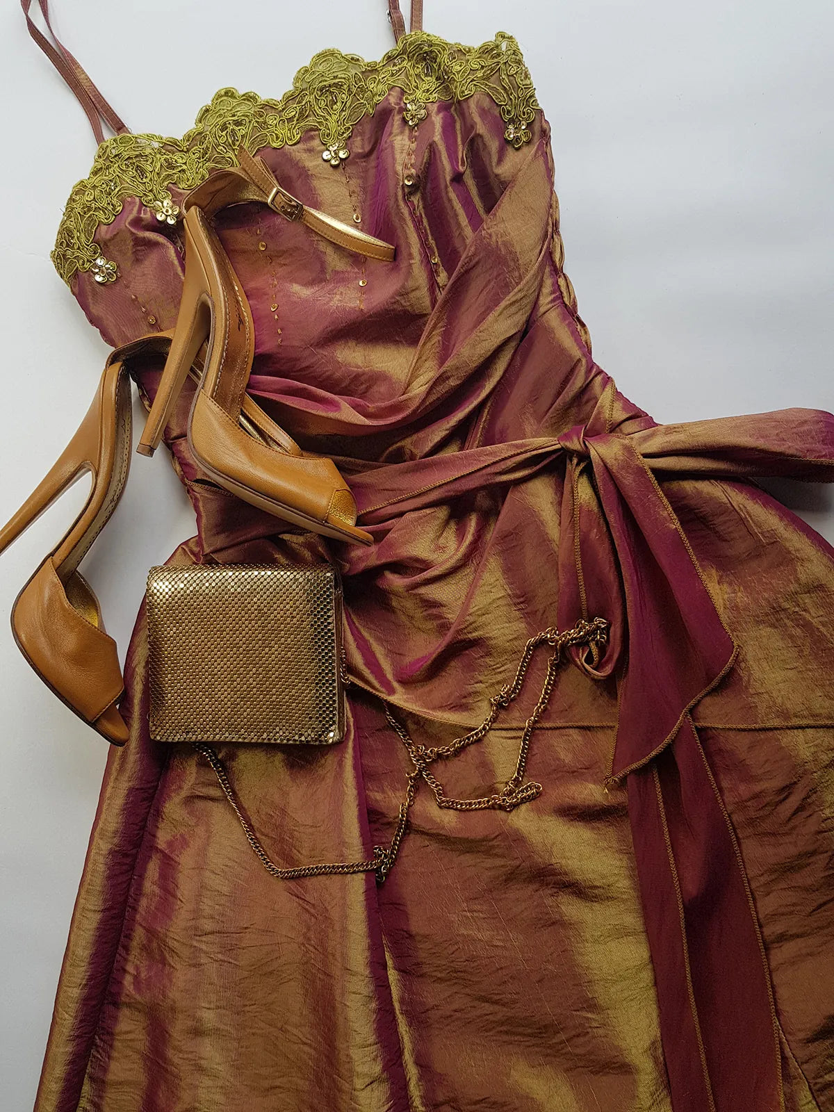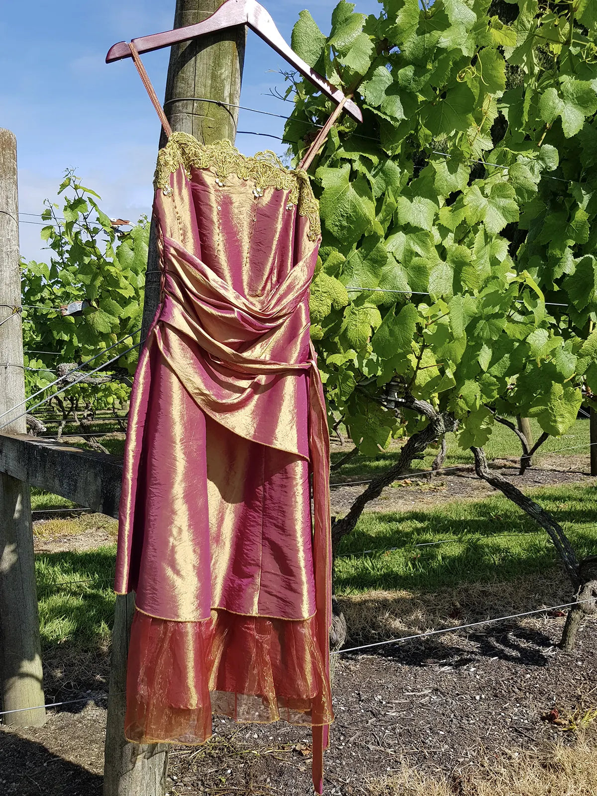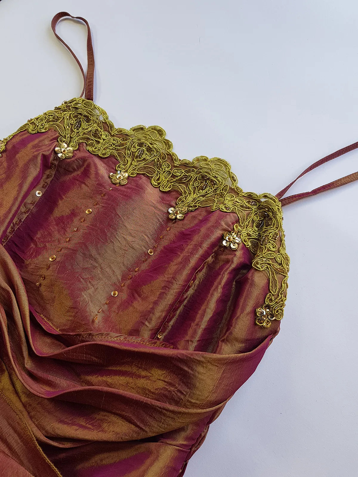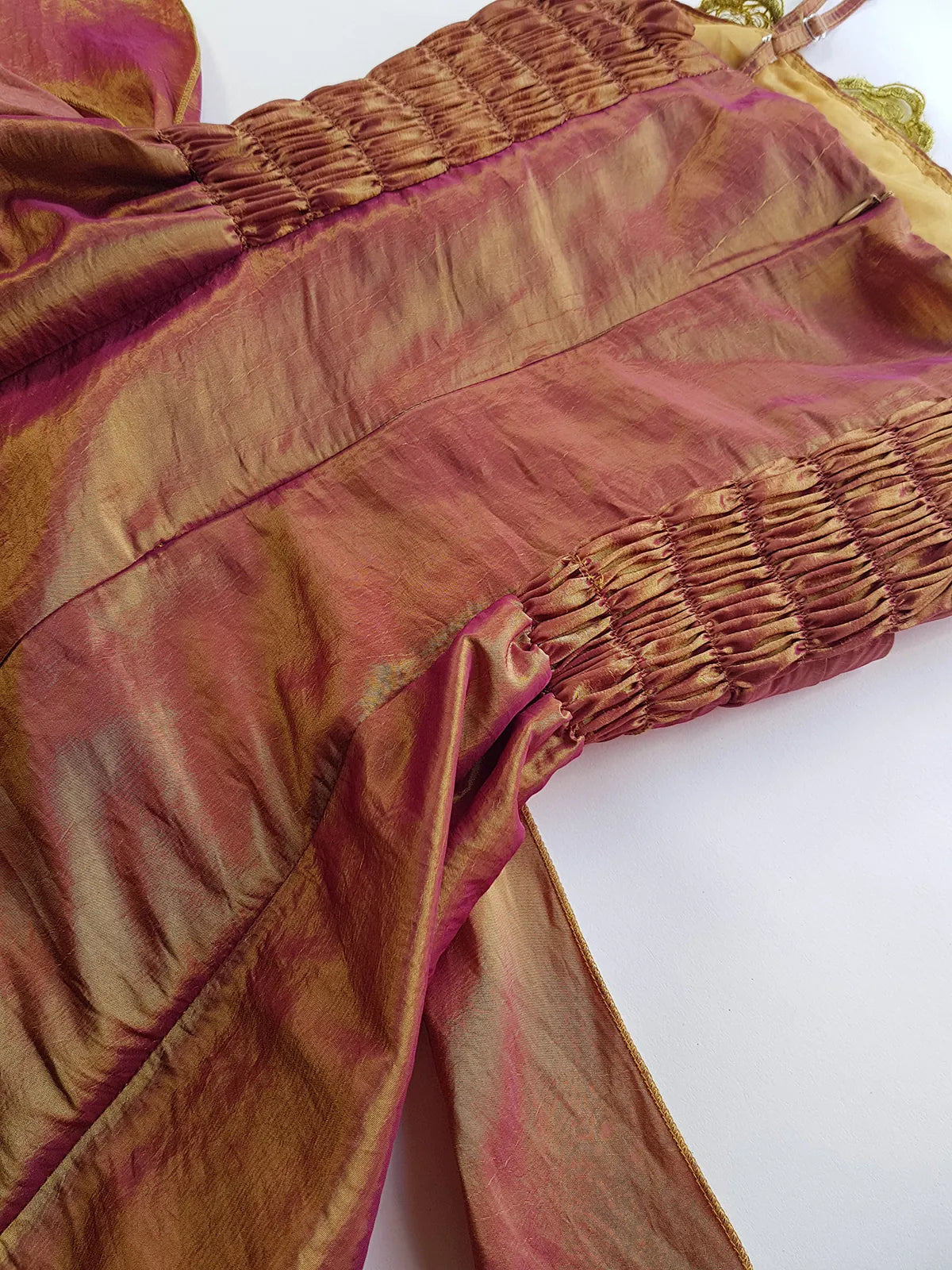 2000s Whimsical Iridescent Fairy Dress in Colour Changing Rose Gold - Hand Beaded - Multi Tier Dress - Applique Lace in Gold - Shirred Detailing