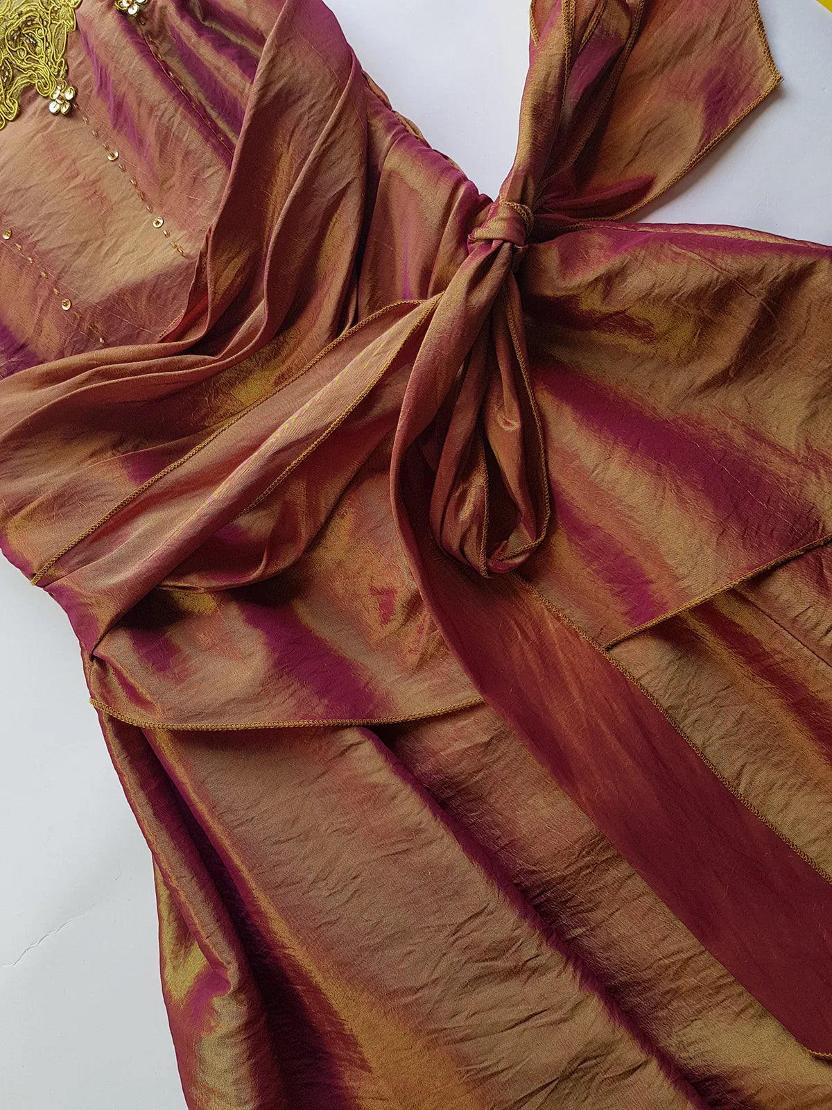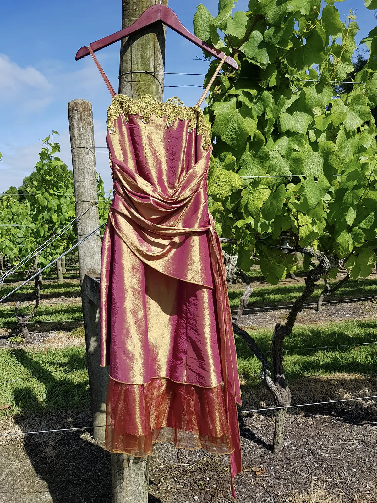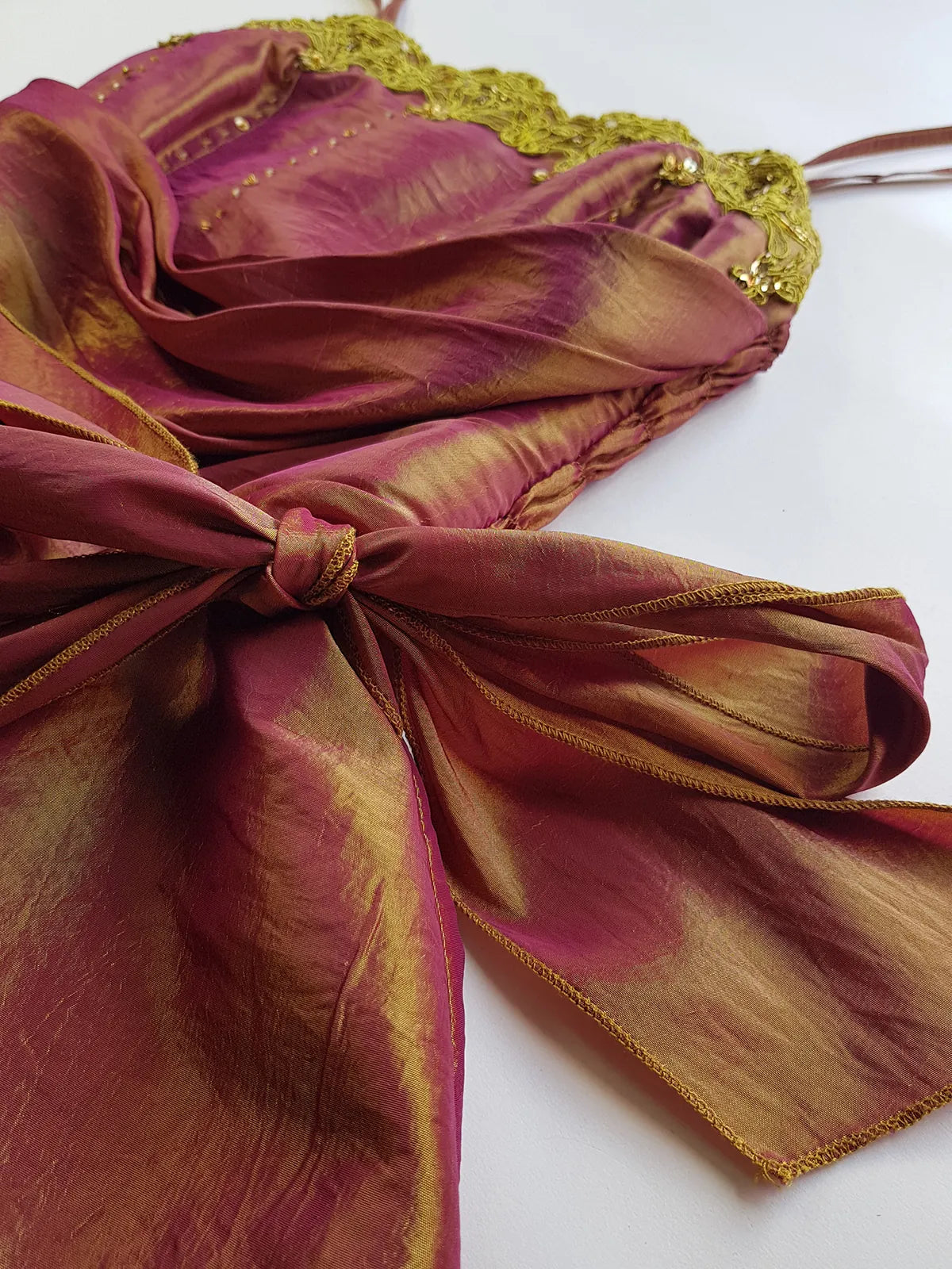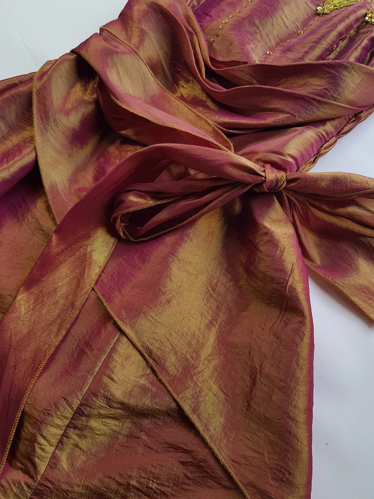 2000s Whimsical Iridescent Fairy Dress in Colour Changing Rose Gold - Hand Beaded - Multi Tier Dress - Applique Lace in Gold - Shirred Detailing