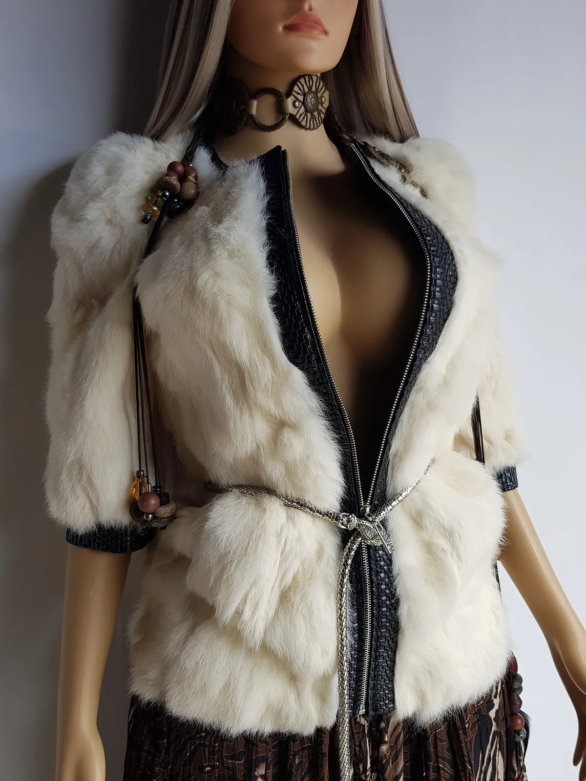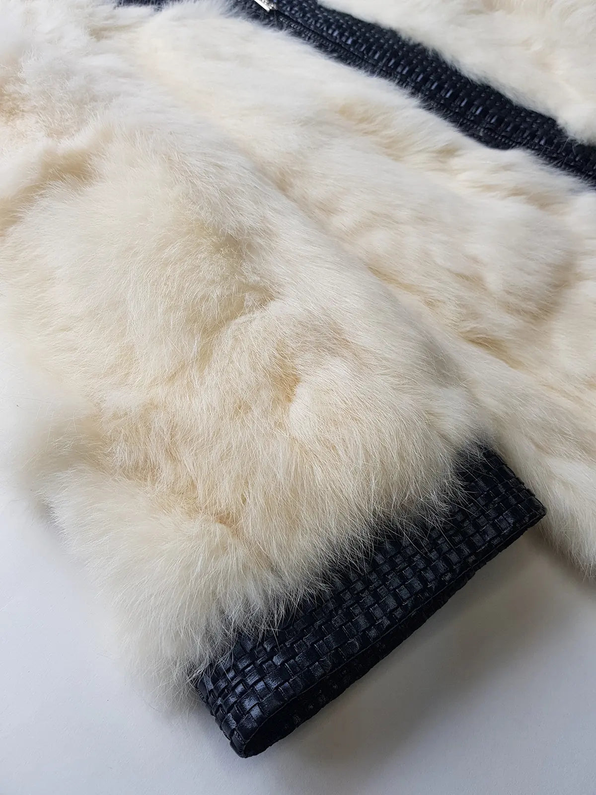 2000s Vintage Authentic White Rabbit Coat with Black Braided Leather Feature Detailing - Short Sleeves & fully lined