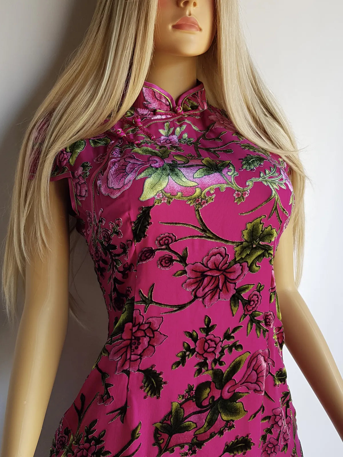 2000s Vintage Oriental Burnout Velvet Dress in Raspberry Pink & Green Florals - perfect for date night