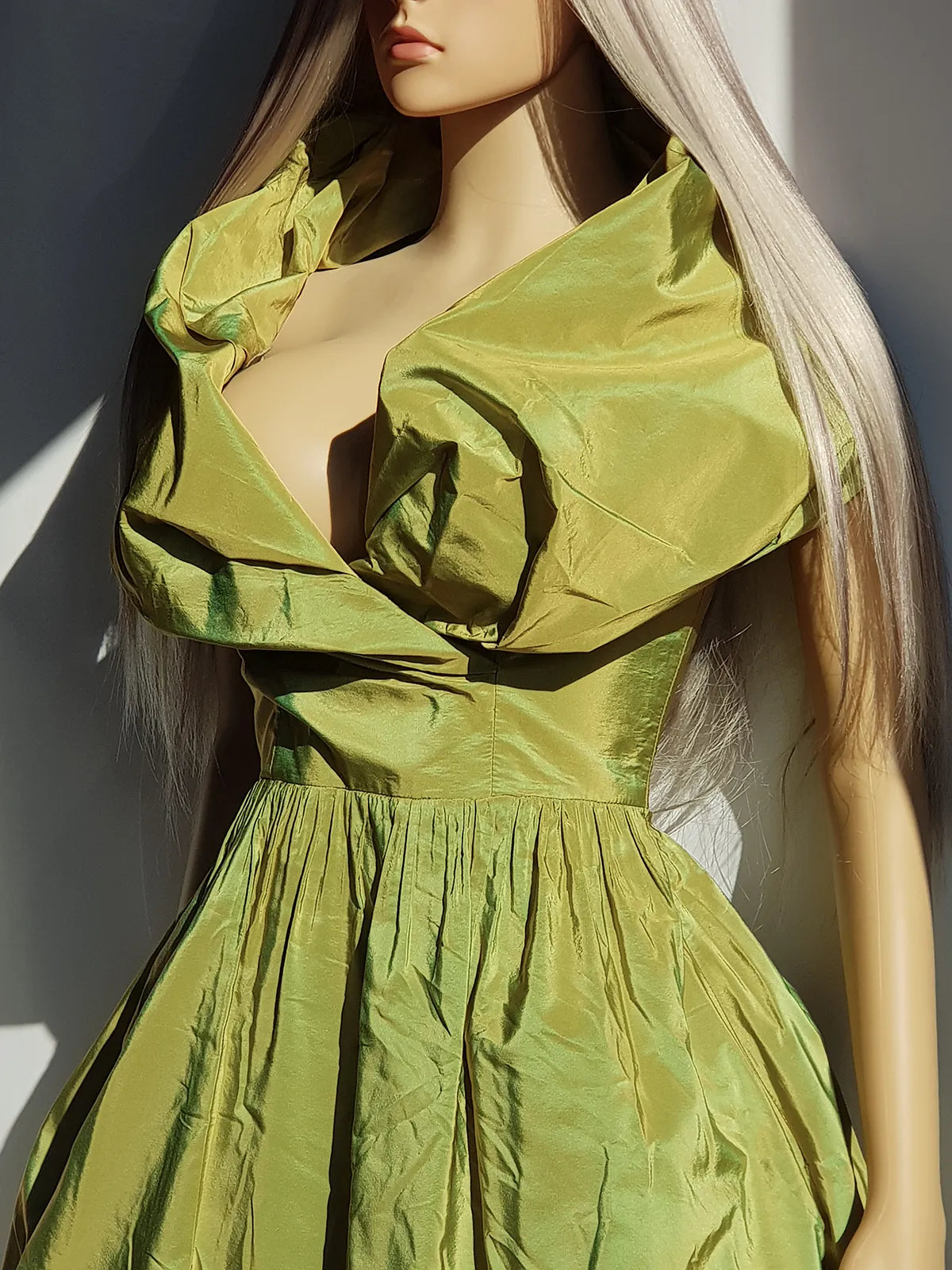 2000s Whimsical Iridescent Fairy Dress in Mystical Chartreuse Green - 50s Shape - Structural and Versatile neckline - wear multiple ways
