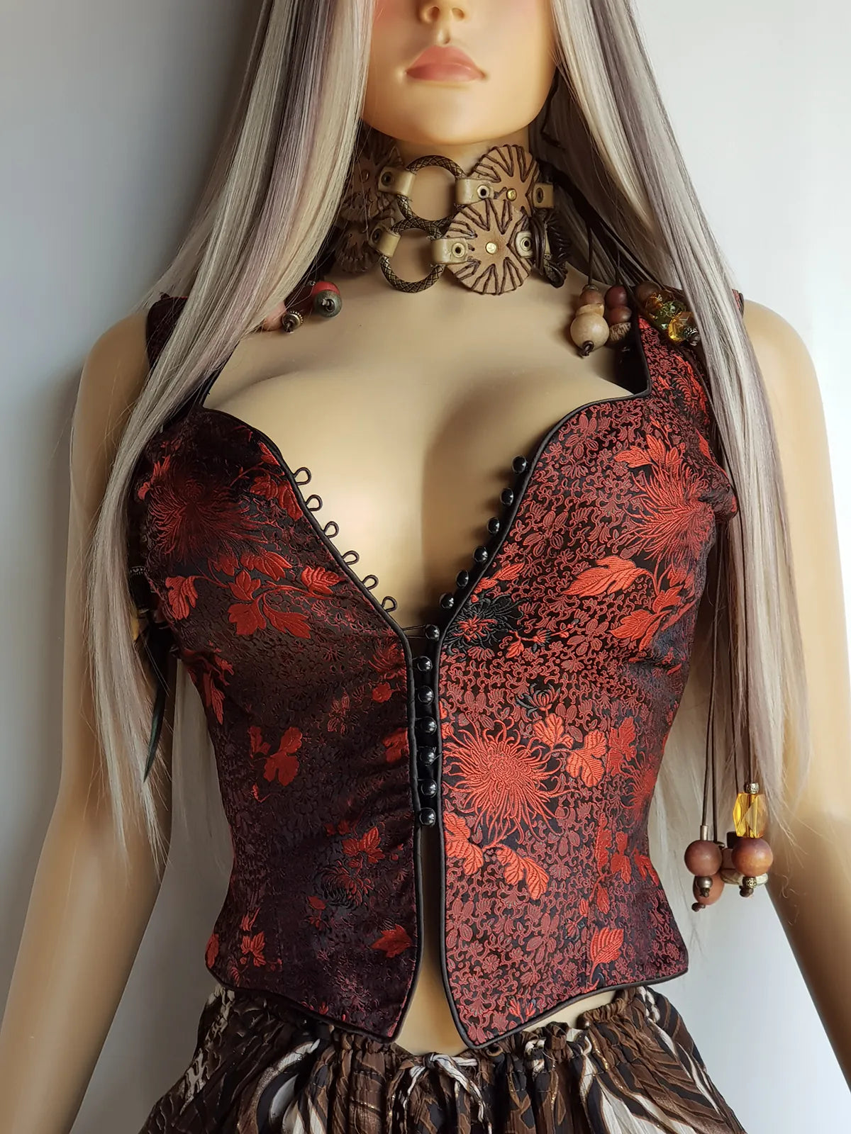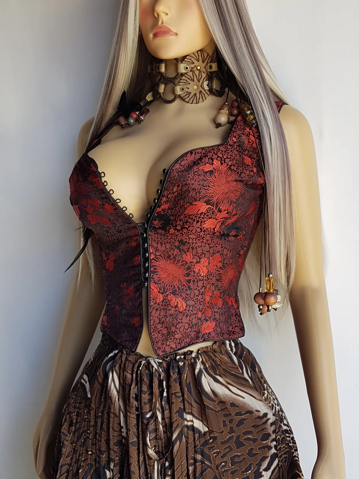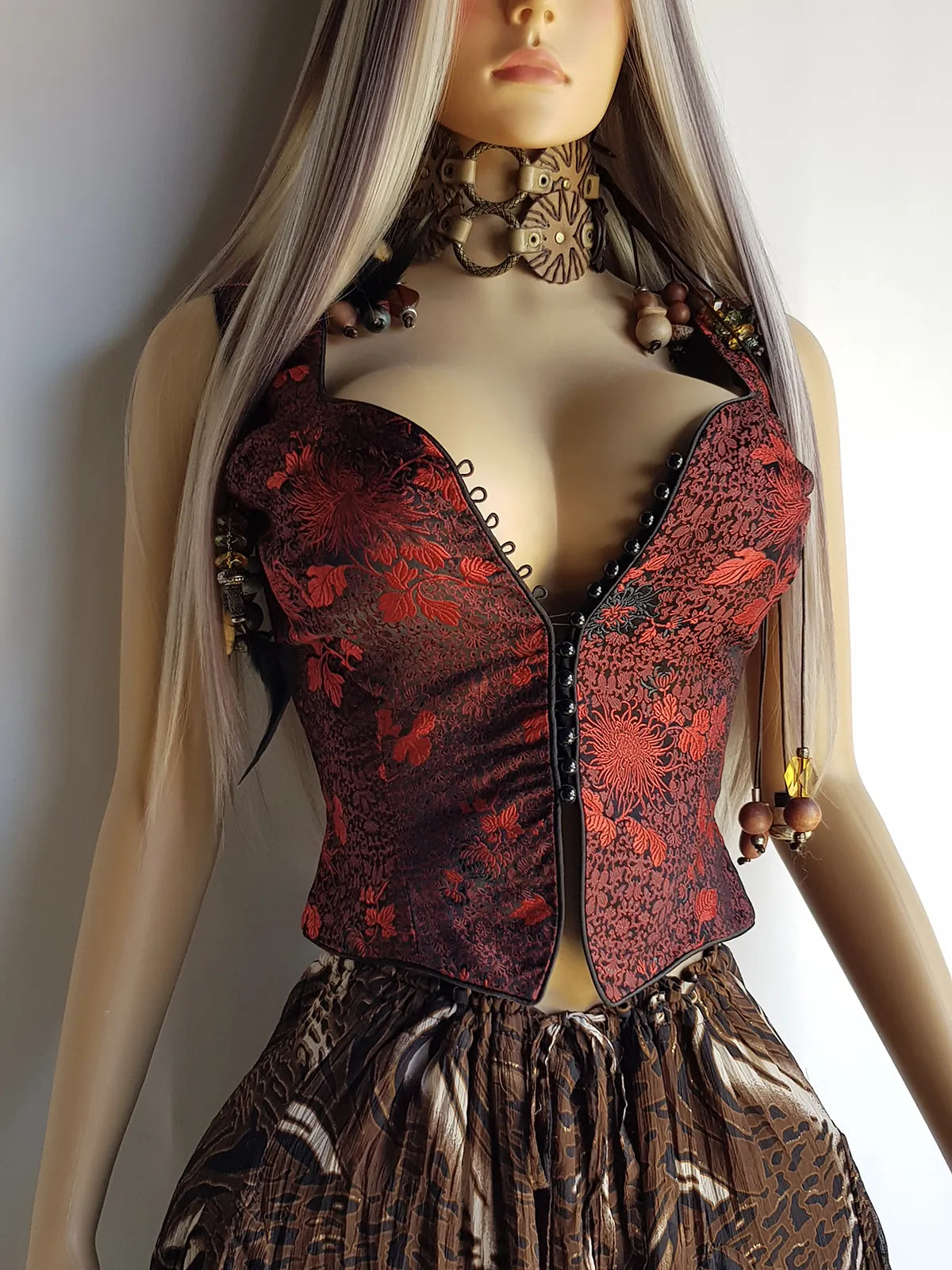 90s Brocade Corset top in Black with Vibrant Red - Impeccable Tailoring with Satin Edging & Buttons up the front - Incredibly Sexy Piece - Versatile & High Quality Fabric