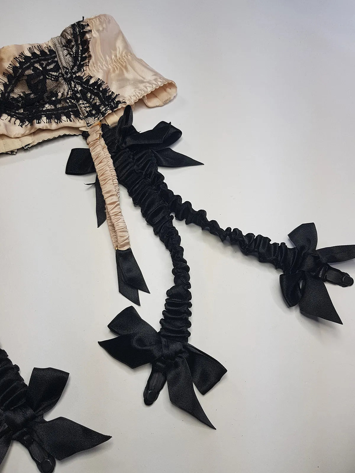 Agent Provocateur 2000s Champagne & Black Lingerie Suspender Belt with custom made suspenders with Bows - Satin & Eyelash Lace