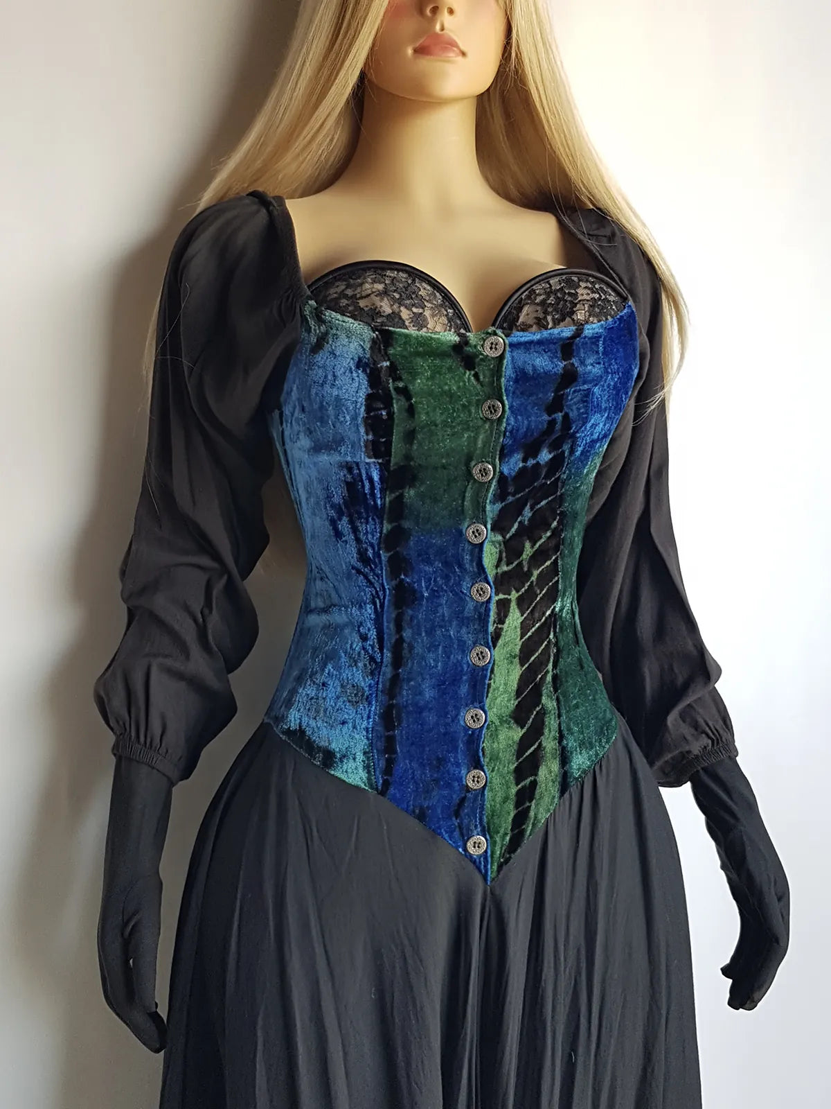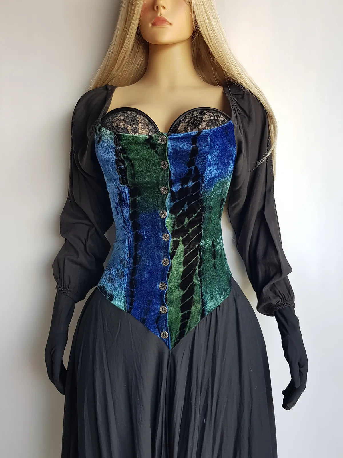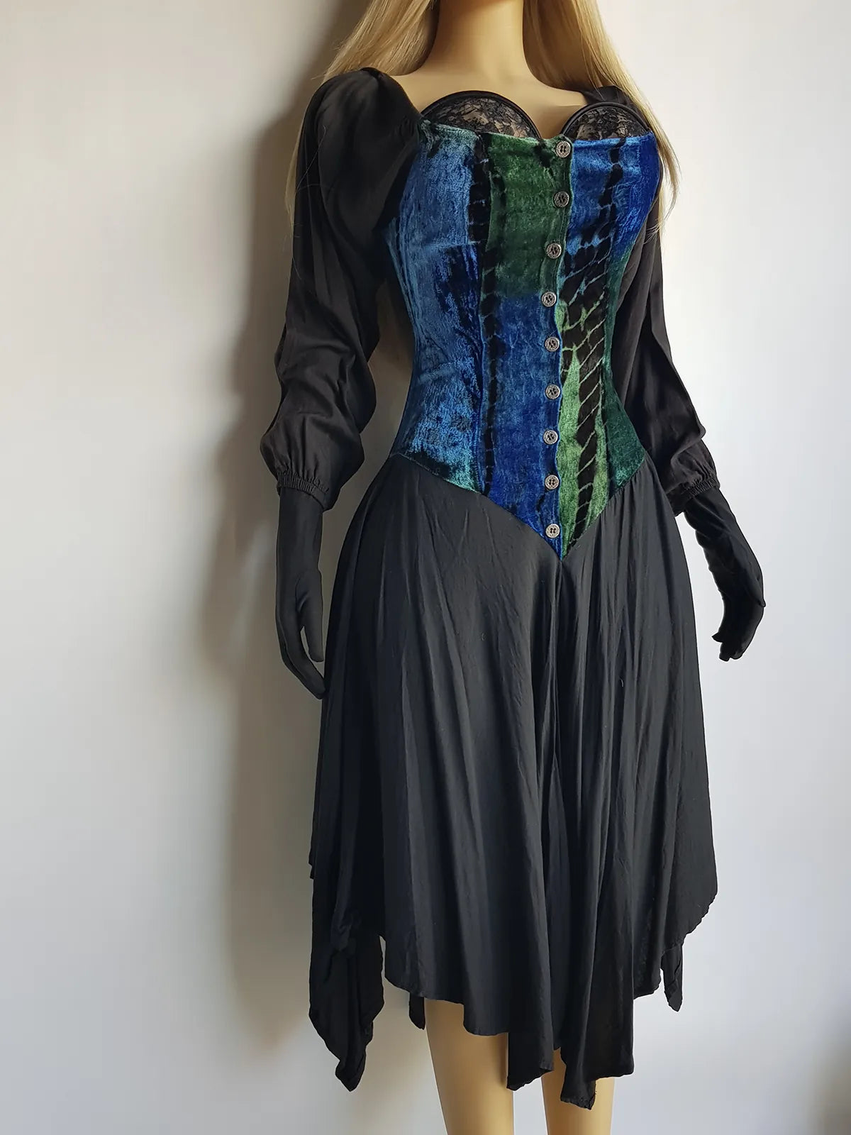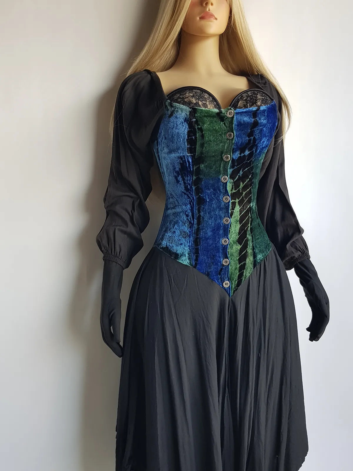 Authentic 1990s Whimsigoth Peasant Dress in Plush Velvet - Greens & Blues - Hand Dyed - medieval metal buttons - long sleeve & handkerchief hemline