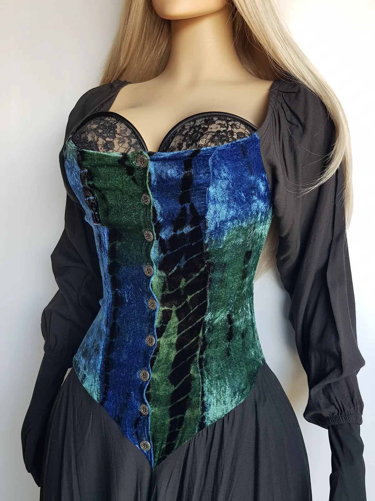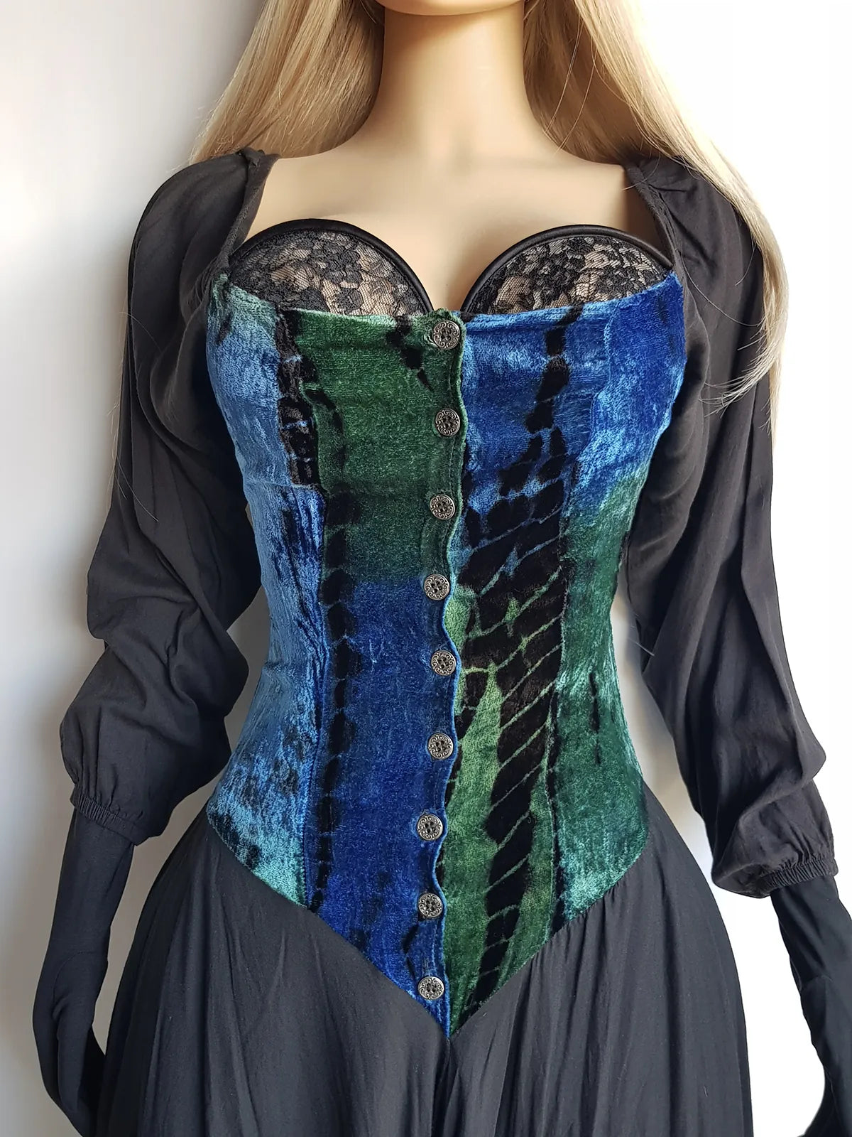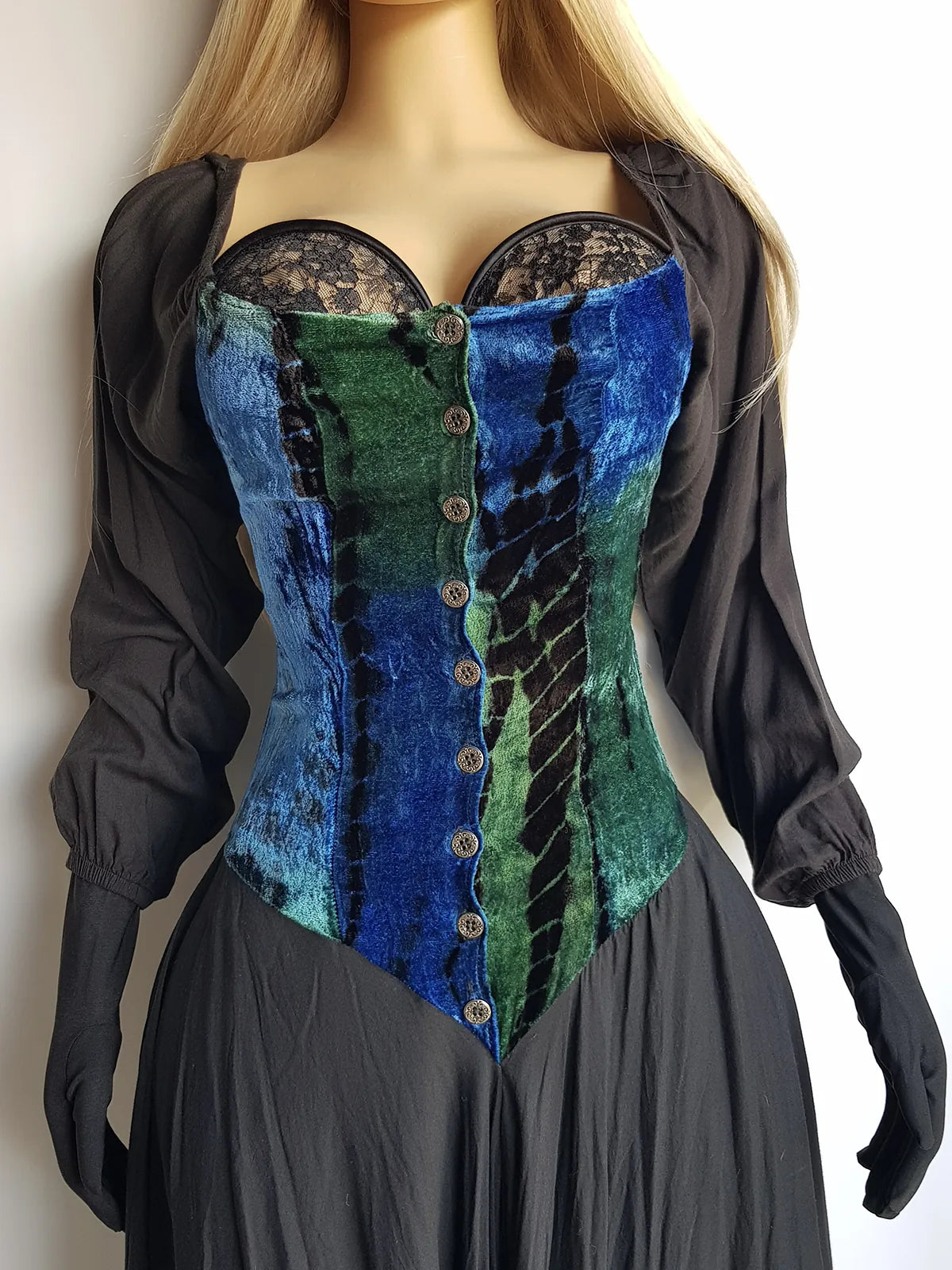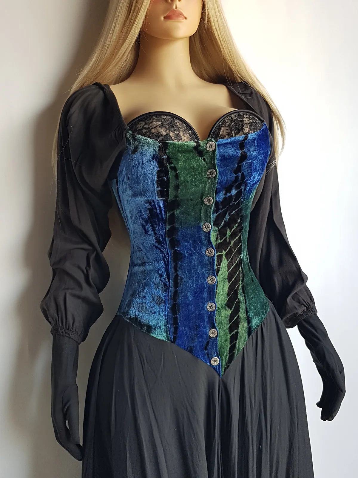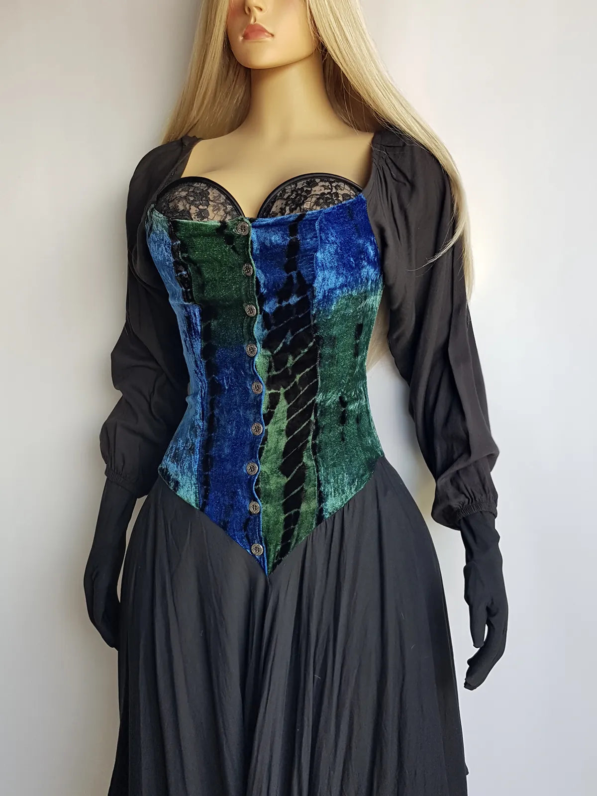 Authentic 1990s Whimsigoth Peasant Dress in Plush Velvet - Greens & Blues - Hand Dyed - medieval metal buttons - long sleeve & handkerchief hemline
