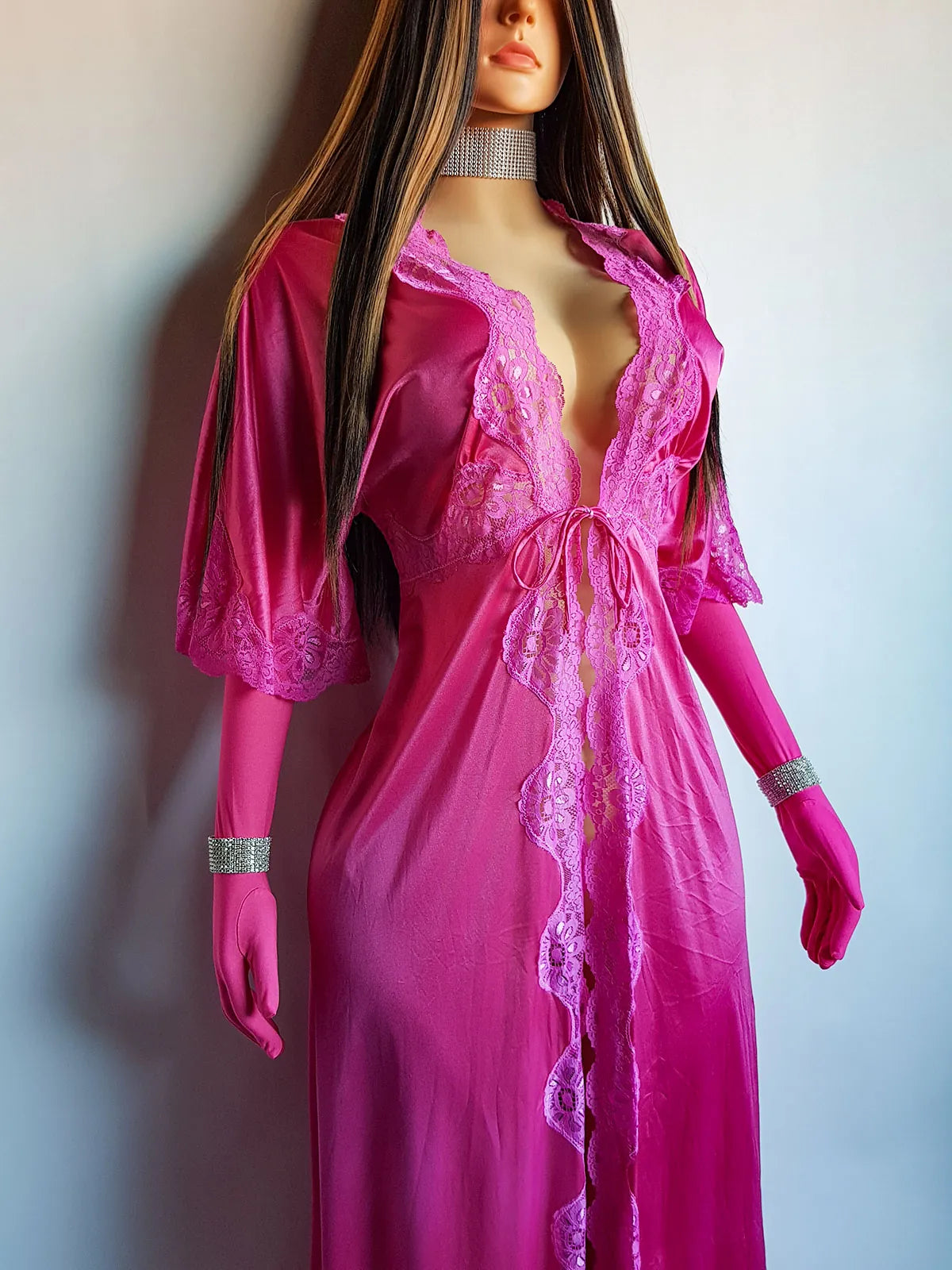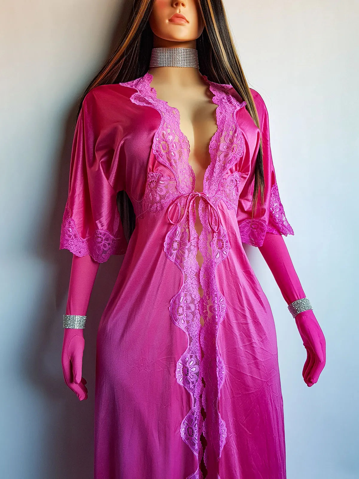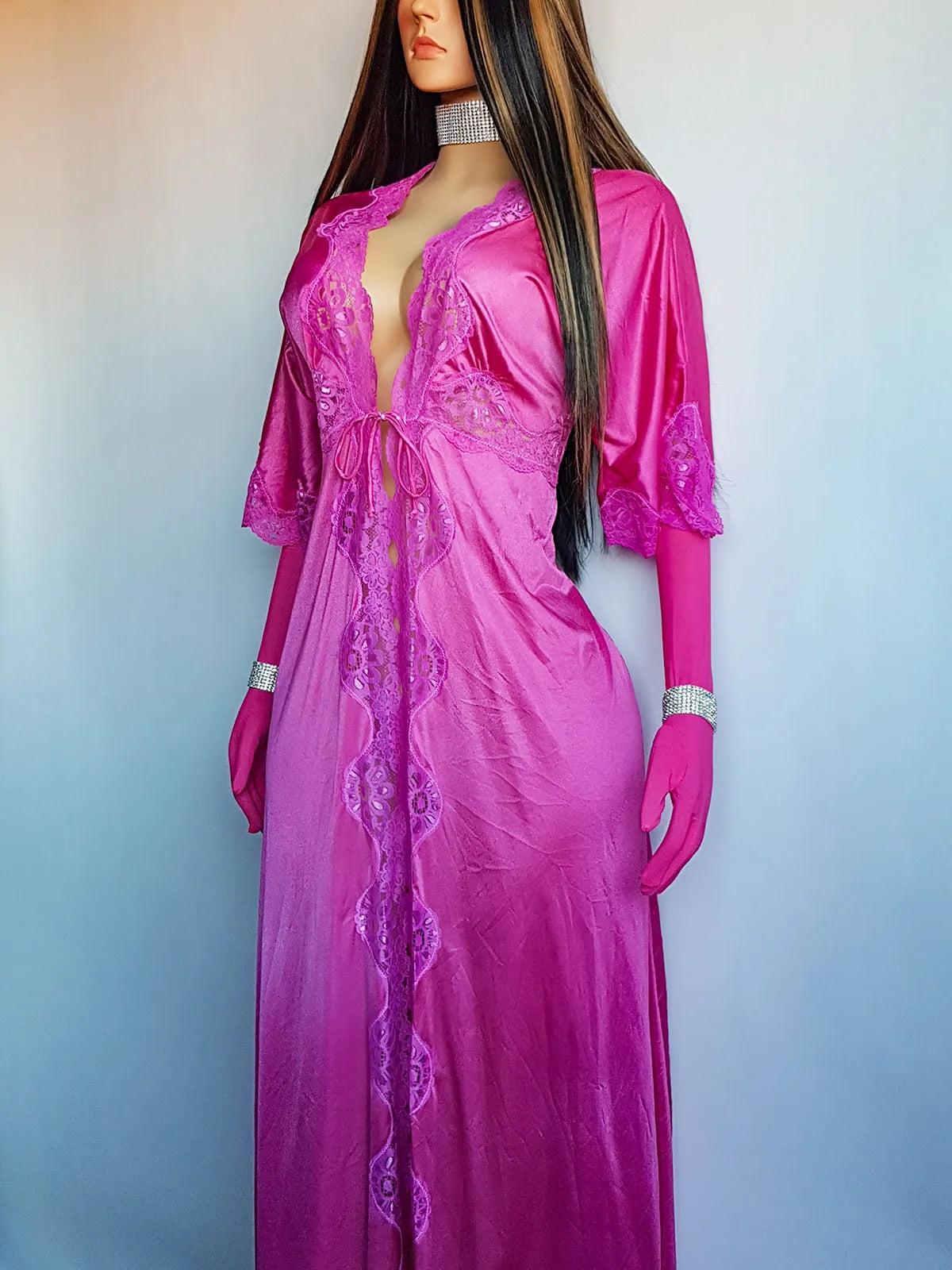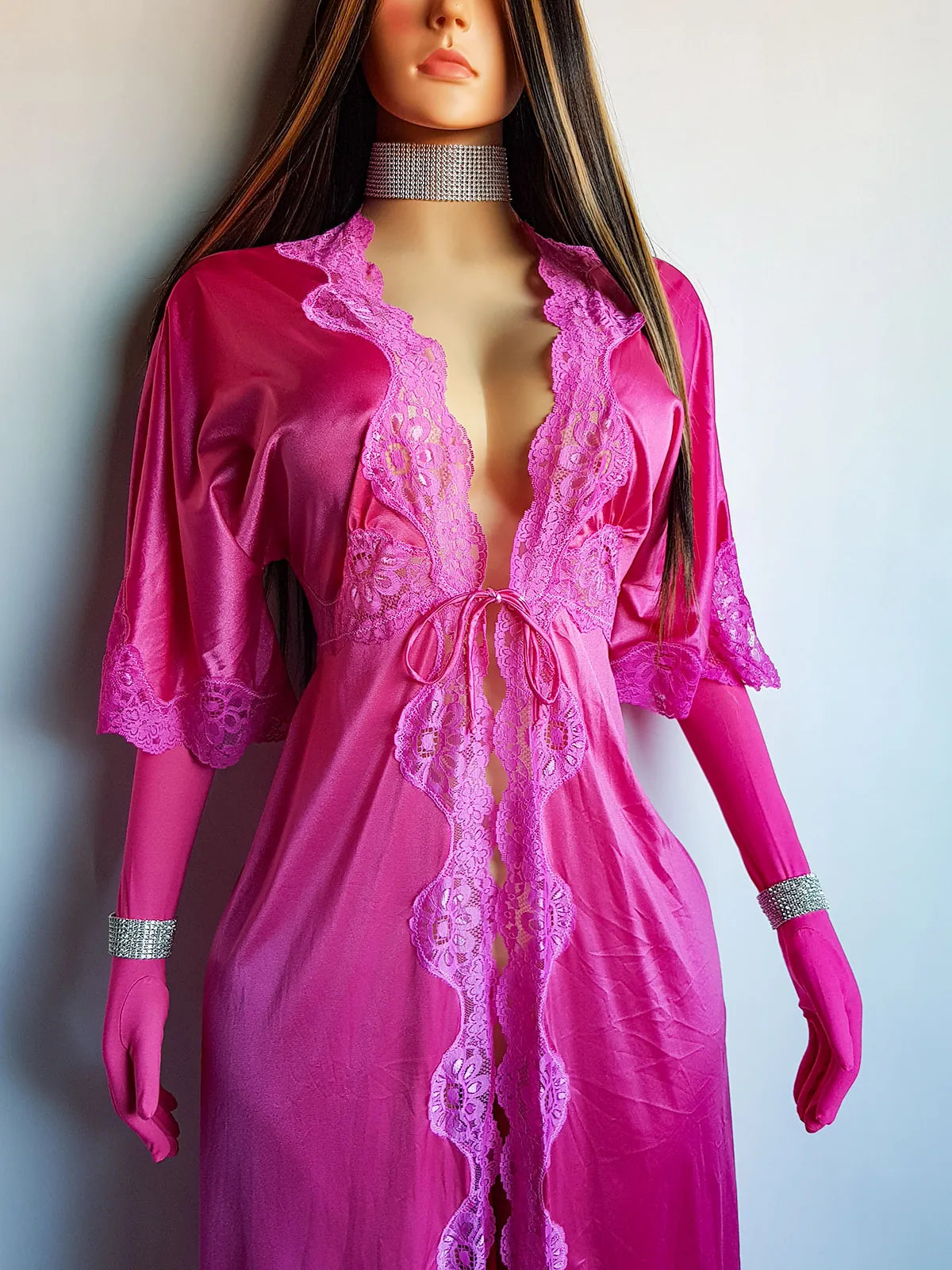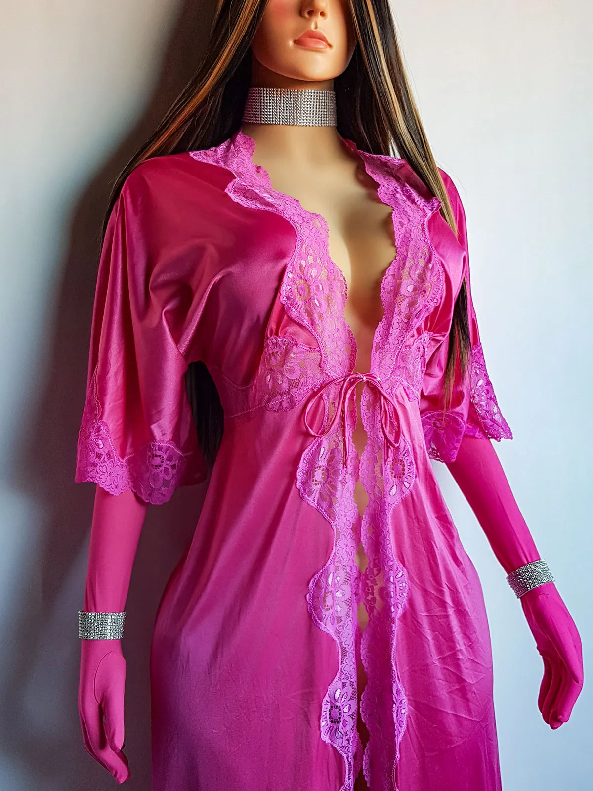 Authentic Vintage Slinky Lace & Satin Floor Length Robe in Rich Pink - Tie Front - Elbow Length sleeves - Open from the waist