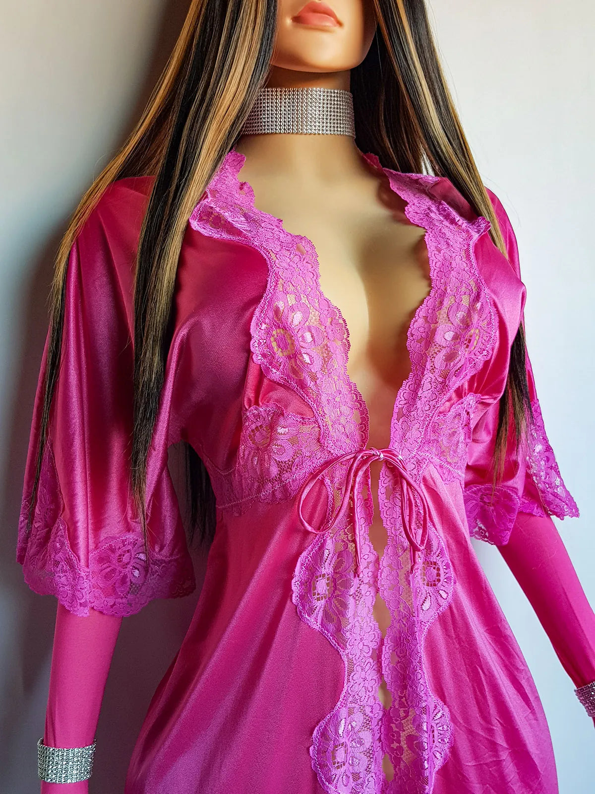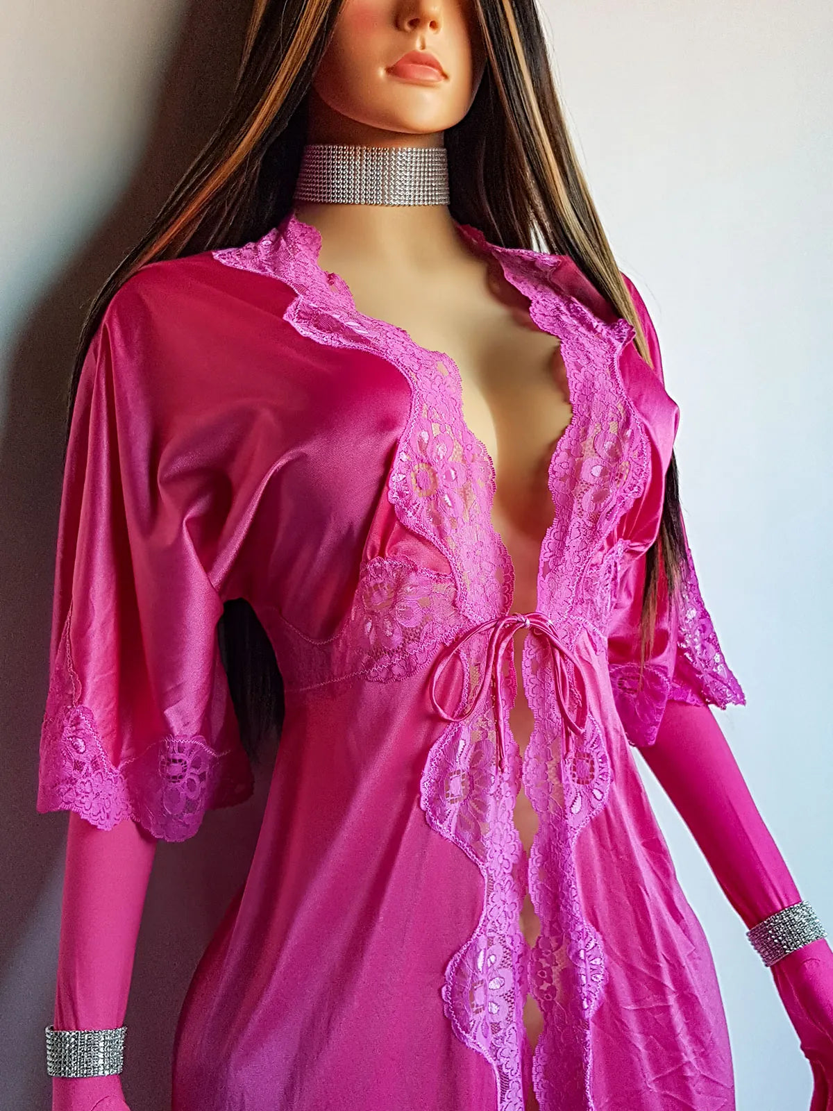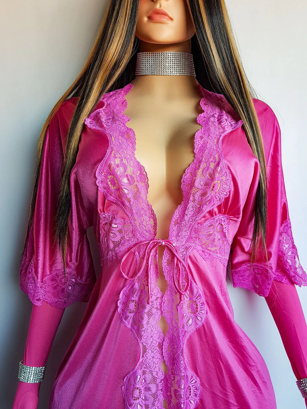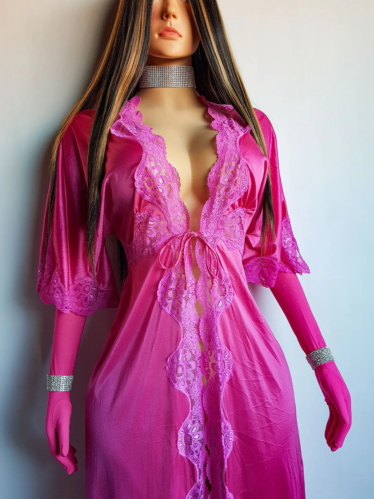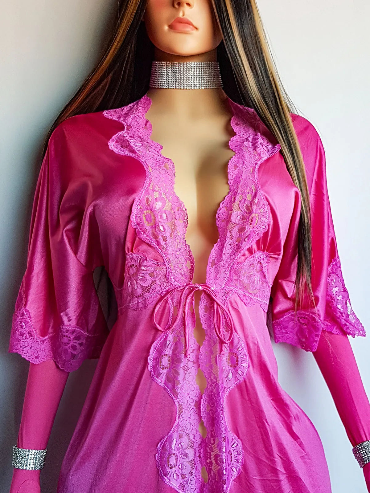 Authentic Vintage Slinky Lace & Satin Floor Length Robe in Rich Pink - Tie Front - Elbow Length sleeves - Open from the waist