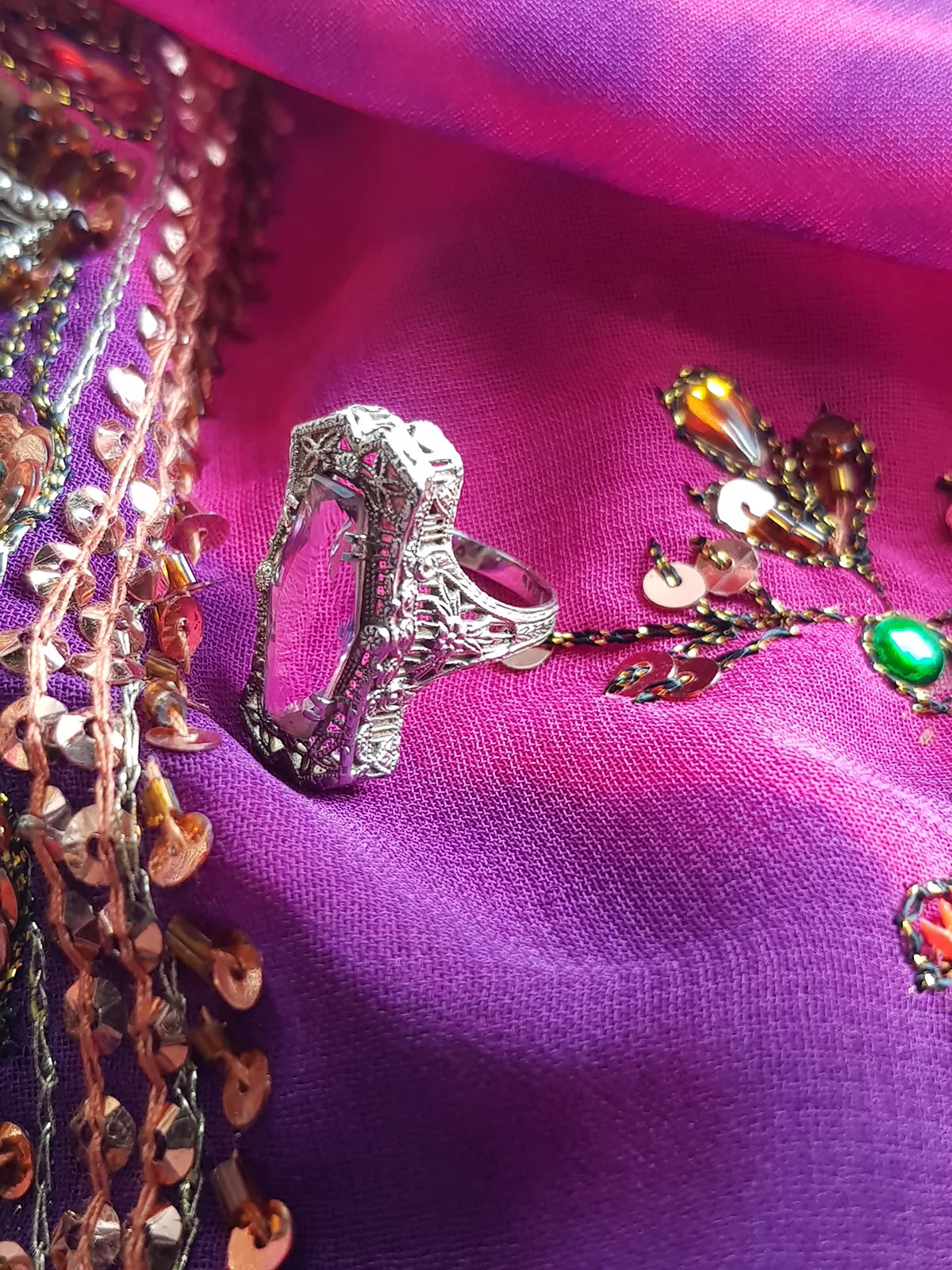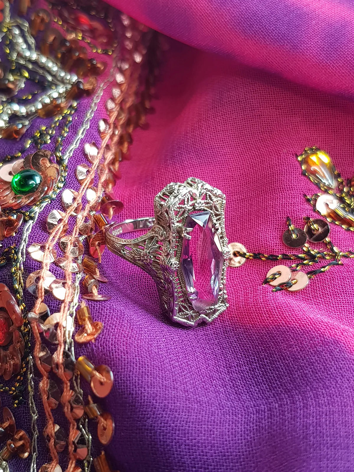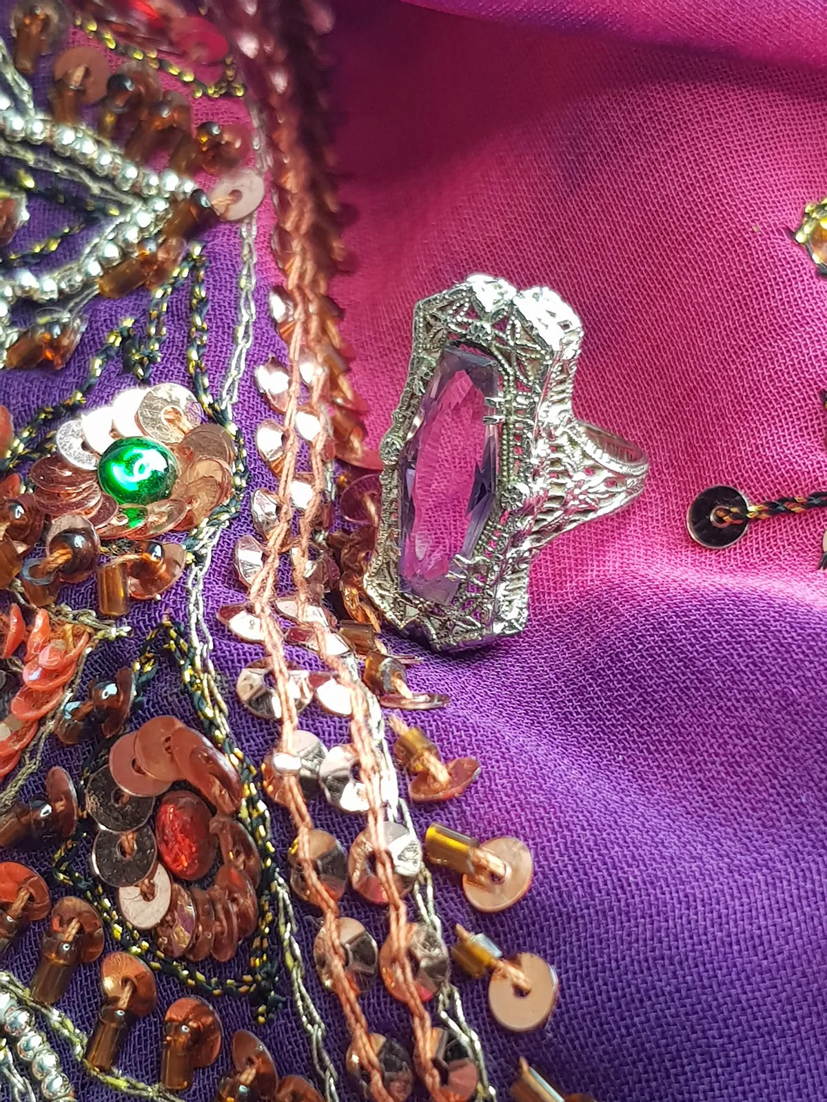 1920s Ethereal Art Deco - Amethyst & 14kt White Gold Ornate Ring - Stamped