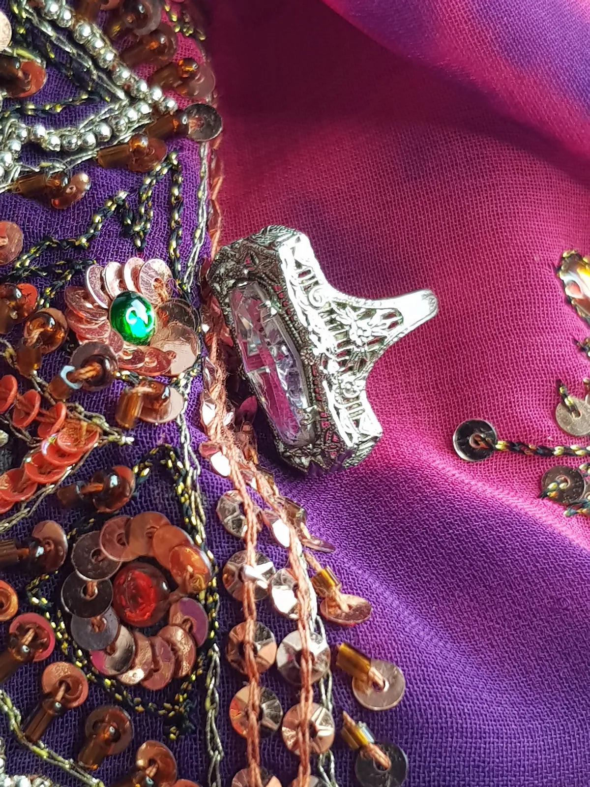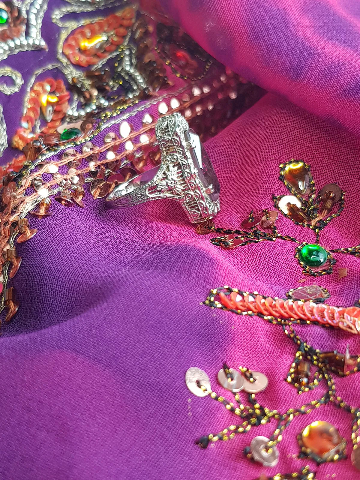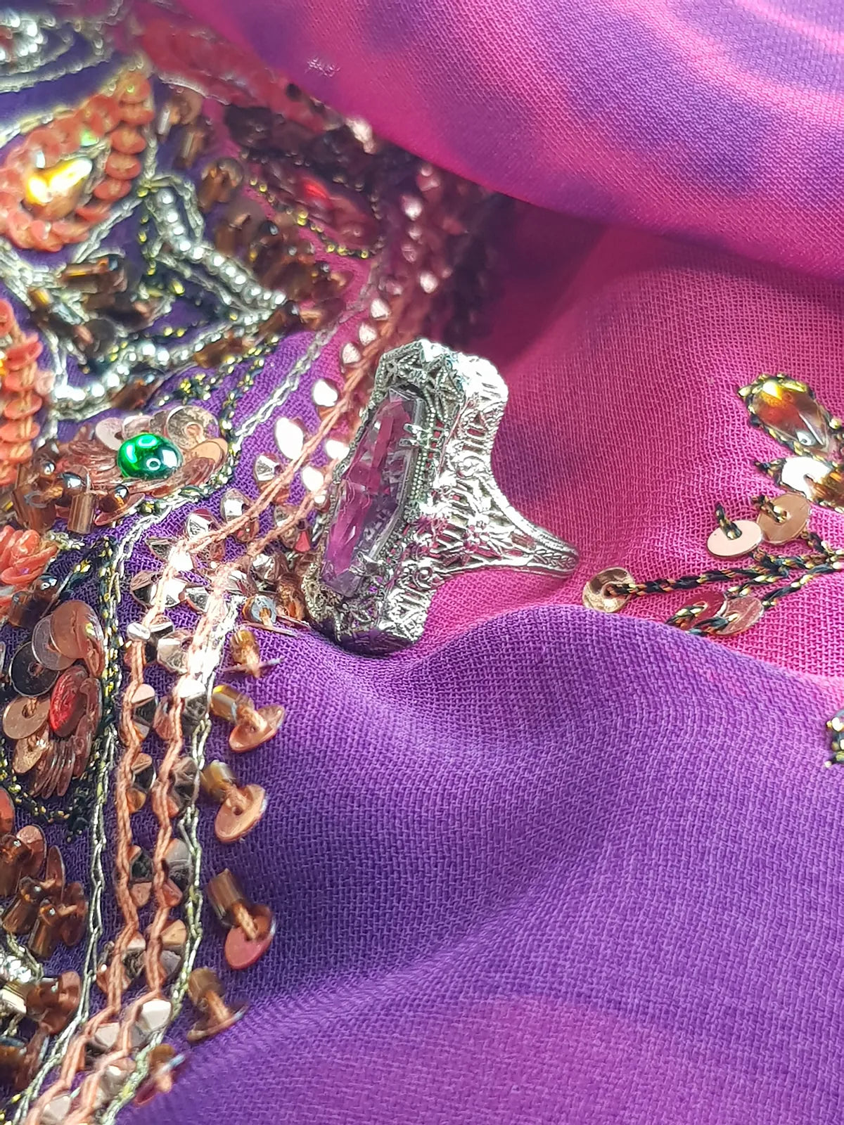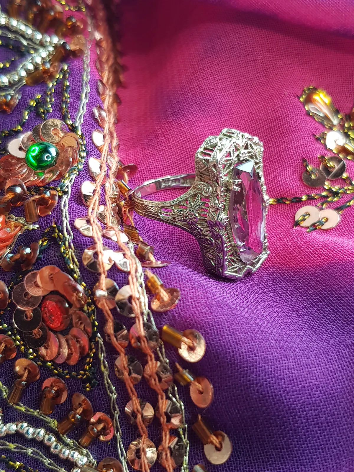 1920s Ethereal Art Deco - Amethyst & 14kt White Gold Ornate Ring - Stamped