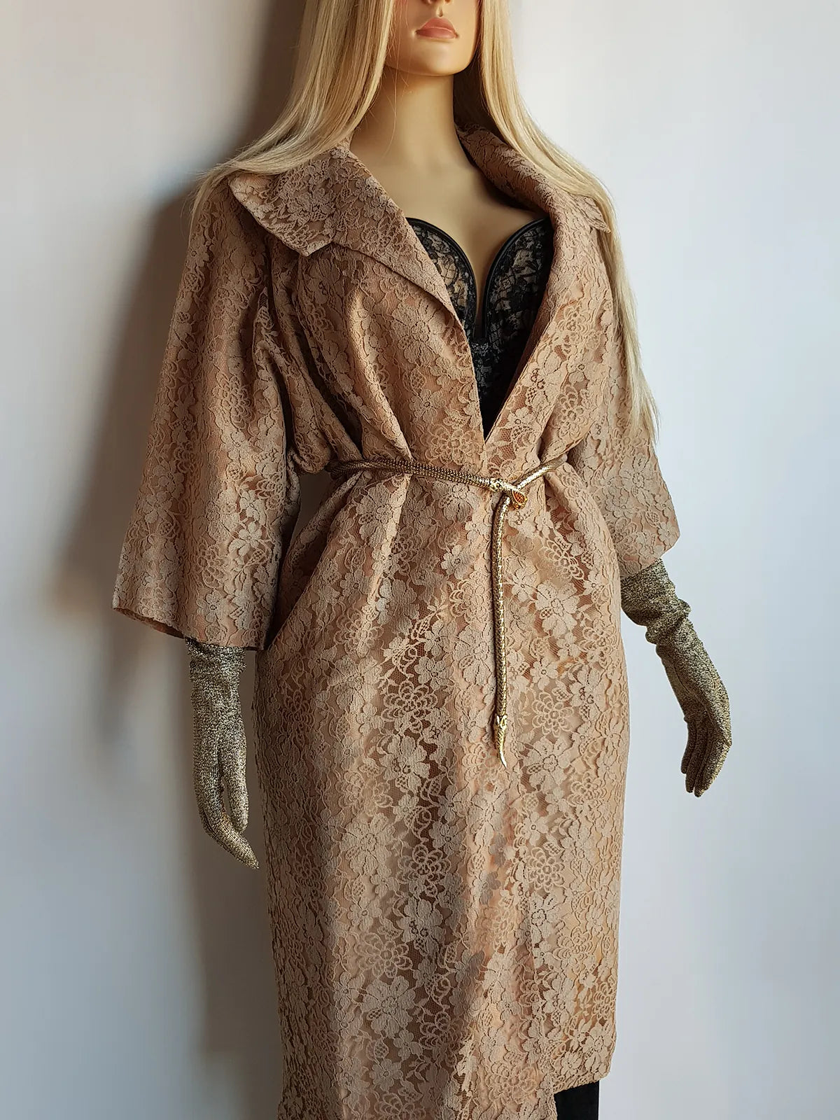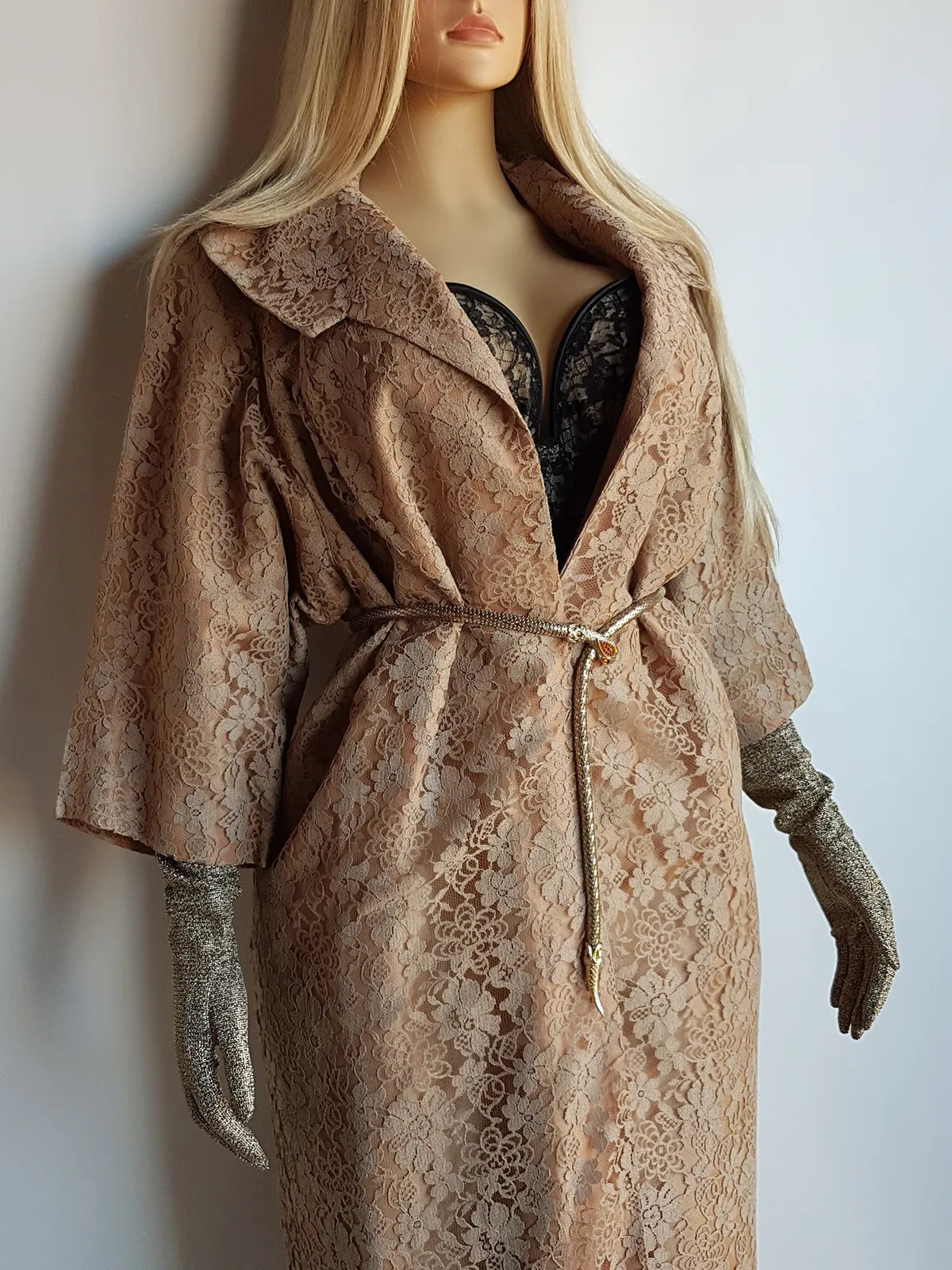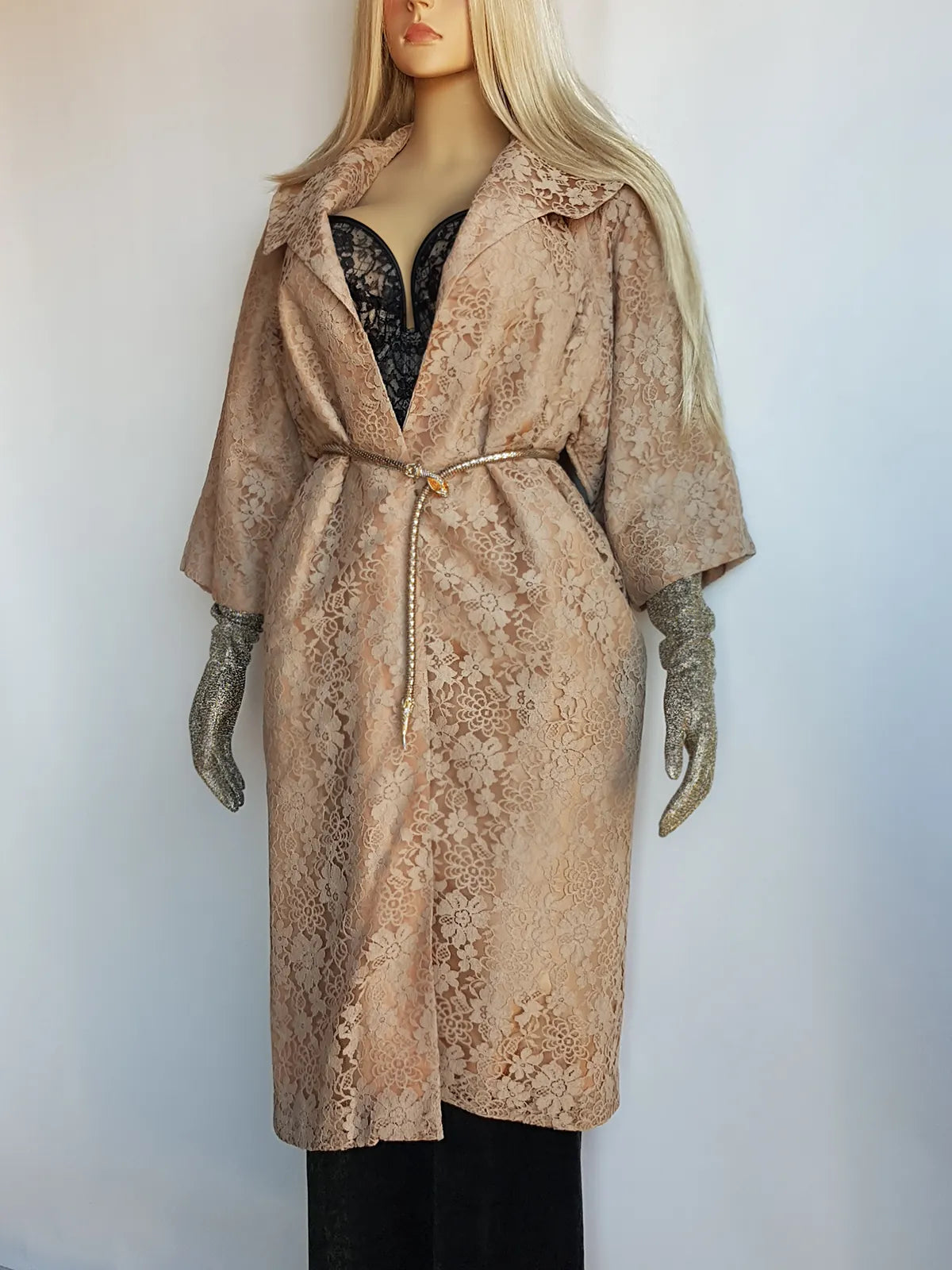 Genuine 1950s Vintage Coat in stunning lace overlay - hourglass - large collar and perfect 3/4 sleeves - wear multiple ways closed with a belt or open