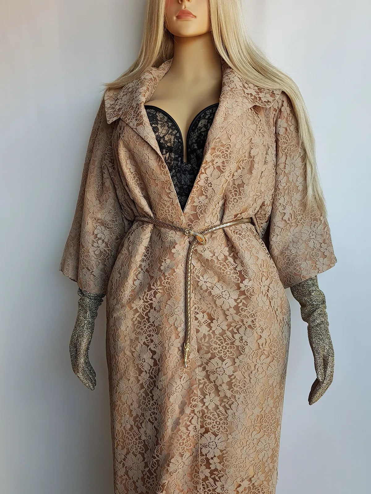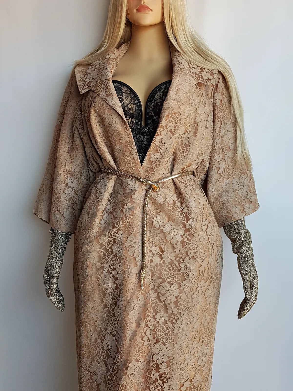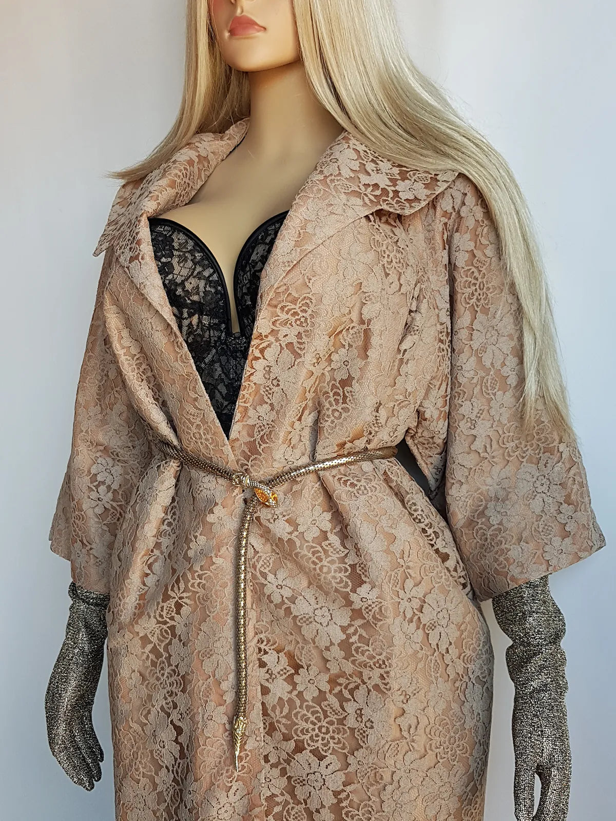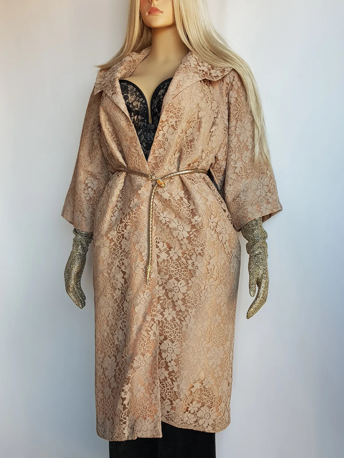 Genuine 1950s Vintage Coat in stunning lace overlay - hourglass - large collar and perfect 3/4 sleeves - wear multiple ways closed with a belt or open