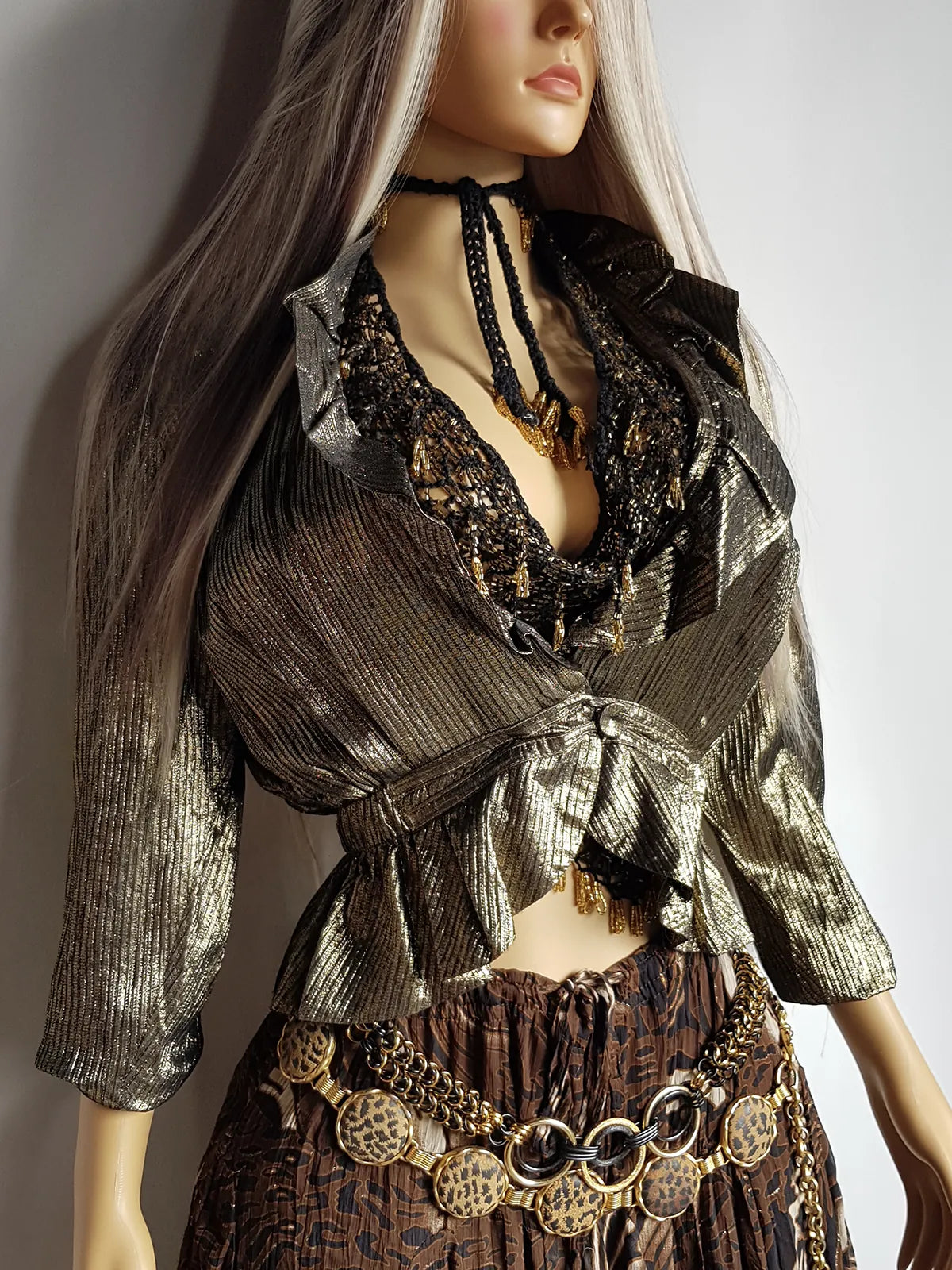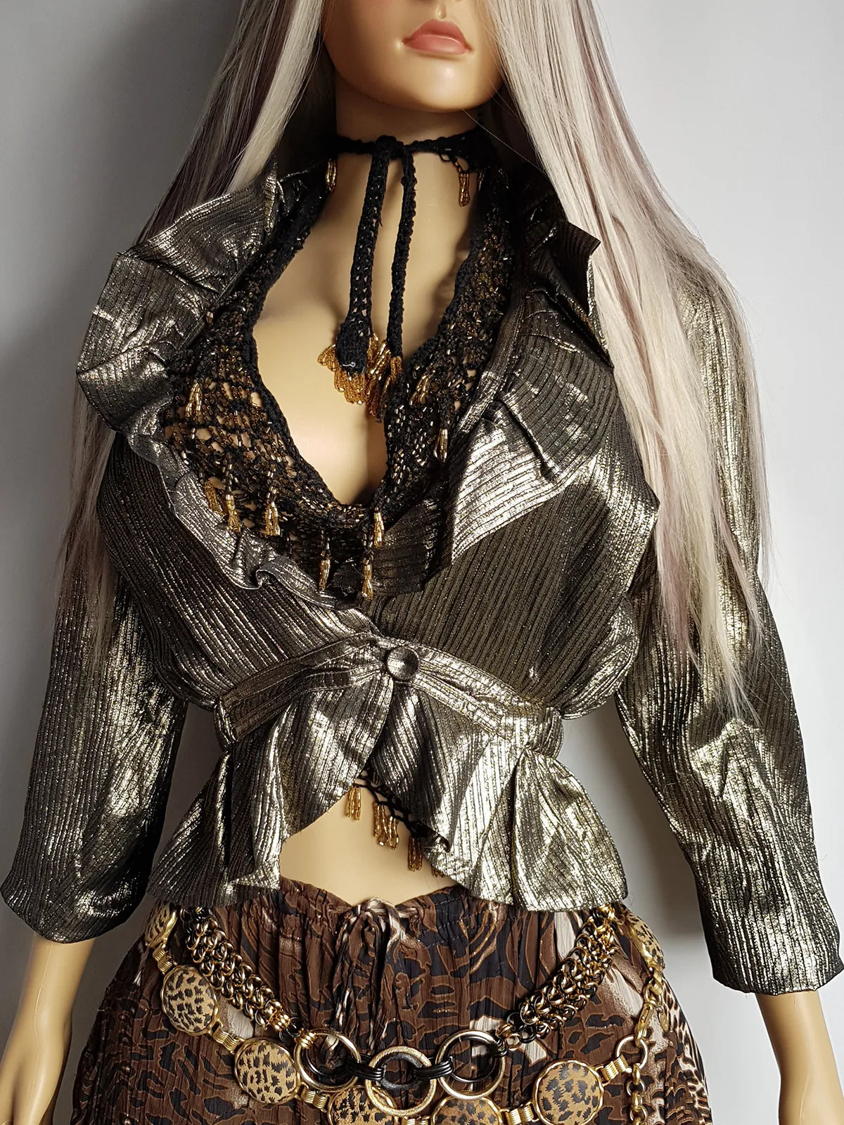 Gold Metallic Vintage Rockstar Bohemian Jacket - Ruffles & Gorgeous Open Bust - Nipped In Waist - Button Closure