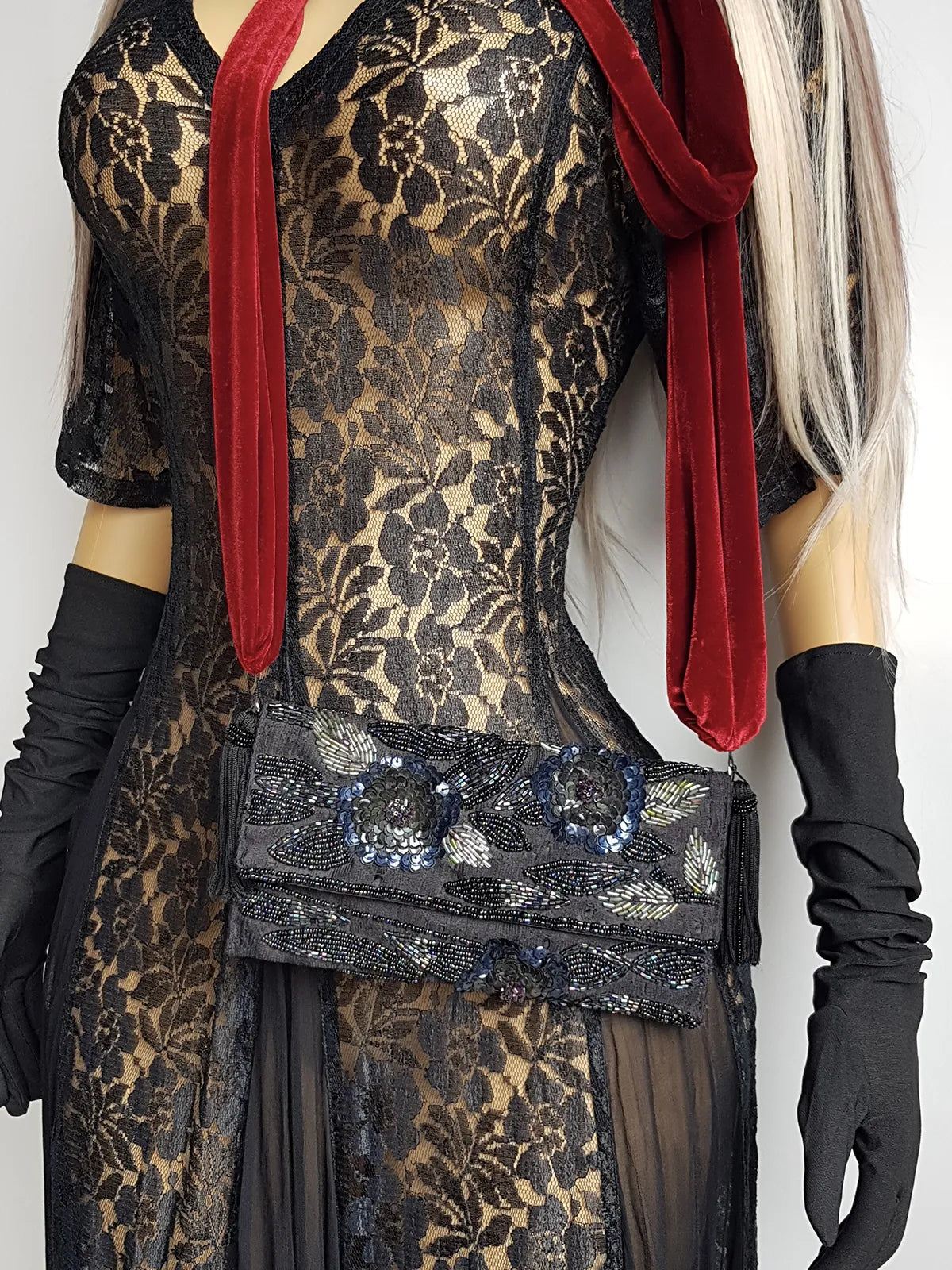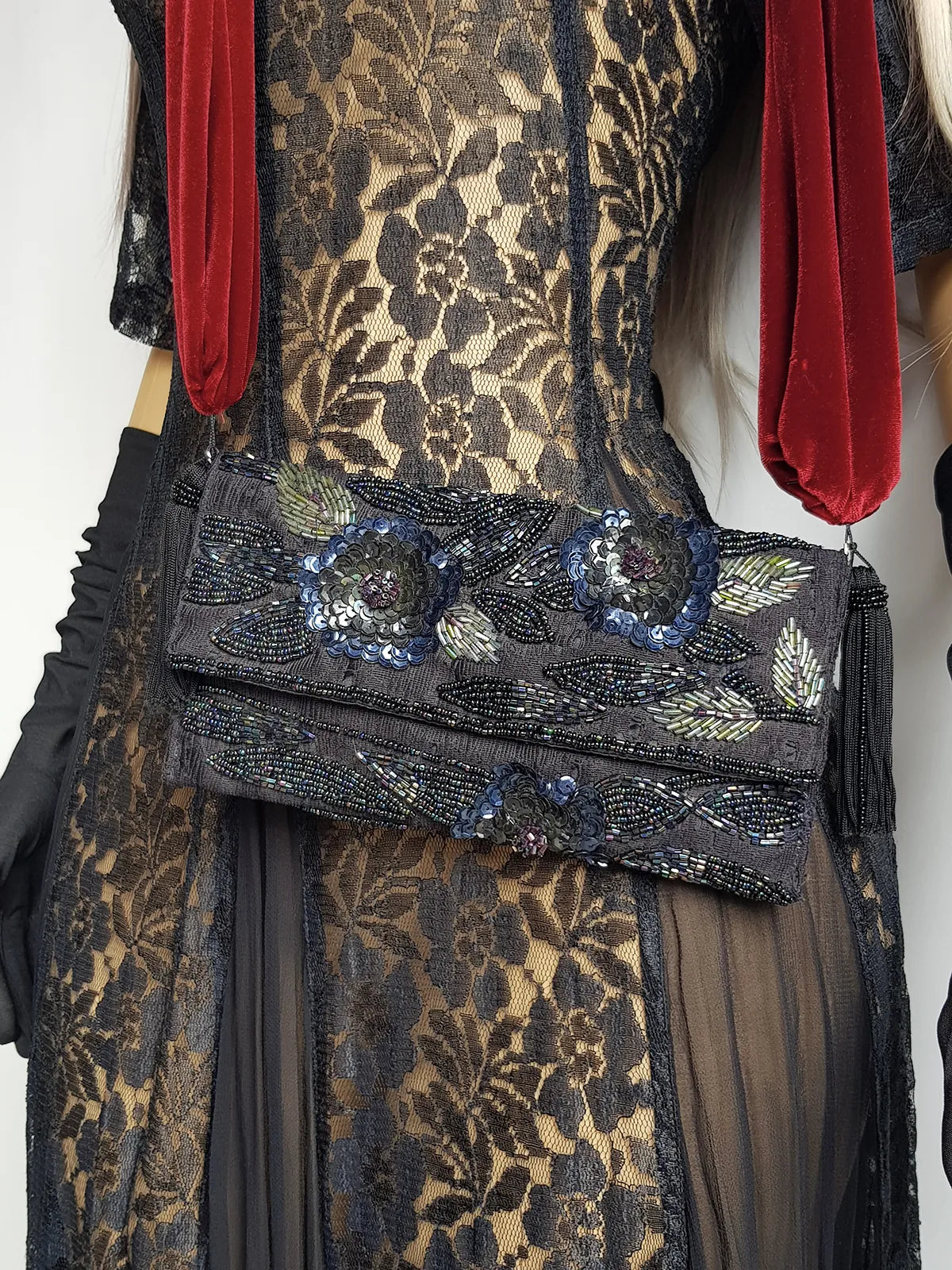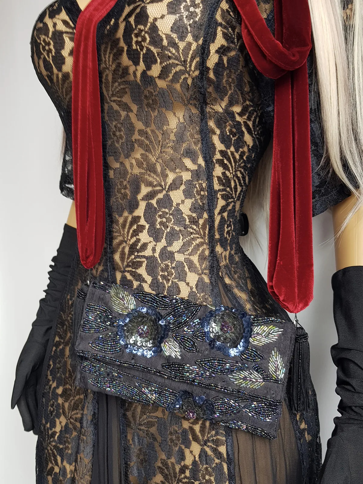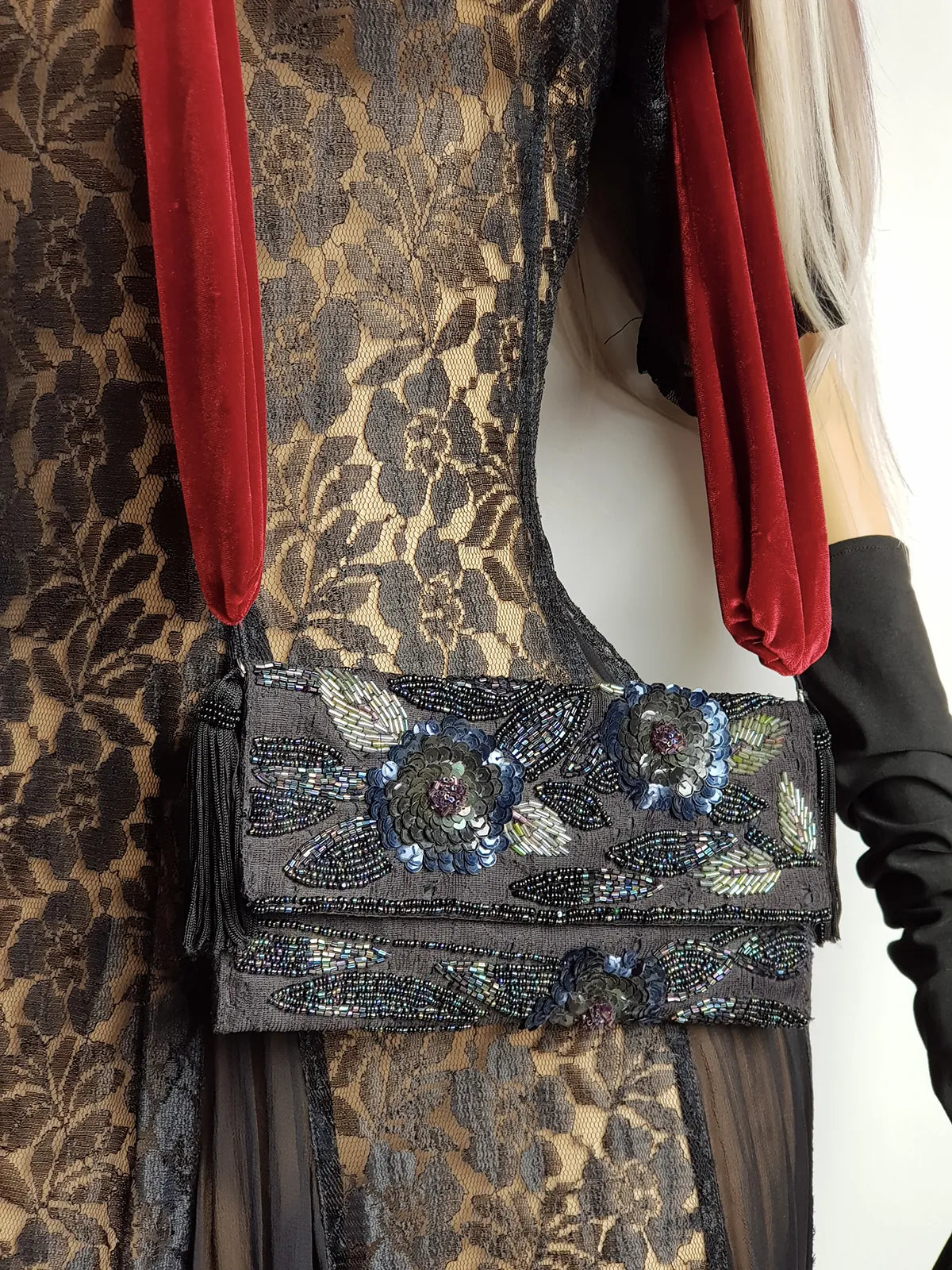 Heavily Beaded Vintage 90s evening pouch - Rich Blues & Reds - one of a kind custom made - tassels beads sequins & velvet - wear a multitude of different ways