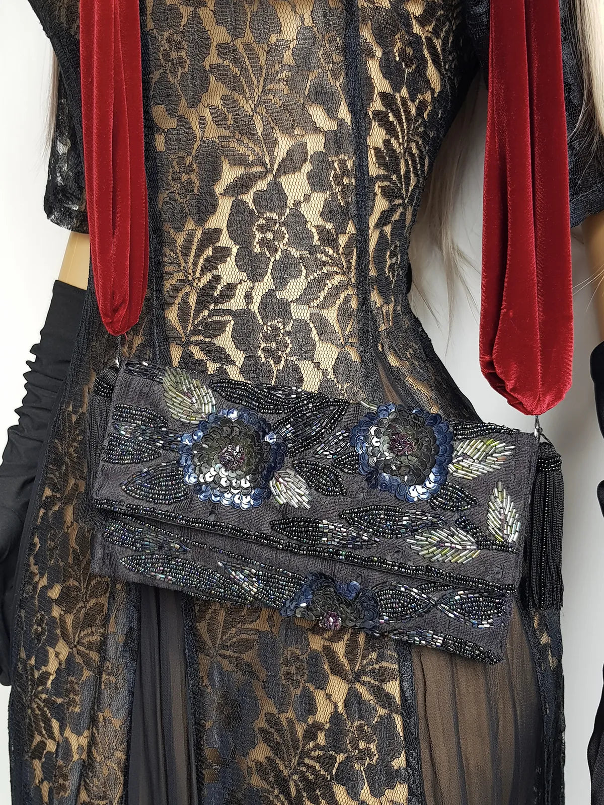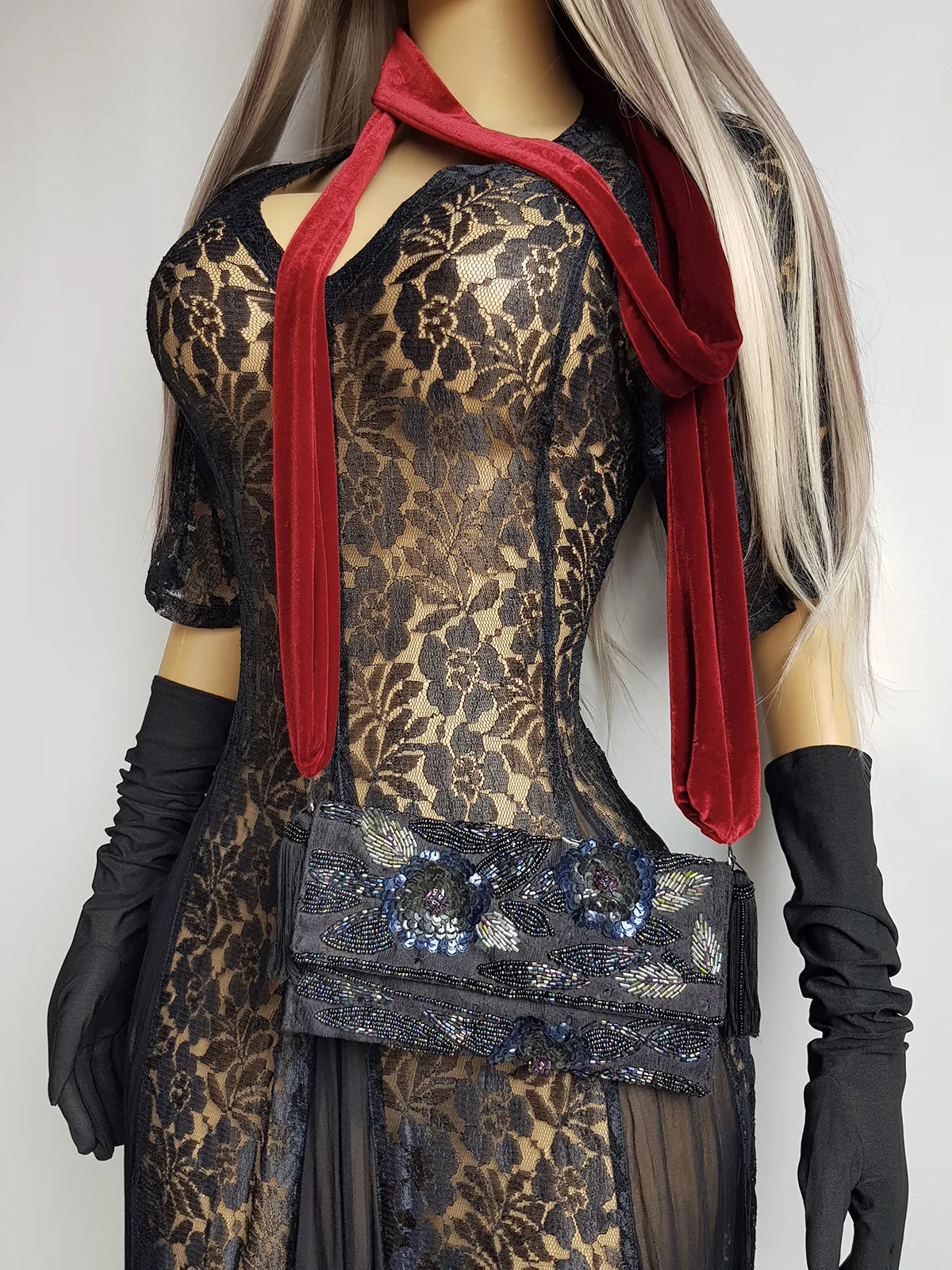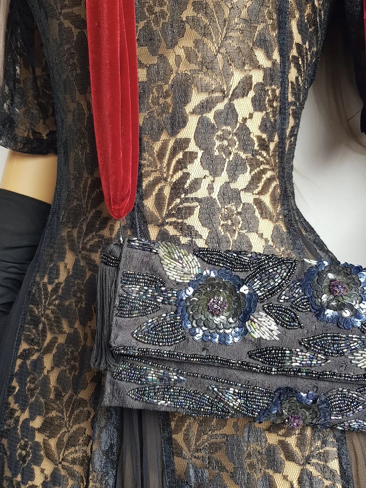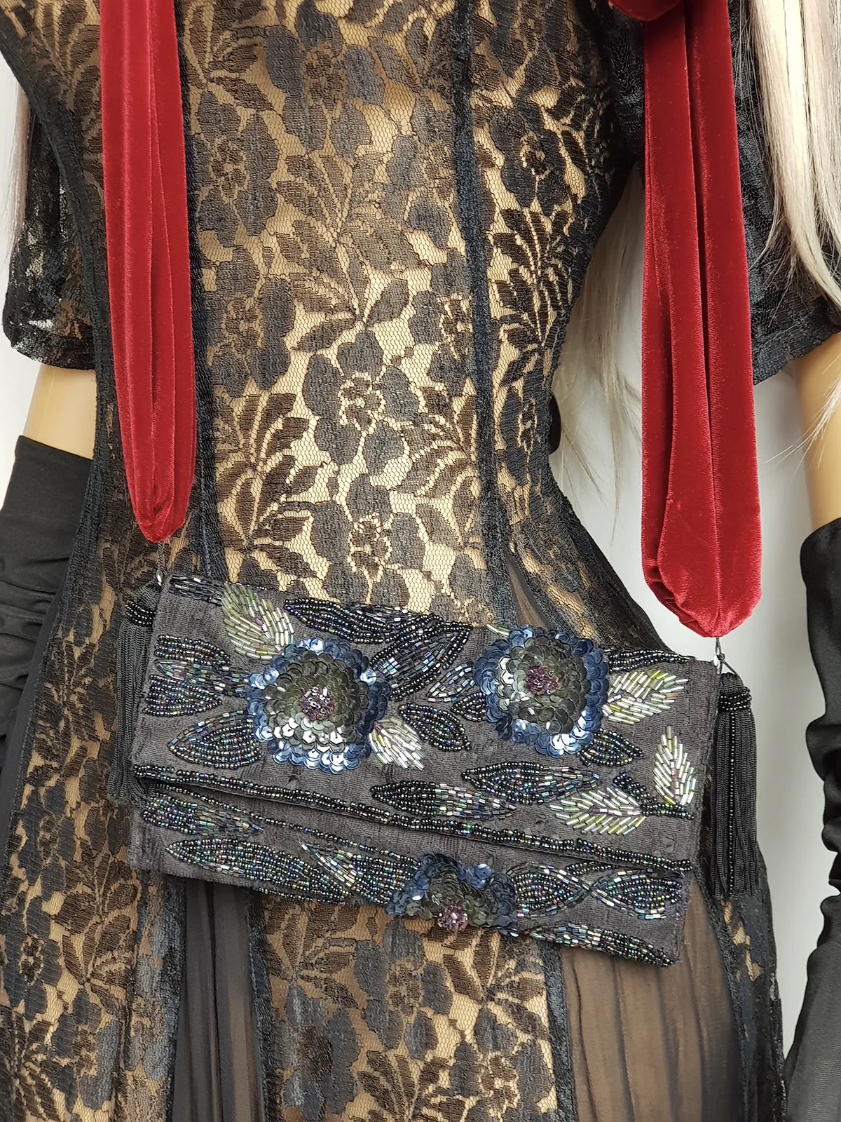Heavily Beaded Vintage 90s evening pouch - Rich Blues & Reds - one of a kind custom made - tassels beads sequins & velvet - wear a multitude of different ways