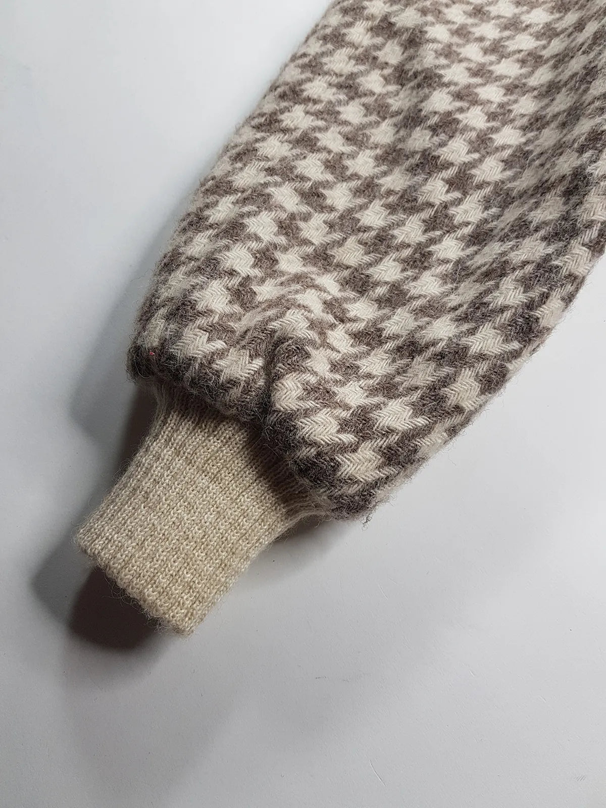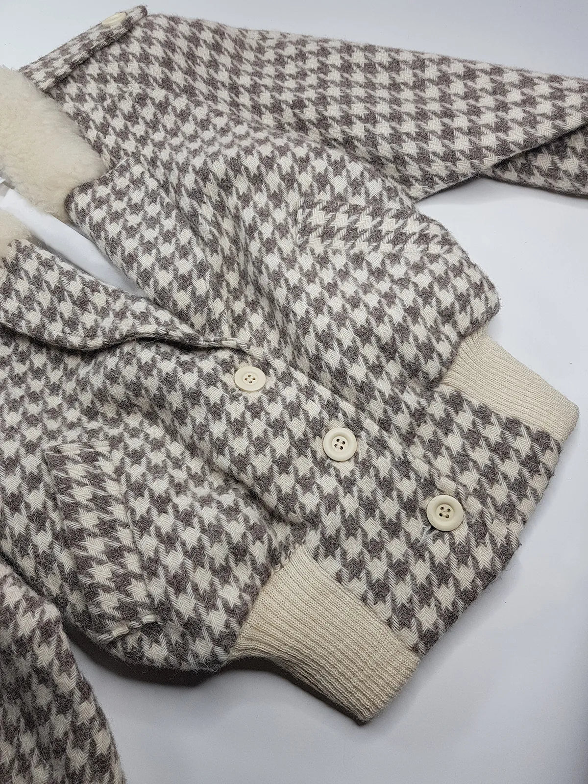 Houndstooth Vintage 1950s Cropped Bomber Jacket in Wool with Fur Collar - Structured Waist & Sleeves - Fully Lined