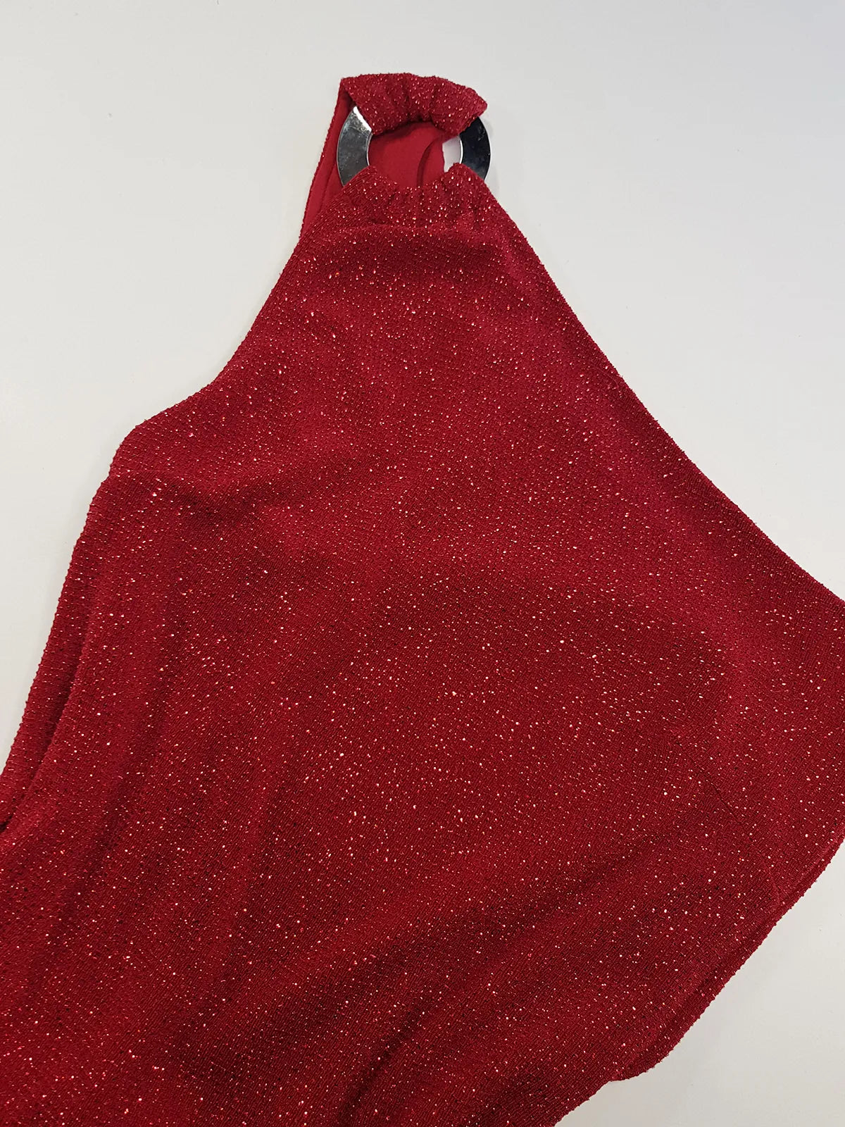 Iconic 90s Super Sexy Red Sparkle Gown - Absolutely Beautiful Silhouette & Hip Ruching with Silver Hardware Buckle that clings to the hip perfectly- Red with Red cast Diamonds in the fabric - Stretch body hugging high quality fabric