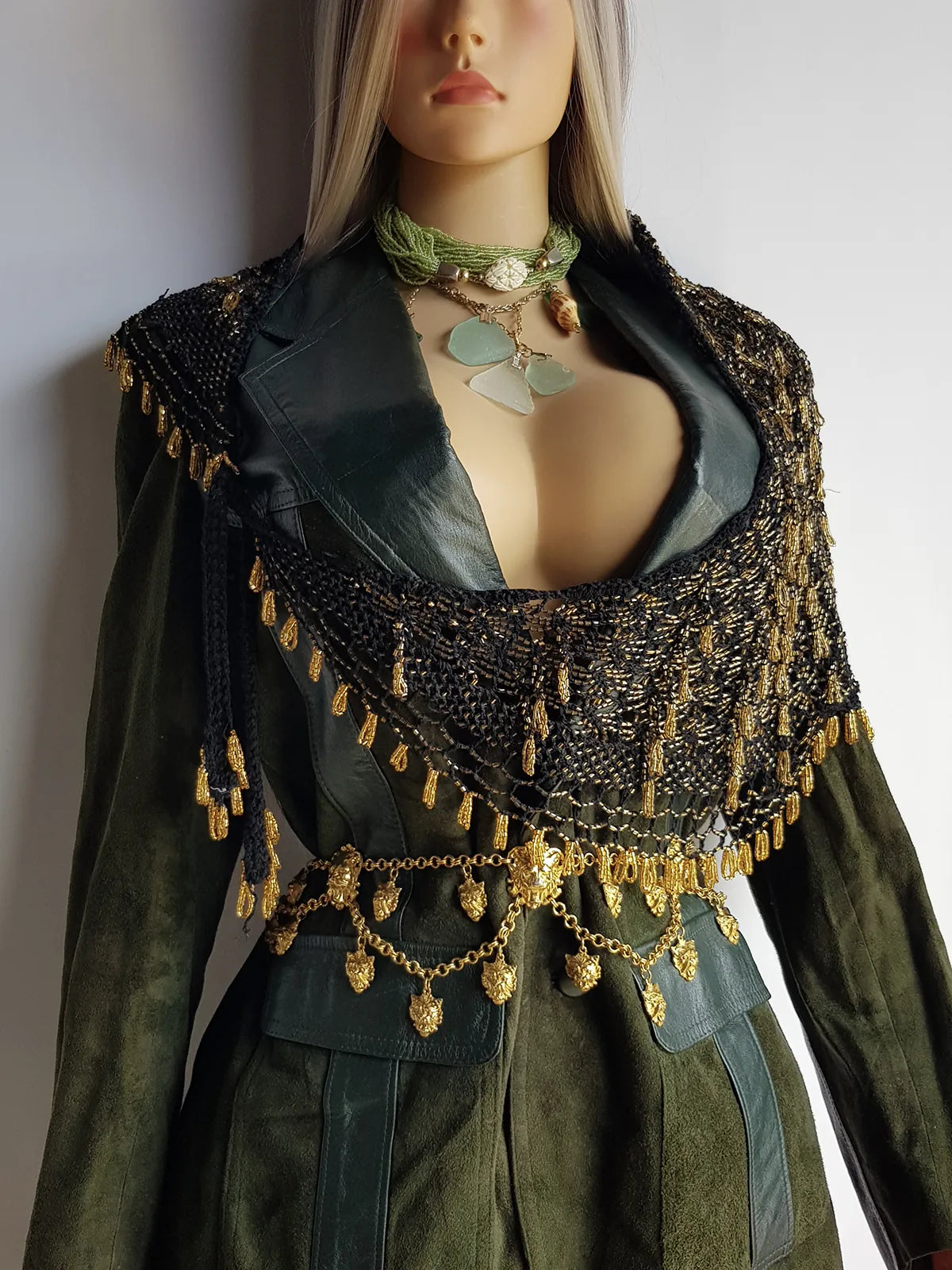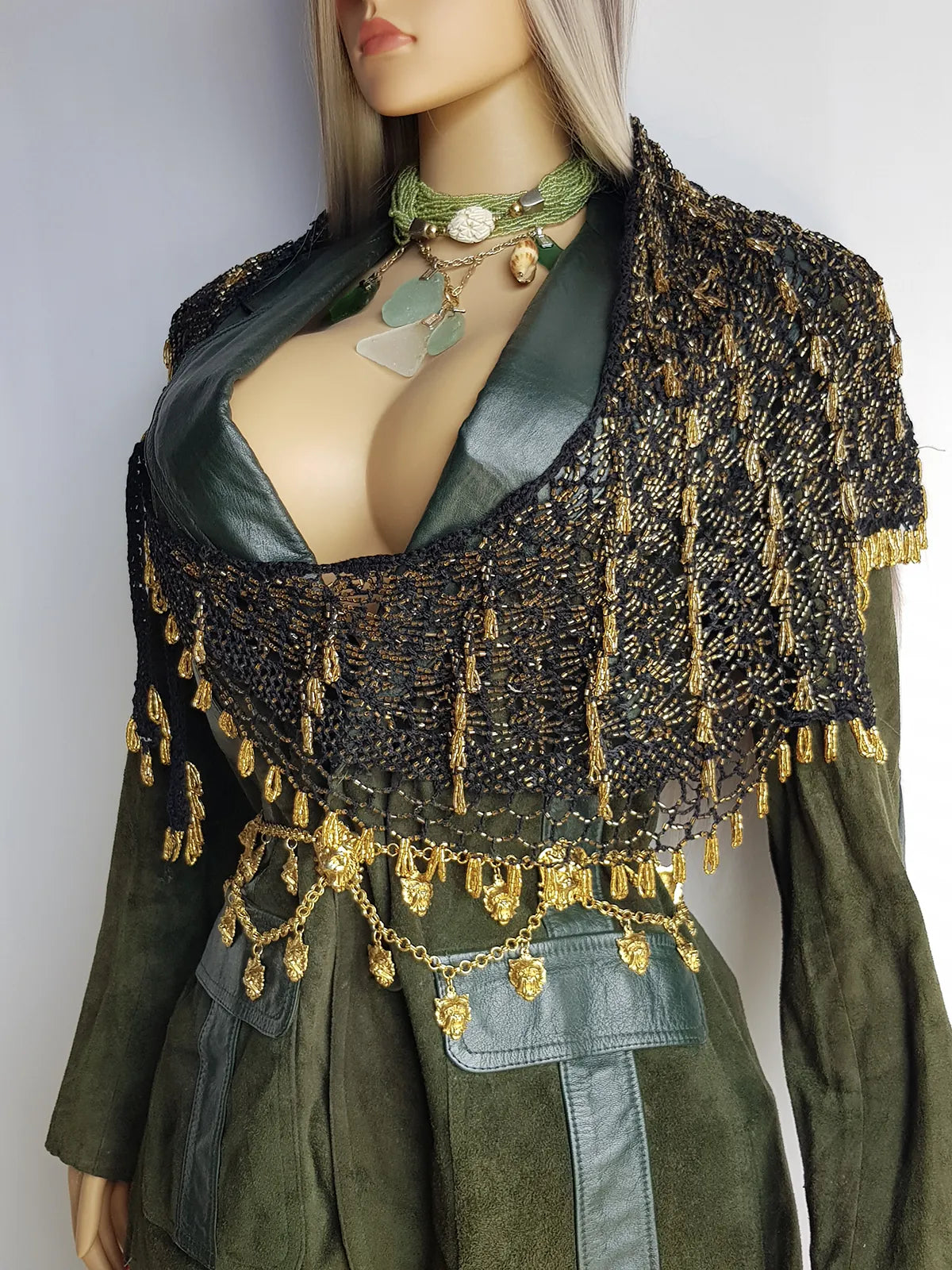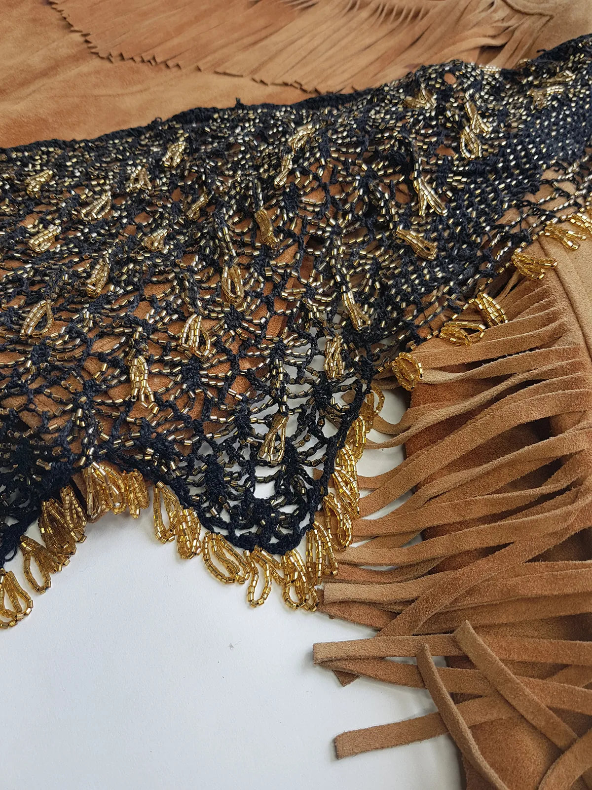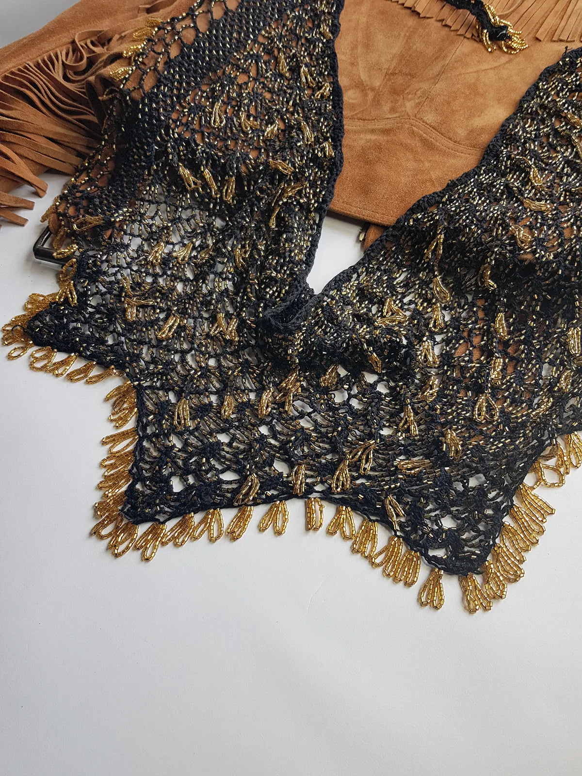 Insane 1970s Handmade Crochet Beaded Party Top / Skirt / Wrap - Tie at neck - Studio 54 - Black Crochet & Gold Beading