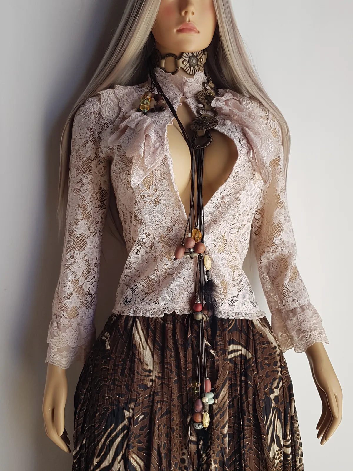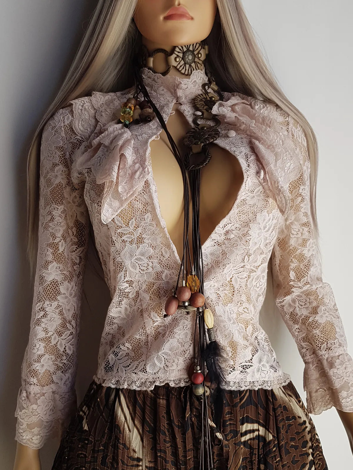 Saloon Girl Style Vintage Lace Jacket / Blouse - Light Powder Pink - Ornate High Collar - Lace Ruffle Collar & Cuffs - Button Front - Perfect Cowgirl Vibes