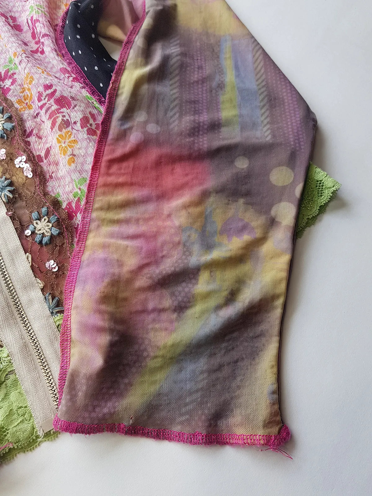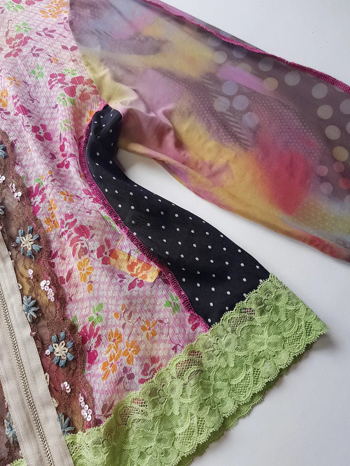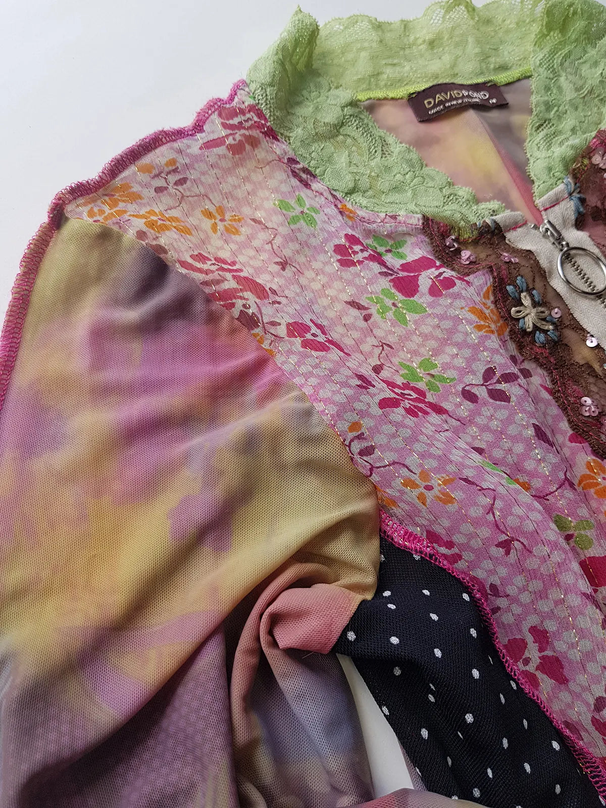 Unbelievable 90s Designer David Pond Mesh & Lace top with intricate hand embroidery and mixed fabrics in Pinks & Greens - very JPG style