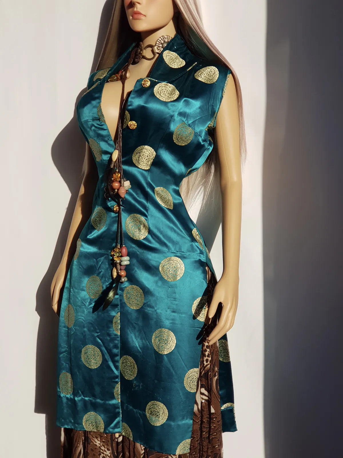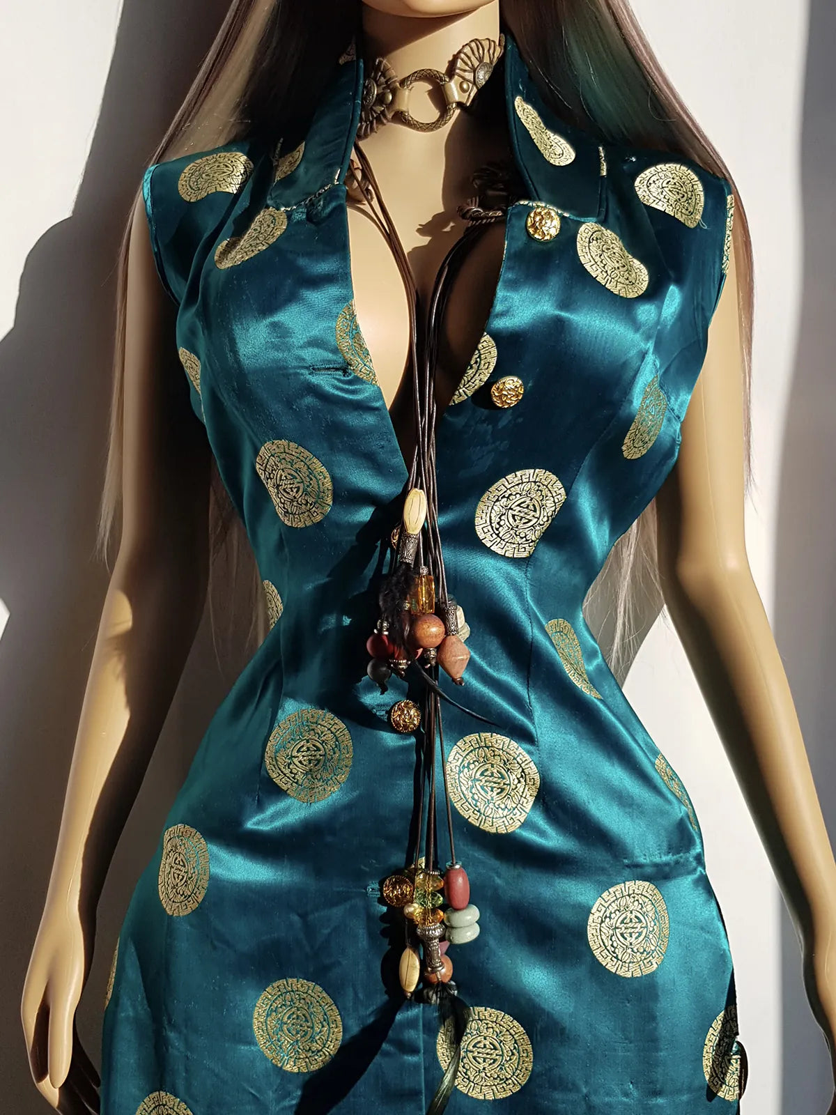 Unbelievably Gorgeous 1950s Hourglass Oriental Satin Dress in Emerald Green & Gold Print - Button Front & High Splits on the sides