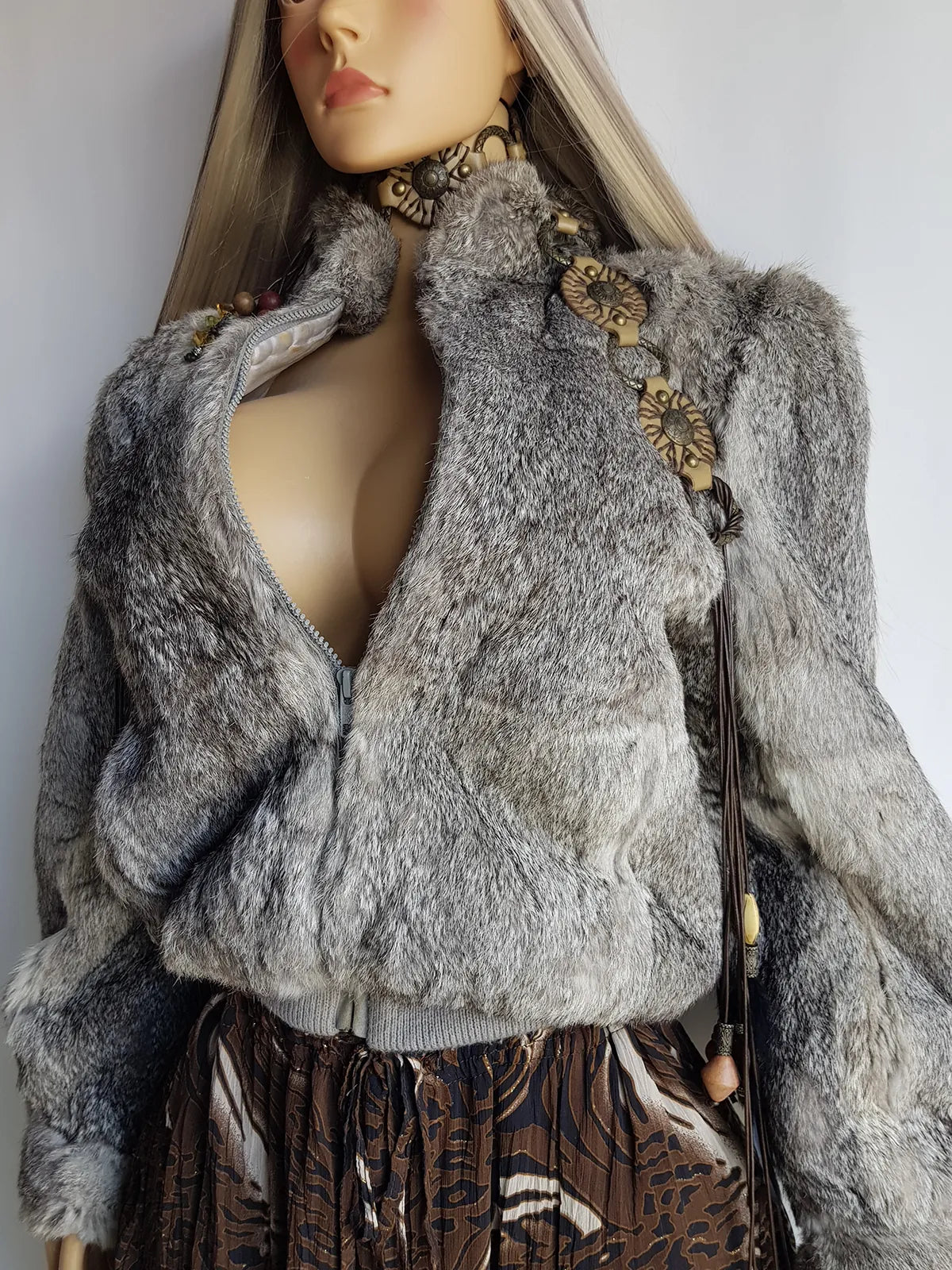 Vintage 100% Rabbit Fur Jacket in Beautiful Soft Grey Tones - Zip front bomber shape with knit features & zip front