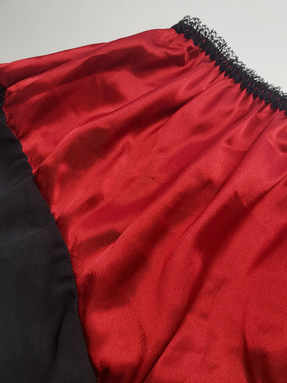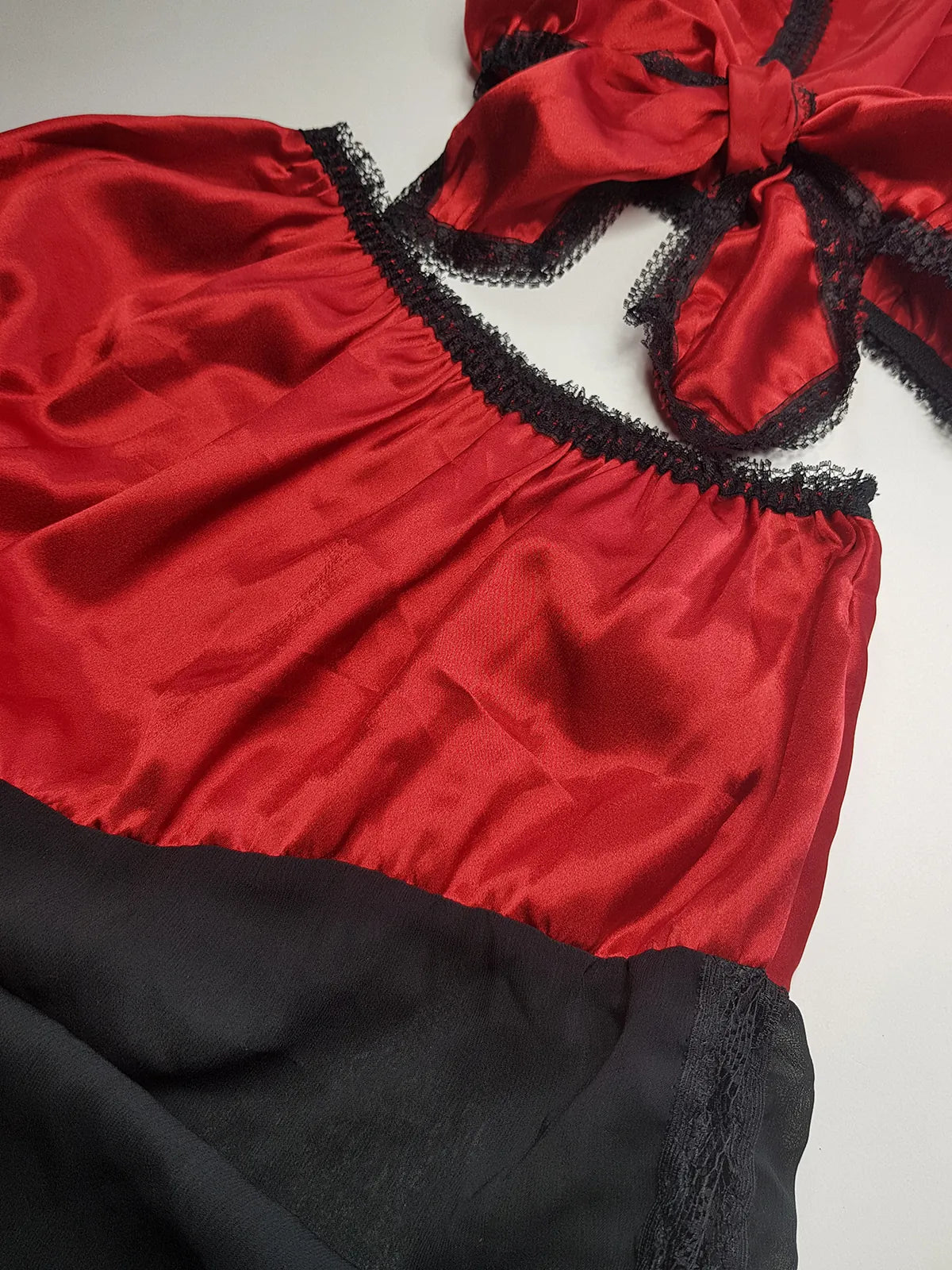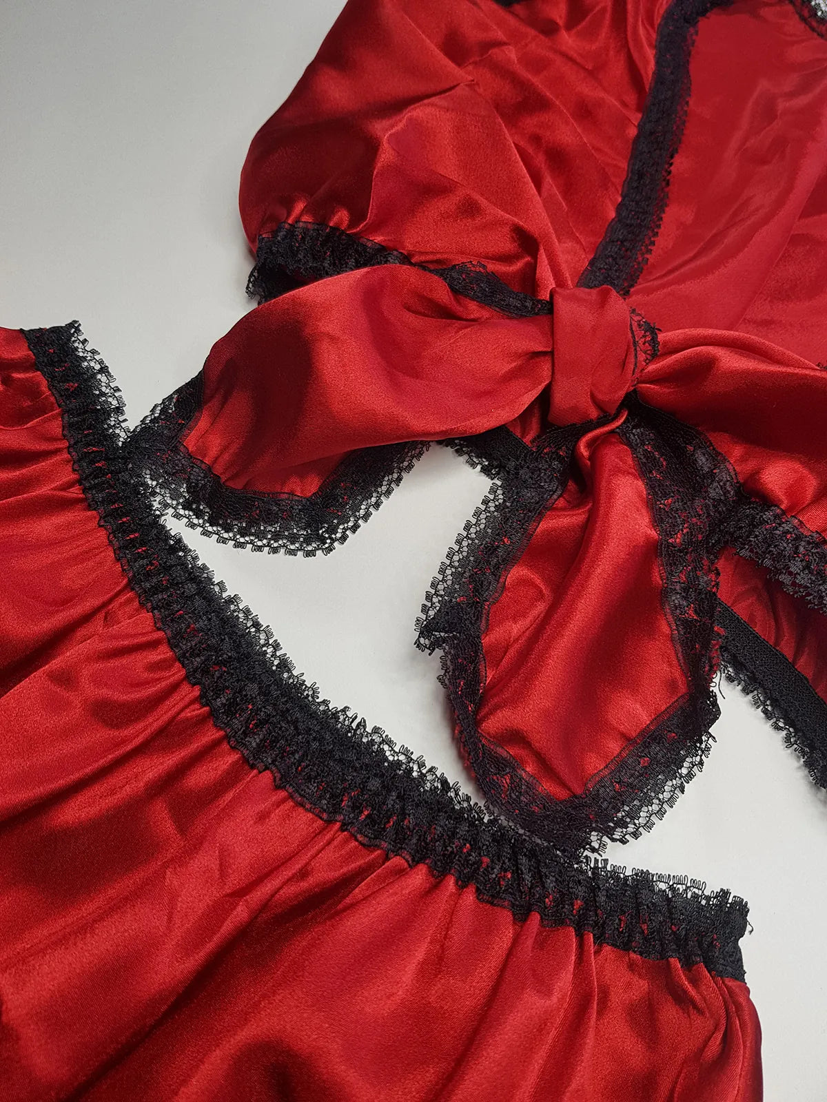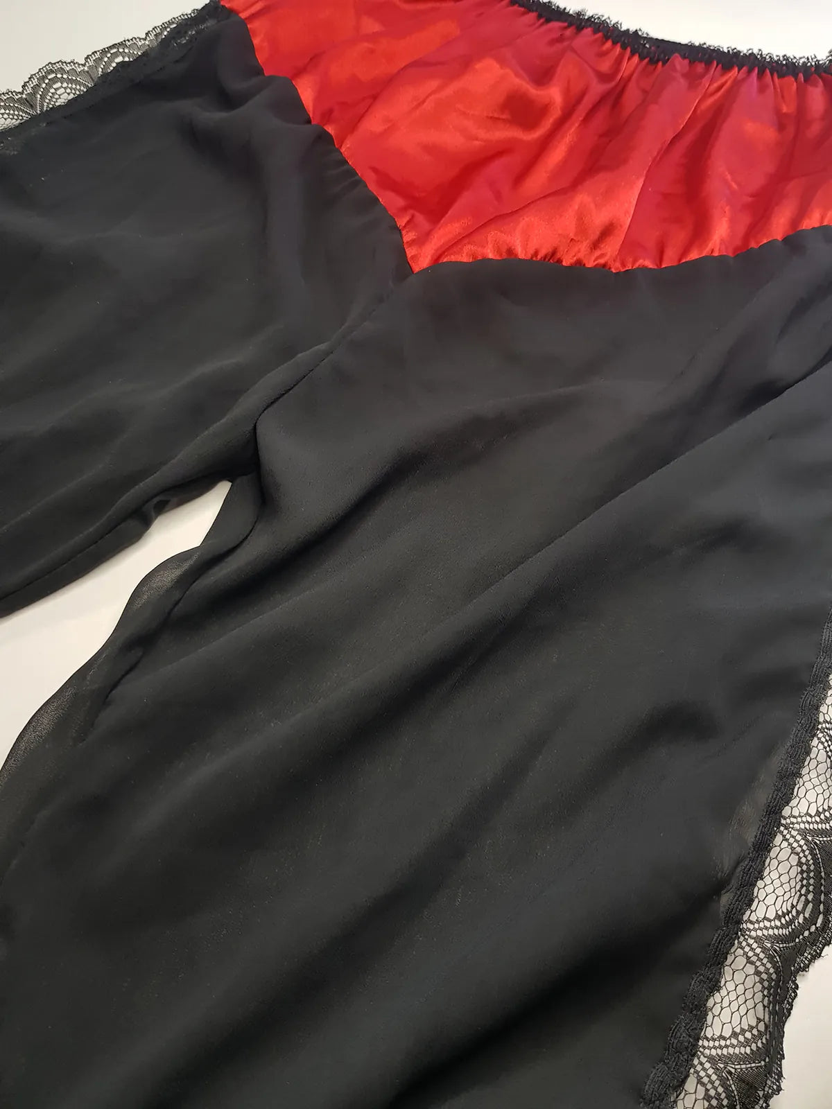Vintage 1980s Arabian Playboy Style Belly Dance Lingerie 3 Piece Set - Rich Ruby Red Satin & Black Lace - Tie Top & Long Slits up the Sides of the Pants - Matching Sheer Lace Face Covering