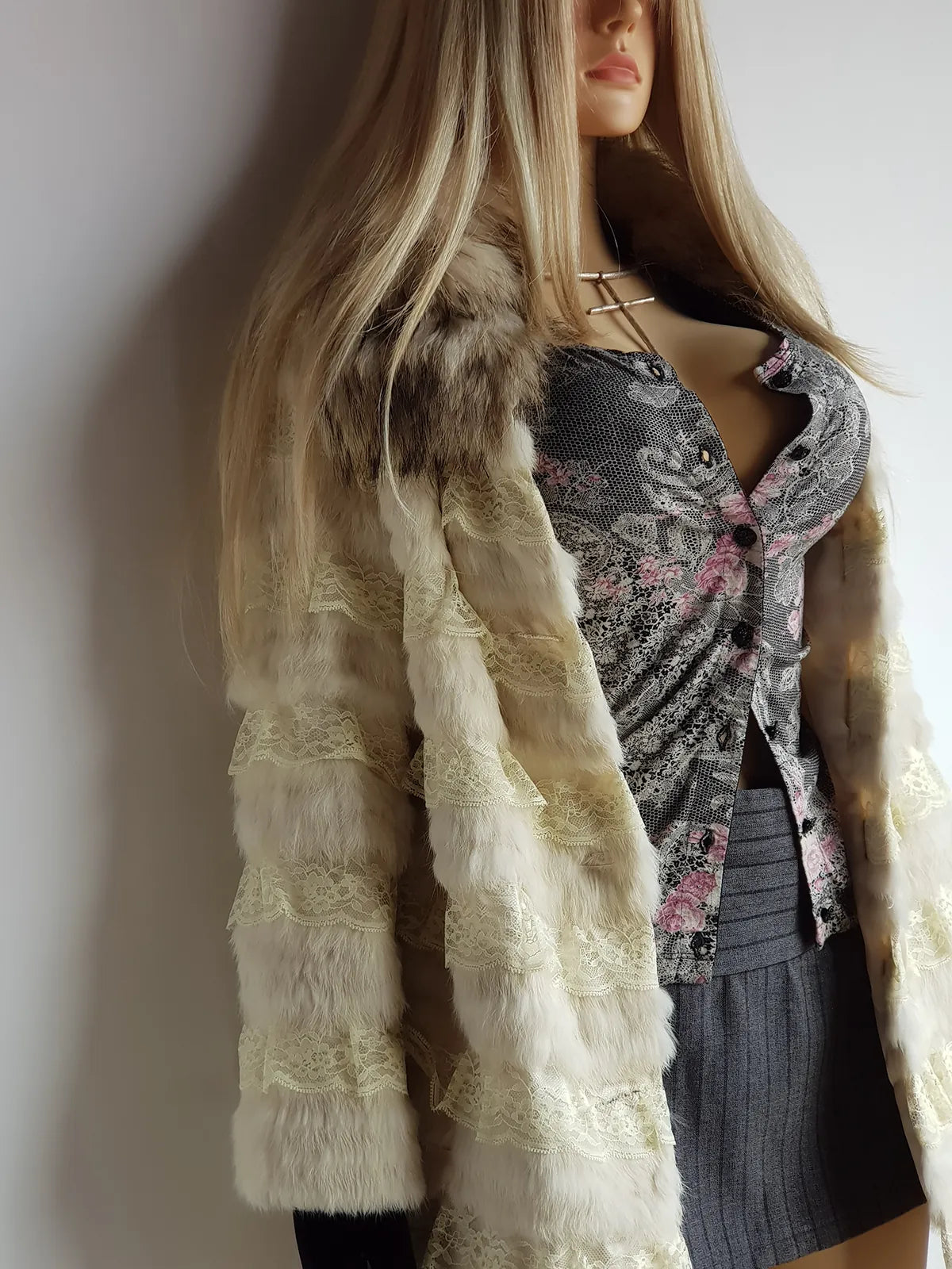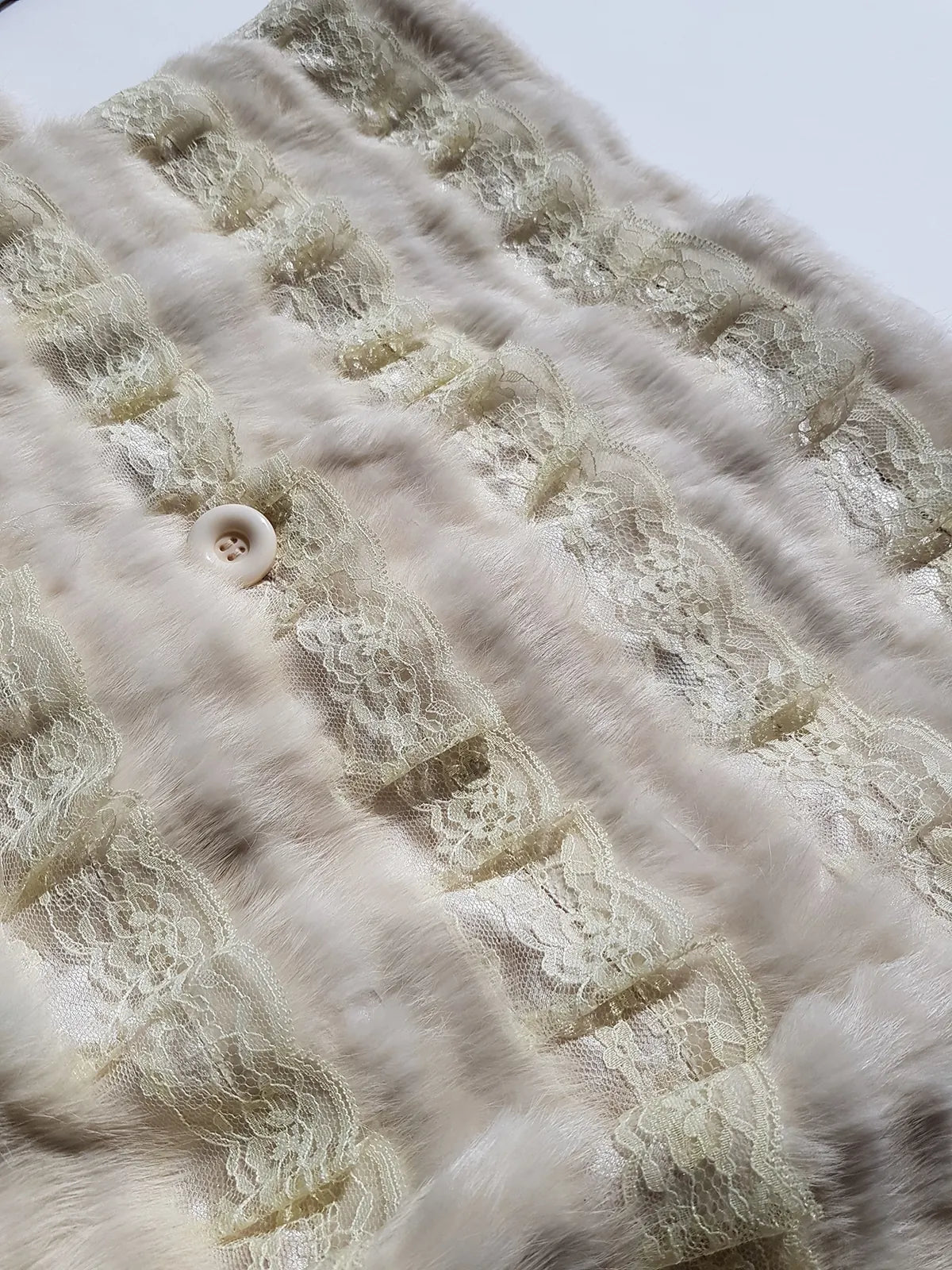 Vintage 90s Fox Fur & Lace Coat with Incredible Fluffy Fox Fur Collar - Fully Lined - Layers of fur & Lace in Cream tones - button front