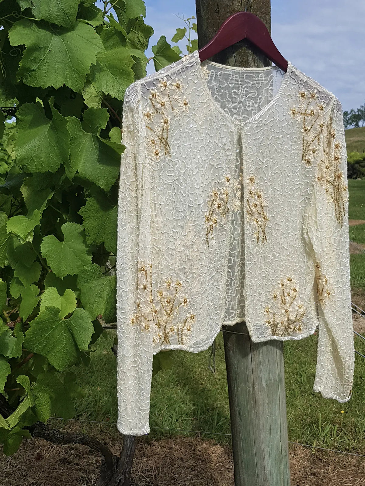 Vintage Ethereal 100% Silk - Bridal Quality Cream & Gold Flowers - Handmade Fully Beaded Jacket