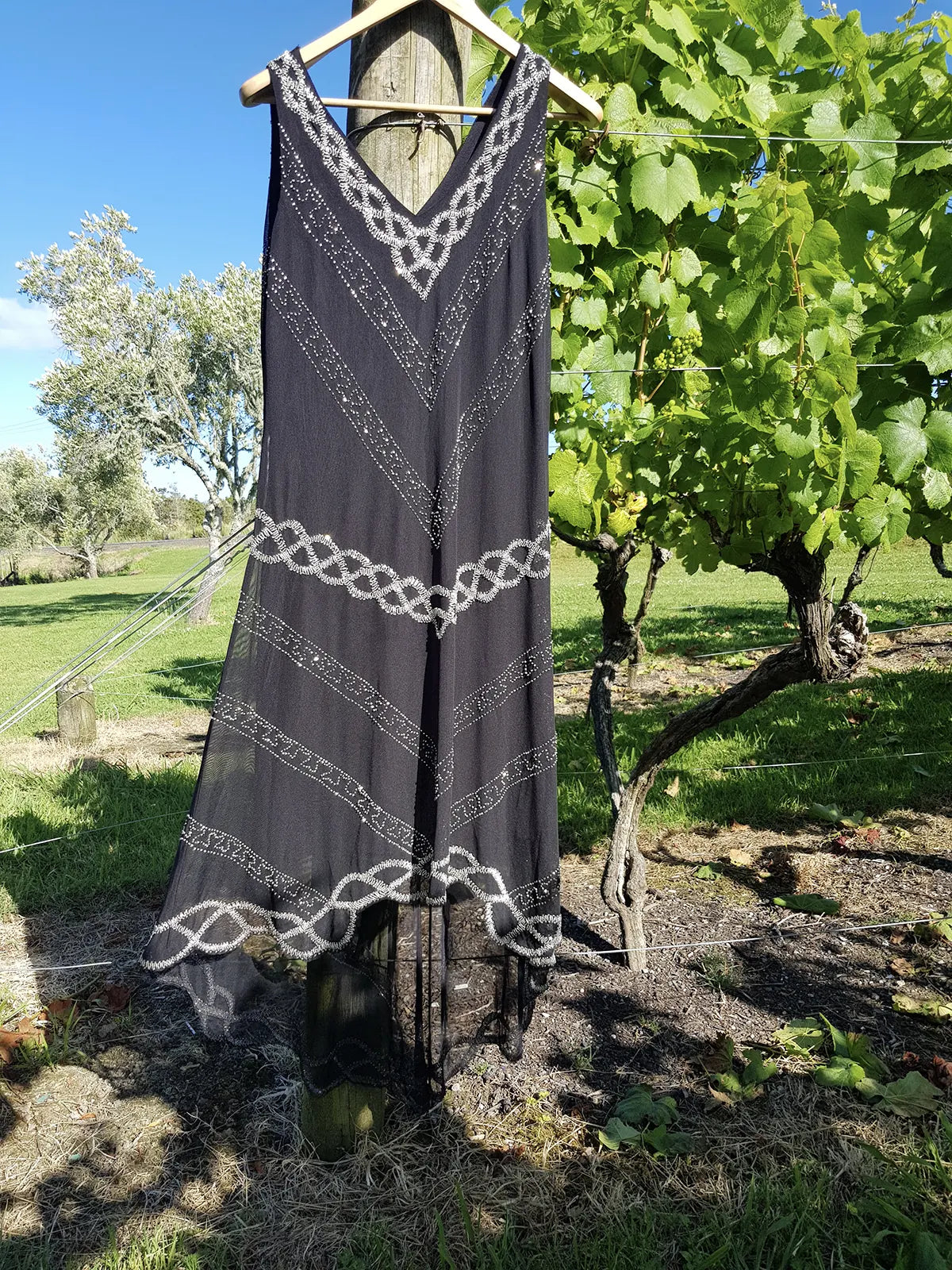 1990s Vintage Hand Beaded High / Low Dress - Fine Slinky Mesh - Scalloped Asymmetrical Hemline