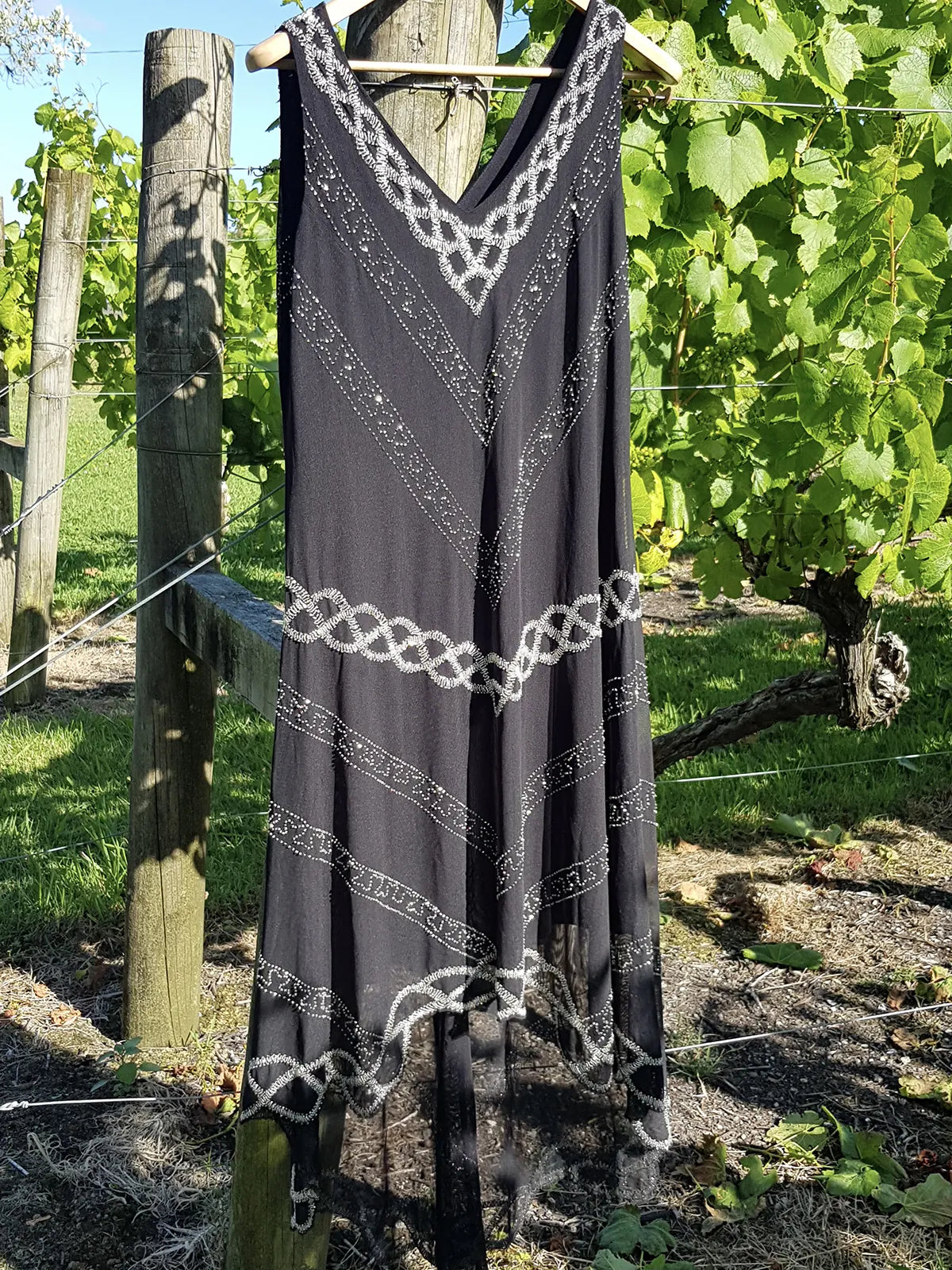 Description - 1990s Vintage Hand Beaded High / Low Dress - Fine Slinky Mesh - Scalloped Asymmetrical Hemline