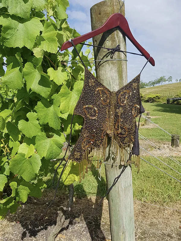 Absolute Knockout Vintage Fully Beaded Butterfly Top - Beaded Tassels with Coins - String Ties