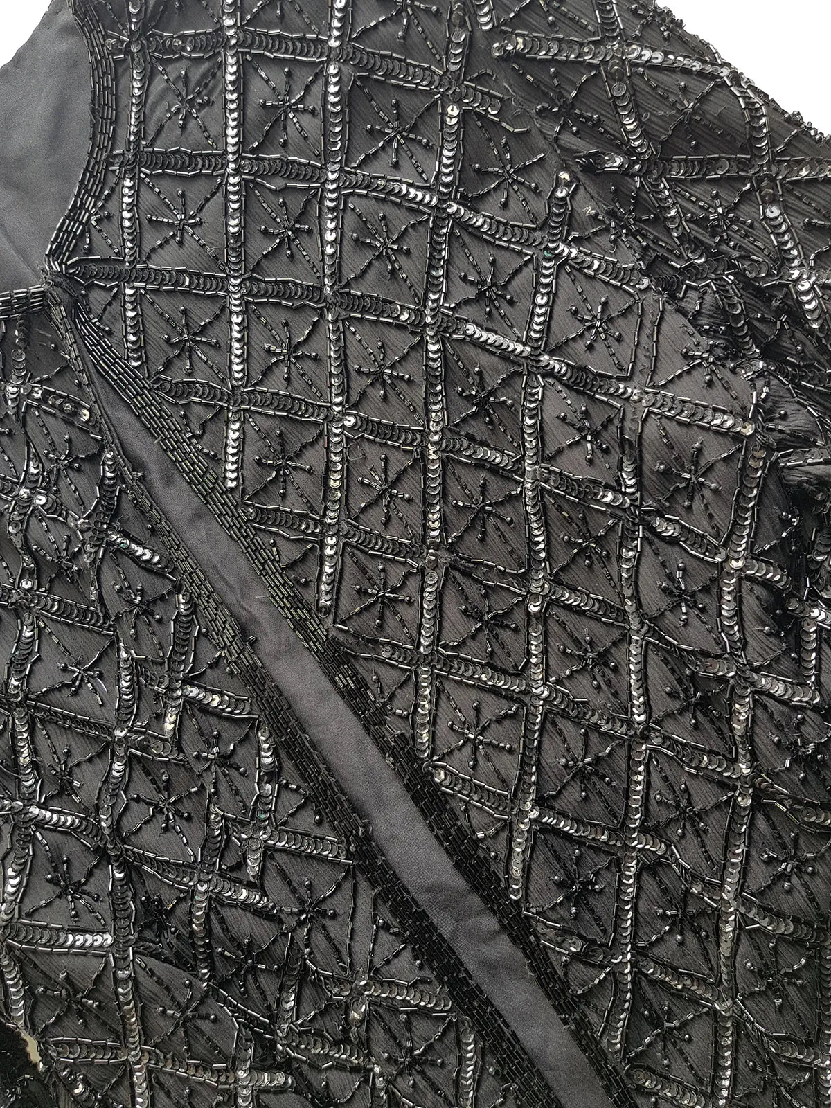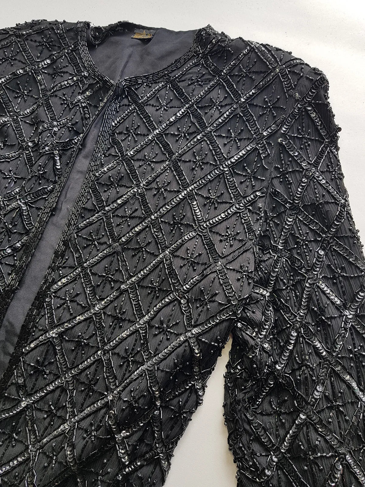 Vintage Silk Spectacular Sparkling Diamond Pattern Heavily Beaded Jacket in Black - Immaculate - Hand Beaded - Bridal Quality