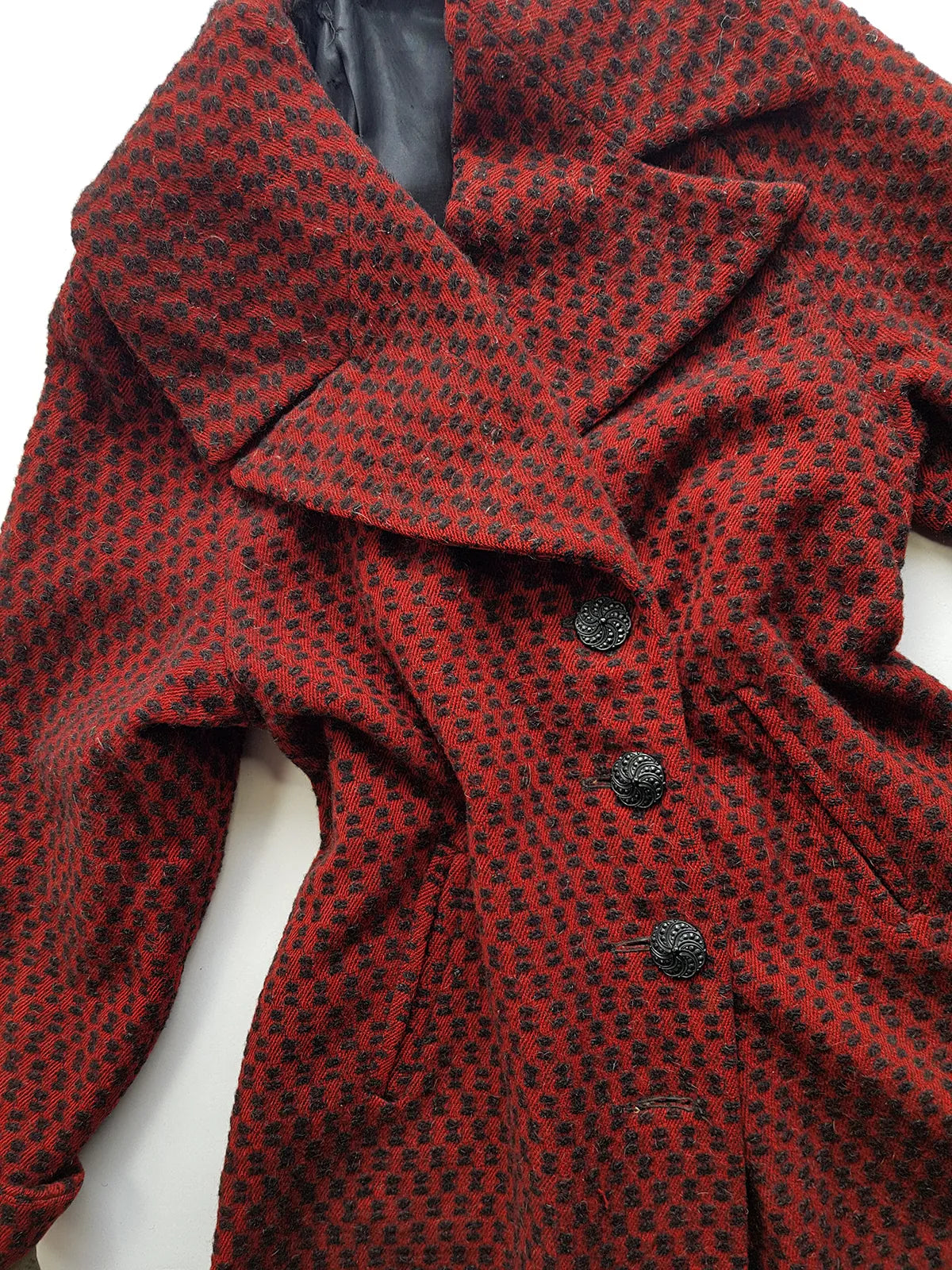 1950s Vintage Wool Princess Hourglass Coat in Incredible Deep Red & Black - Ornate Buttons - Knee Length - Immaculate Tailoring