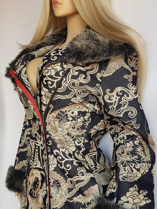 Rare 90s Kenzo France Dragon Denim Coat with Japanese Asian prints in 100% cotton - Made in Italy - Vegan Fur Collar - Fully Lined- Zip Front Closure - Dark Denim Blue with Taupe Gold Prints - Worn by Celebrities