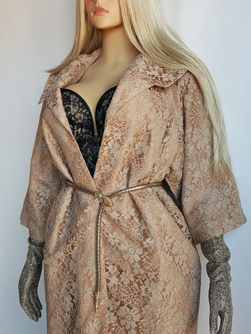 1950s Authentic Vintage Dramatic Floor Length Lace Coat - Ultimate Burlesque Piece - Hand Dyed in Perfect Shocking Pink - Button Collar and Open Front - Floral Print Lace - Immaculate