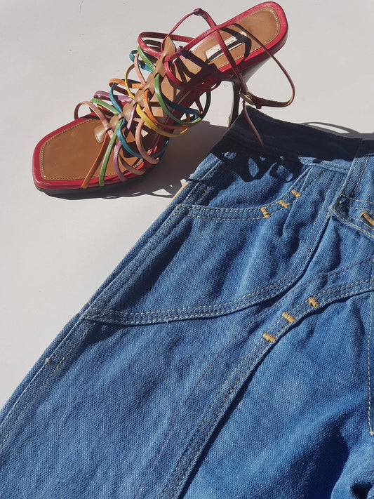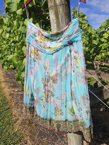 Vintage Designer Rene Derhy 2000s impressionist watercolour fairy dream skirt in blues pinks & crinkle fabric with ornate hemline