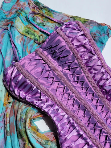 Knockout 1990s Corset Top from the legendary Fredericks of Hollywood - fully boned in satin - rich plum with black lace and blue bow - laced back